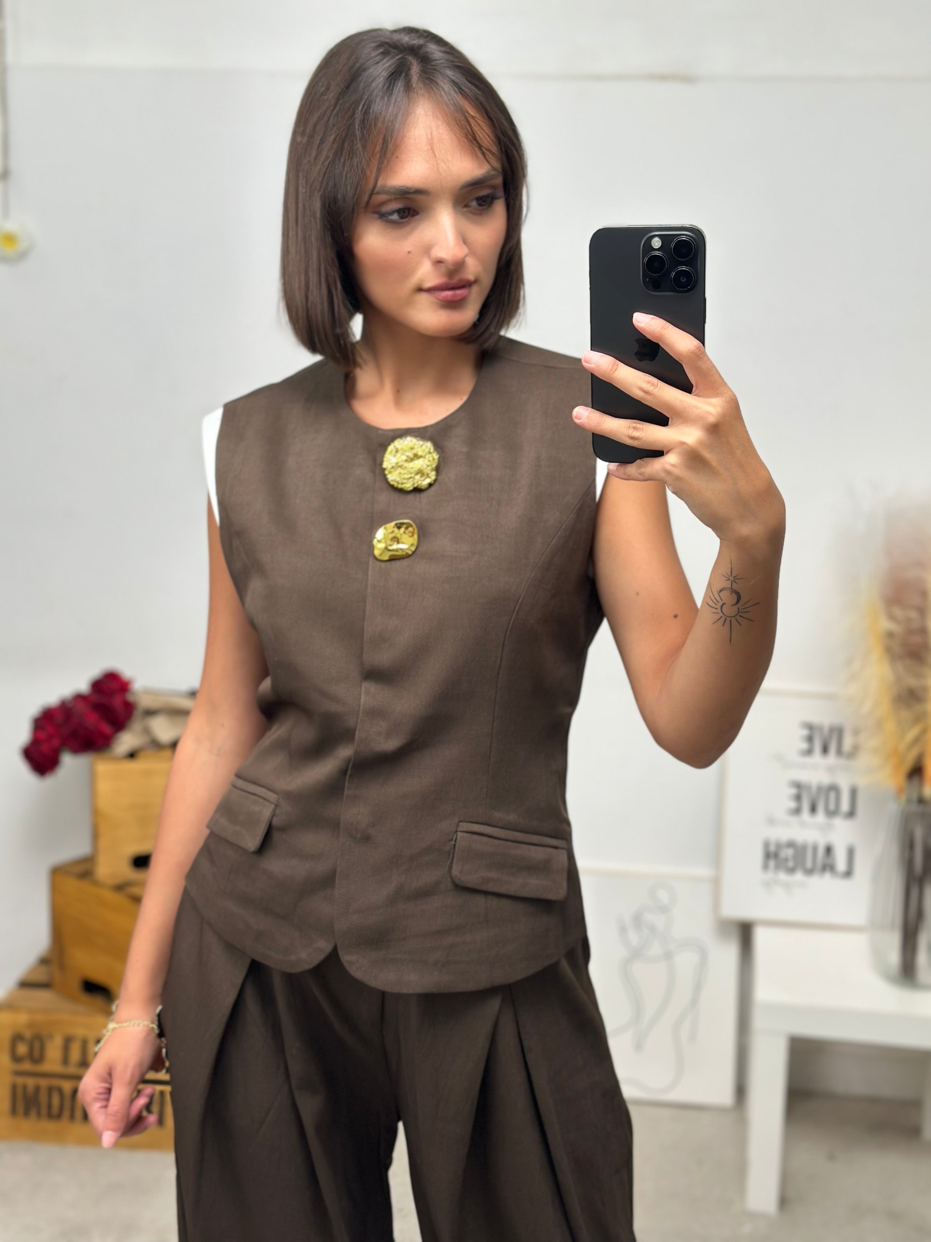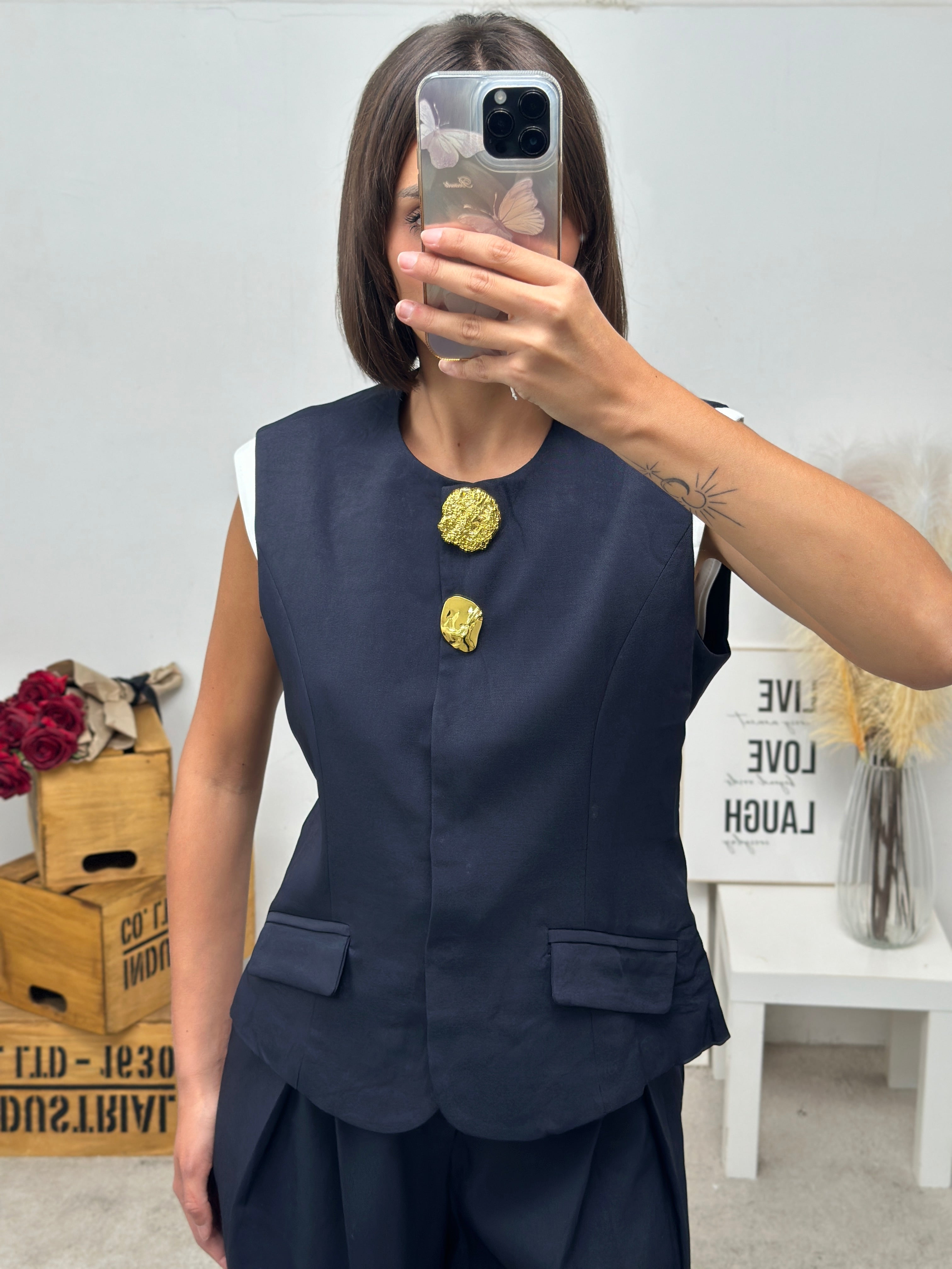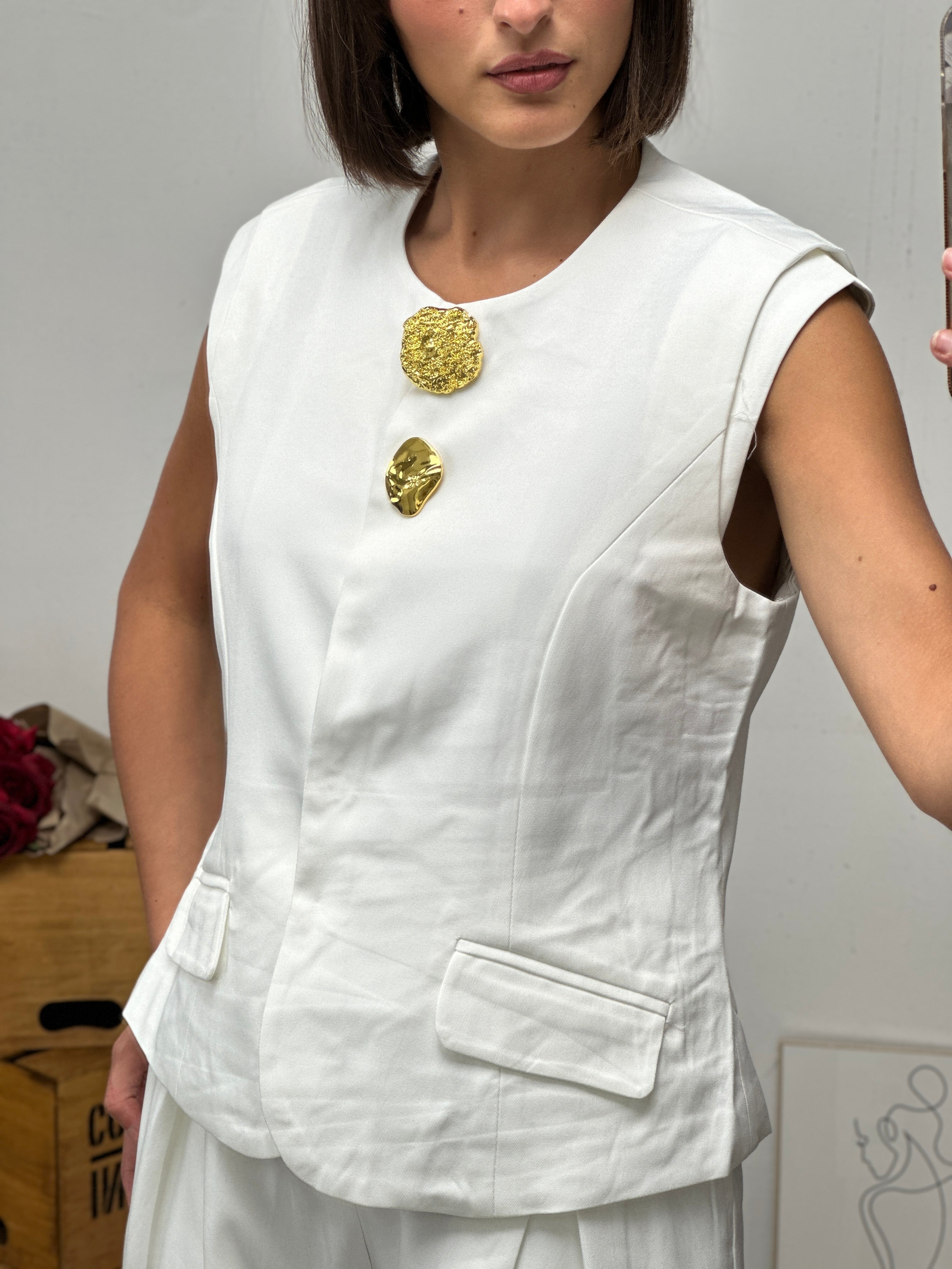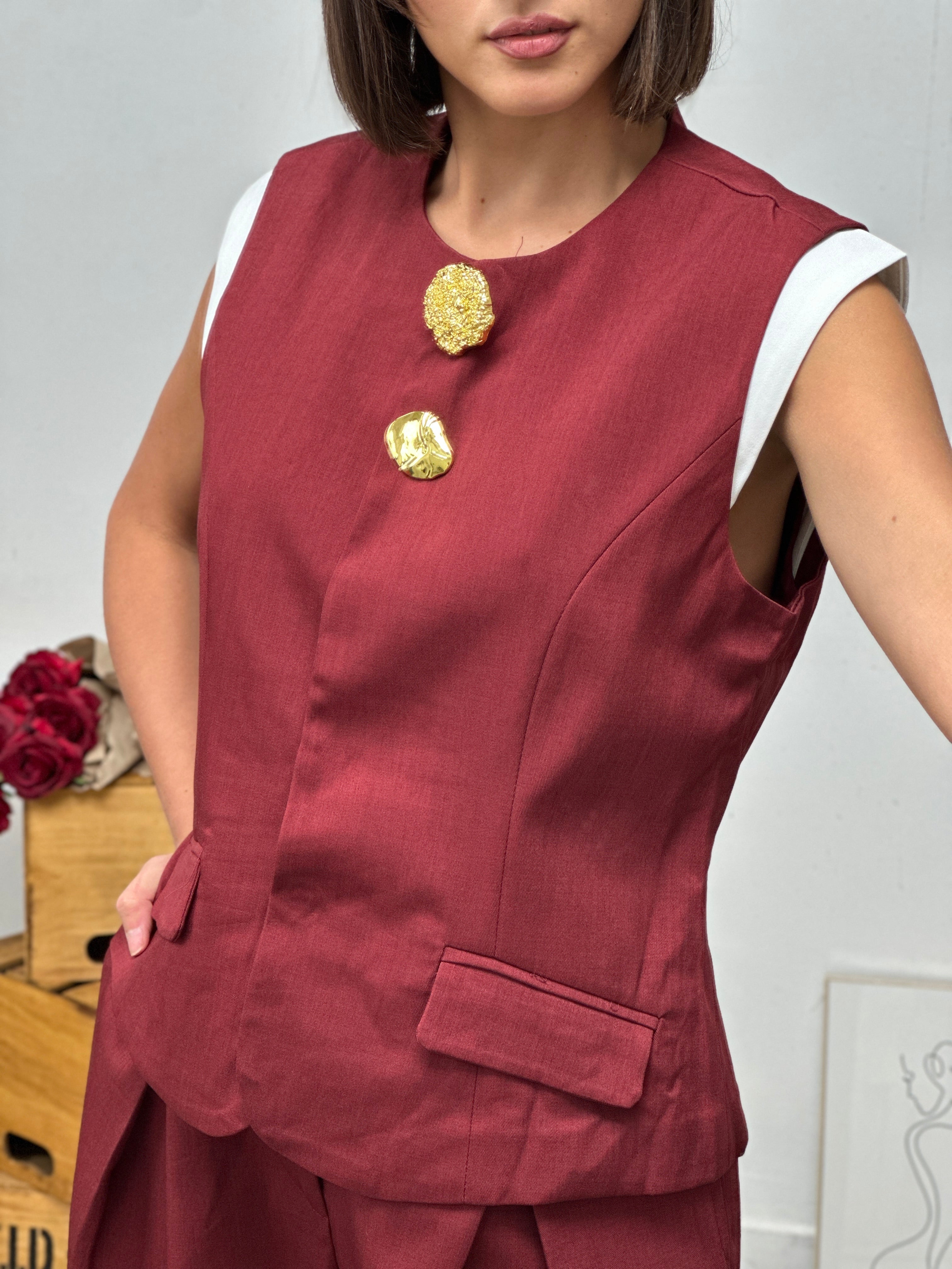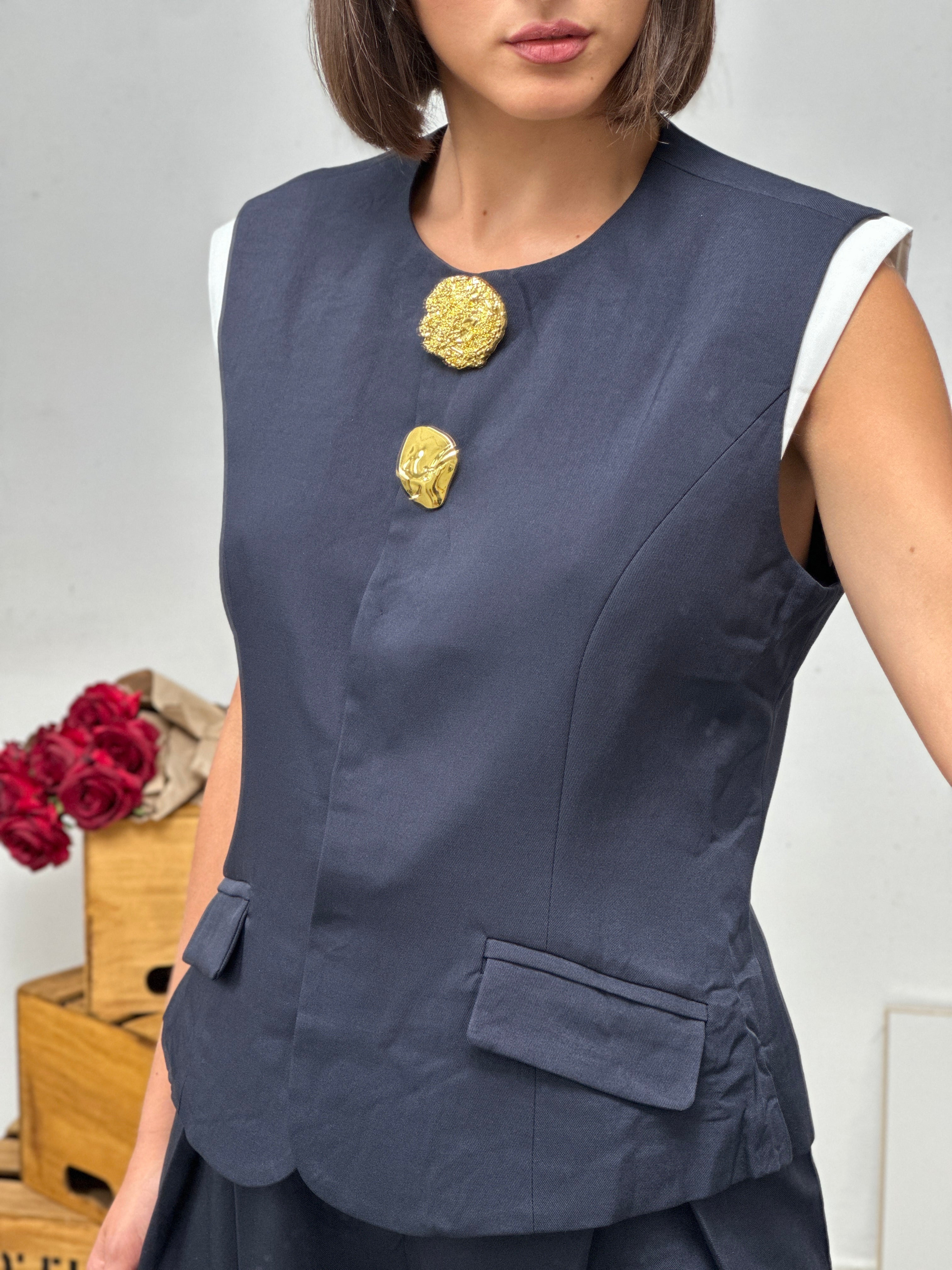 gilet smanicato, arricchito da decorazioni oro sulla chiusura