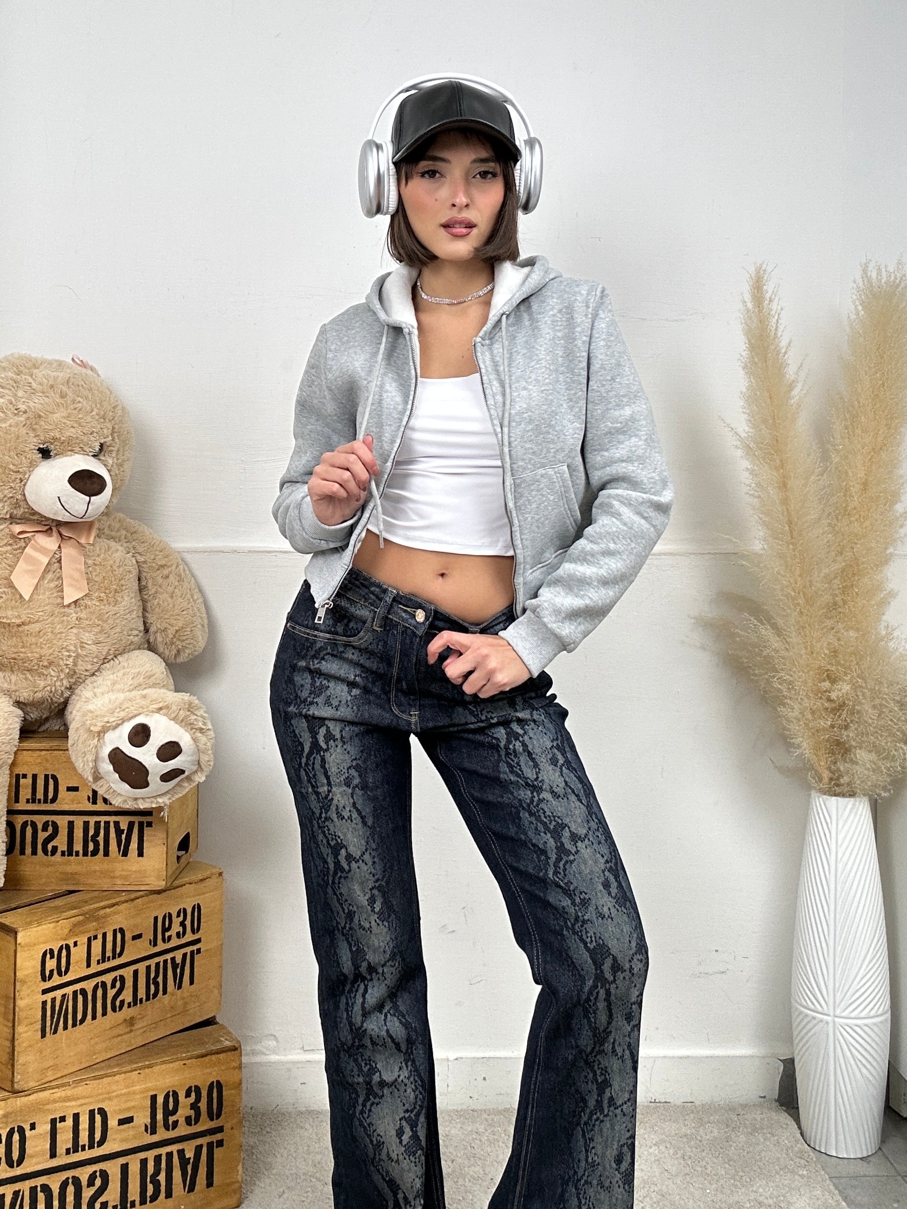 Felpa GREY corta con cappello, chiusura con zip, presenta due tasche laterali
