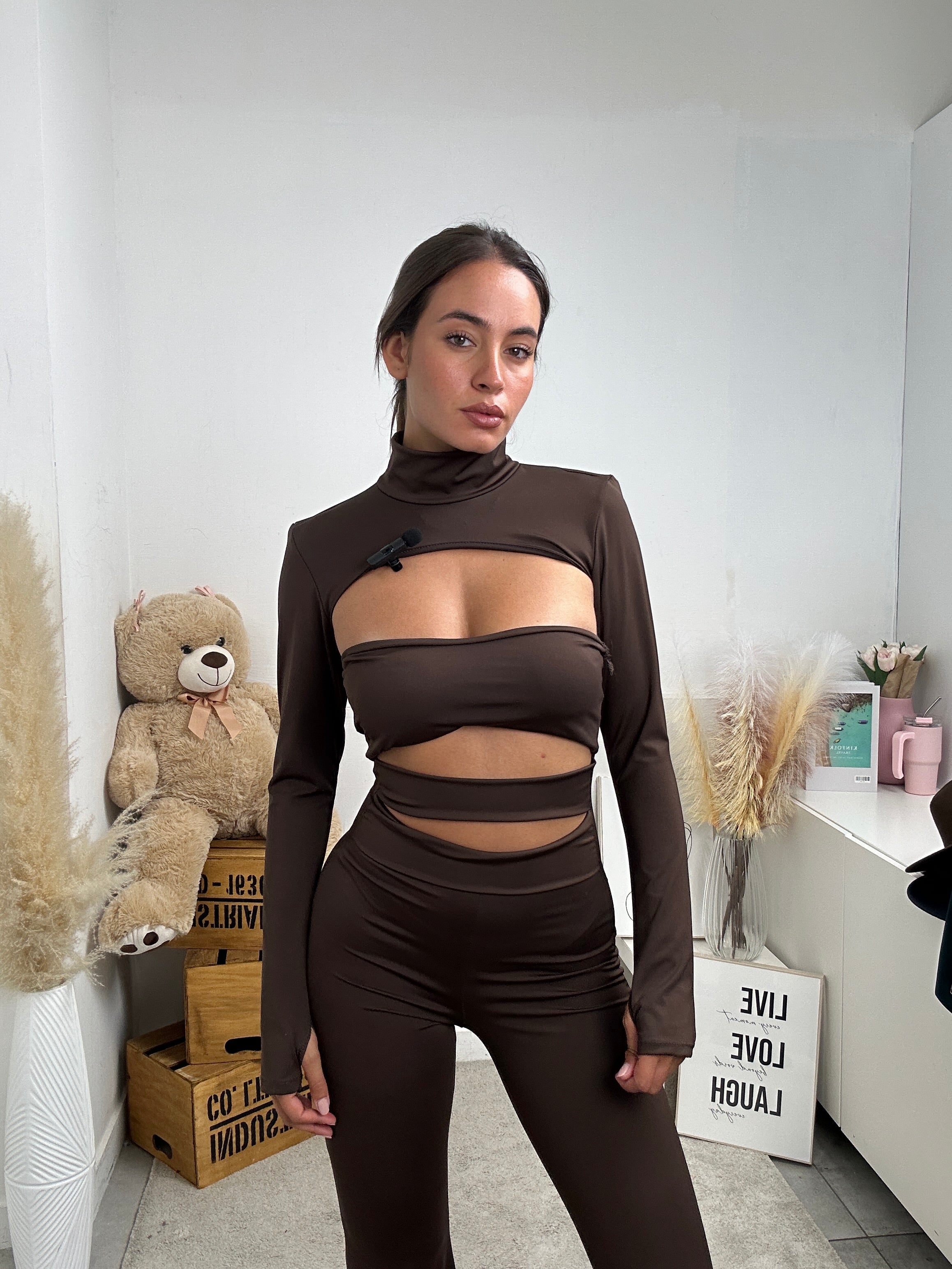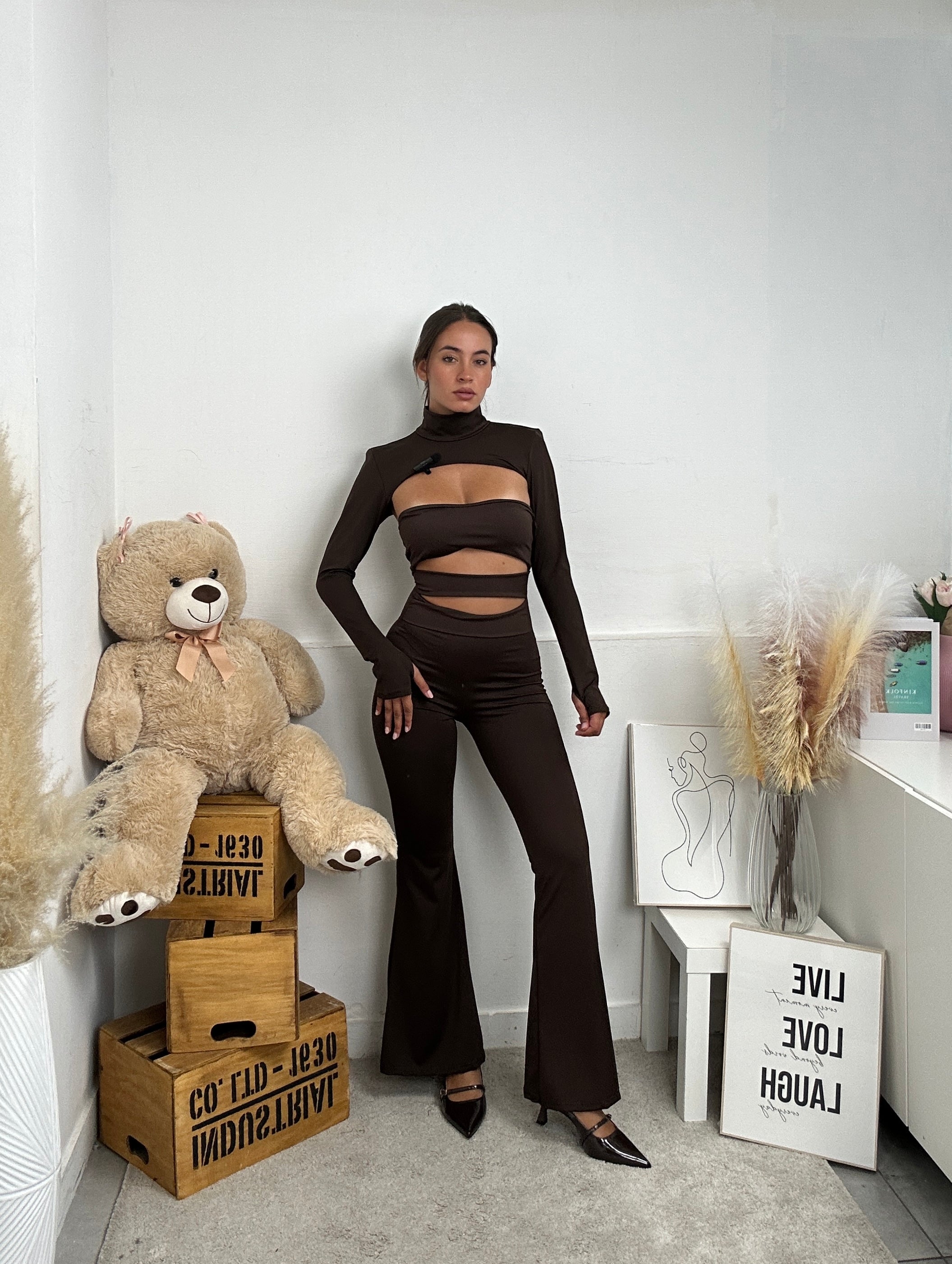 Jumpsuite perfect a zampa, con scollo dritto e coprispalle a maniche lunghe.