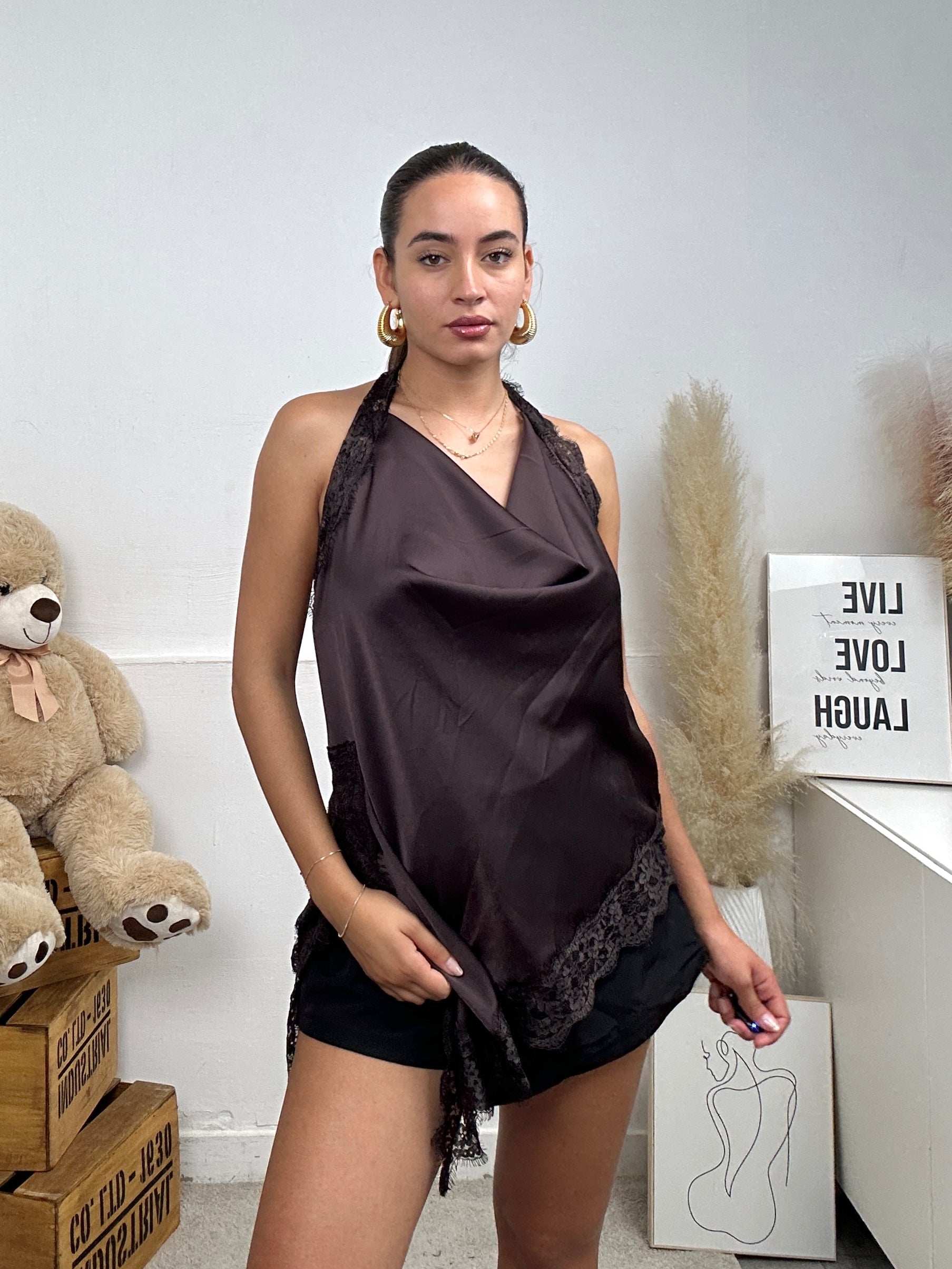 Top in raso con richiamo in pizzo, con schiena scoperta