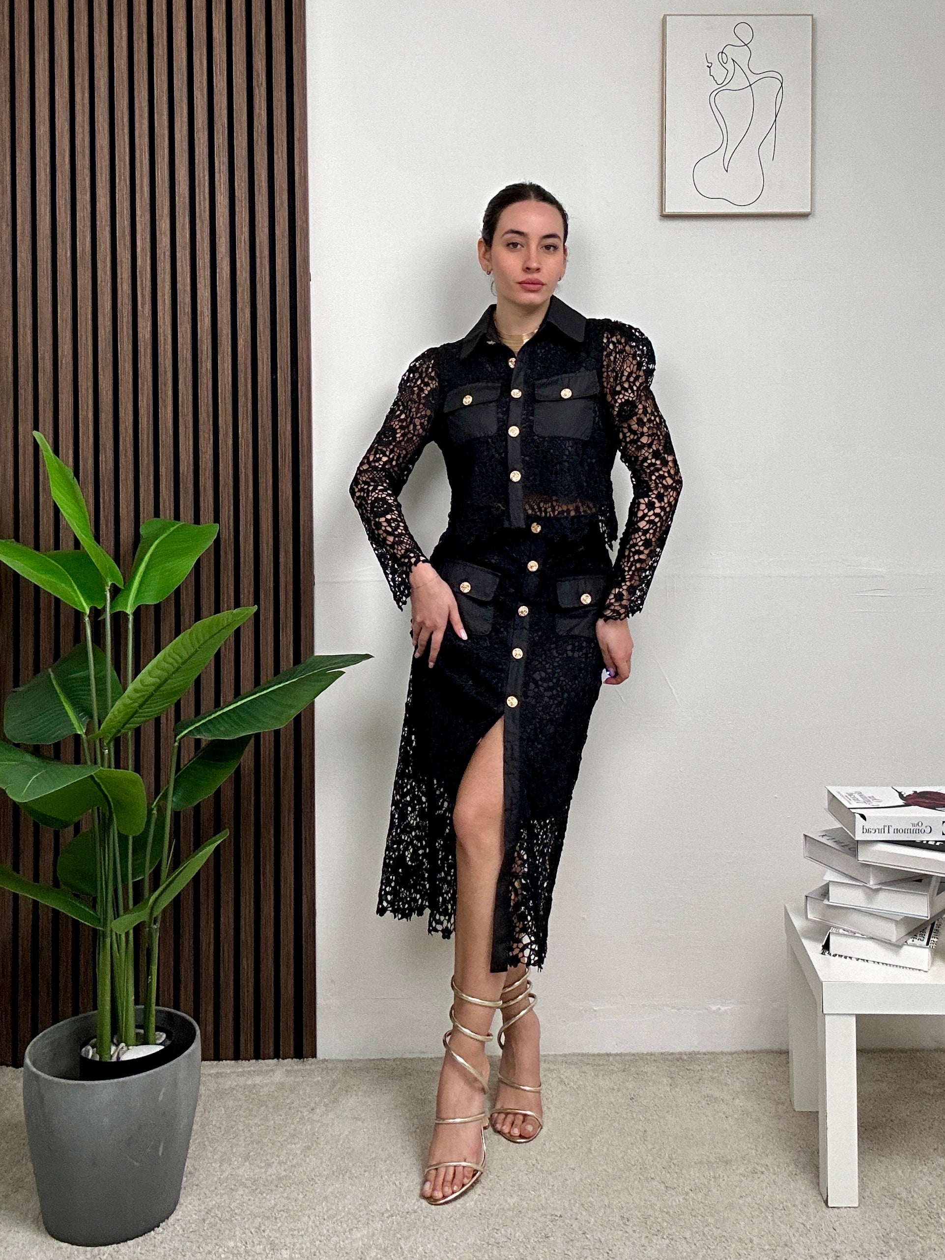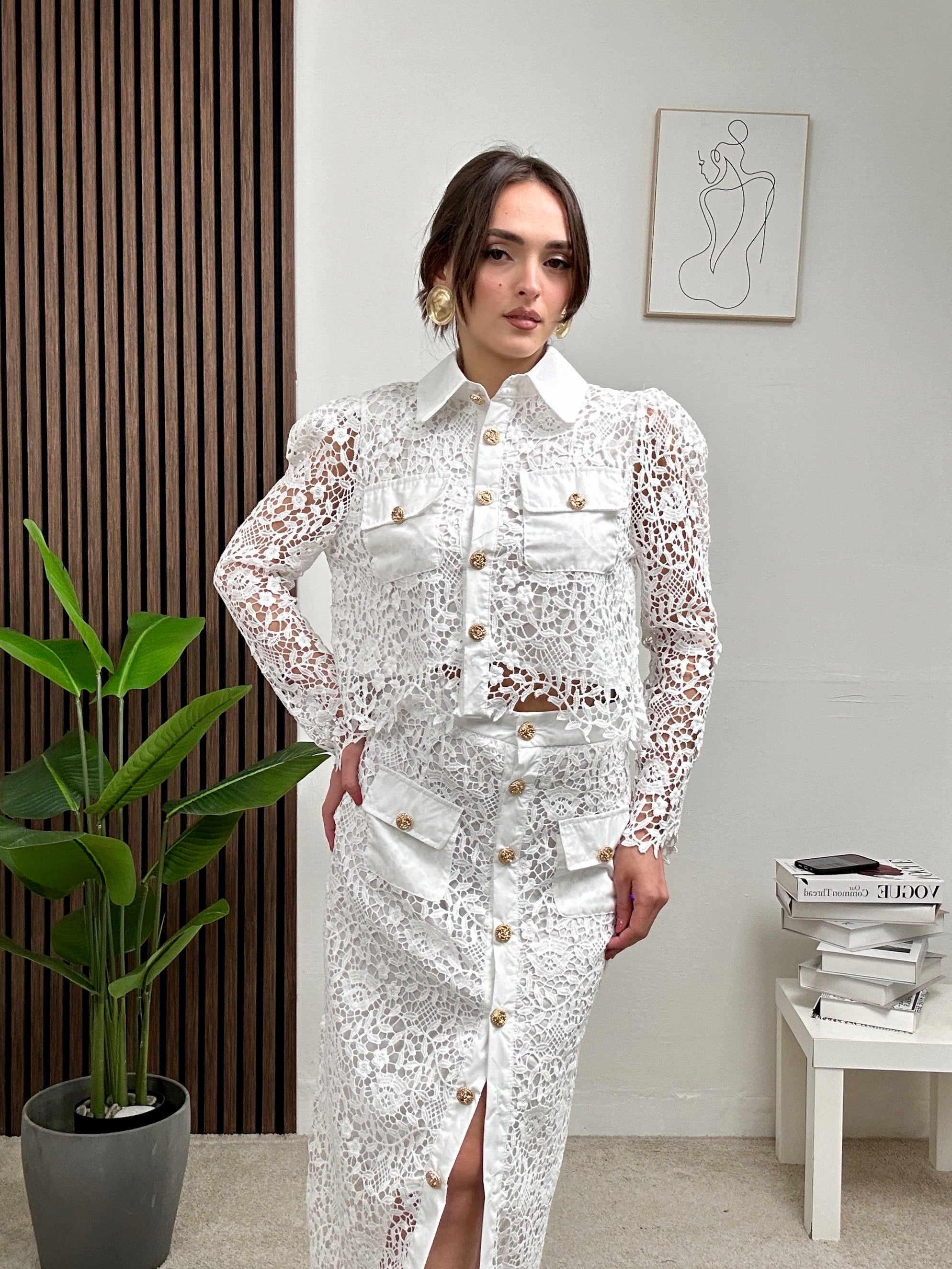 Coordinato BLANCO, presenta gonna lunga elasticizzata con ricamo in pizzo, spacco frontale e con chiusura con bottoni frontali e maglia sopra a maniche lunghe con colletto e chiusura con bottoni frontali.