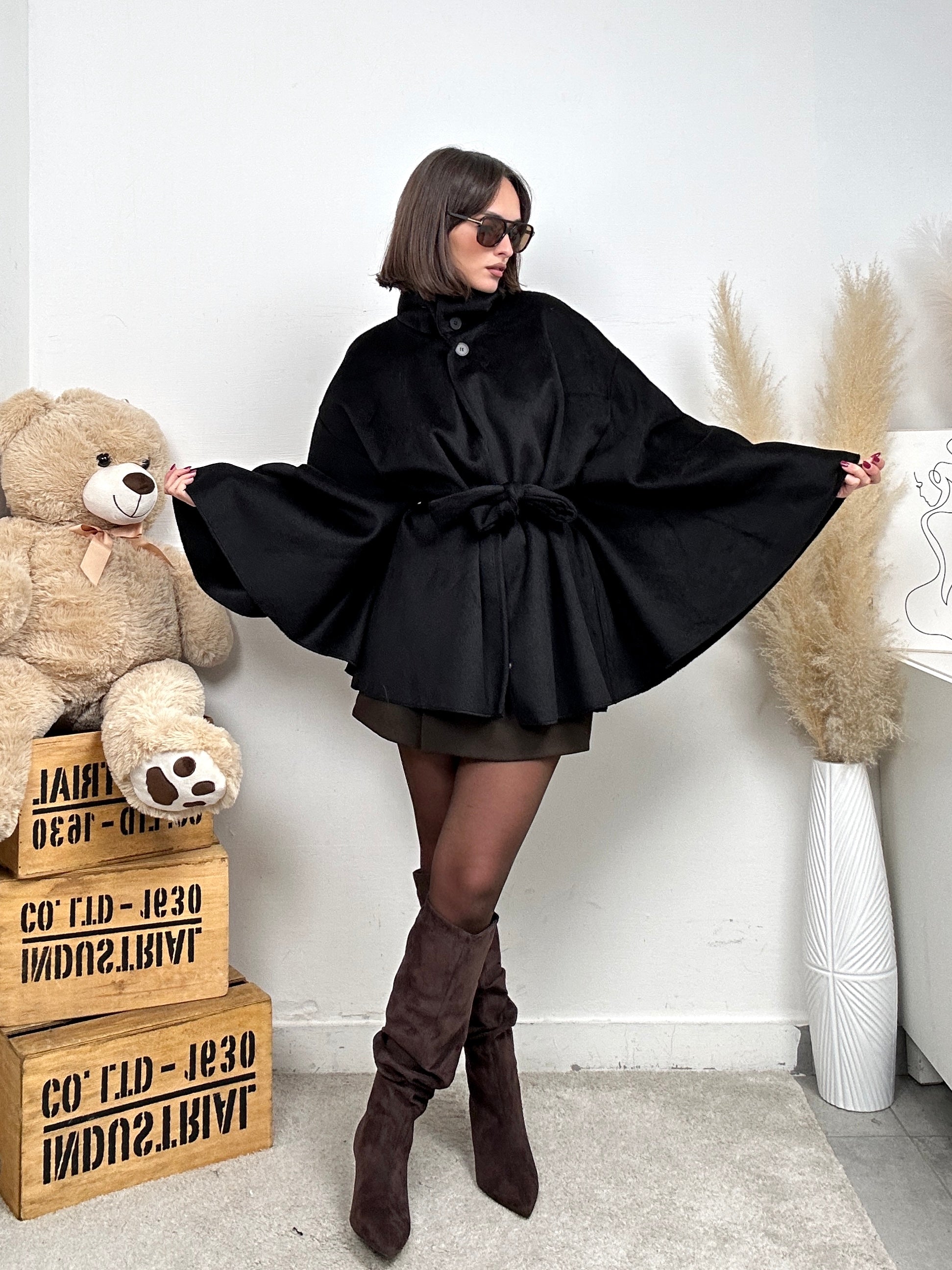 Cappotto MARIPOSA, lungo e oversize con maniche larghe a farfalla, a collo alto con chiusura con bottoni e fiocco in vita.