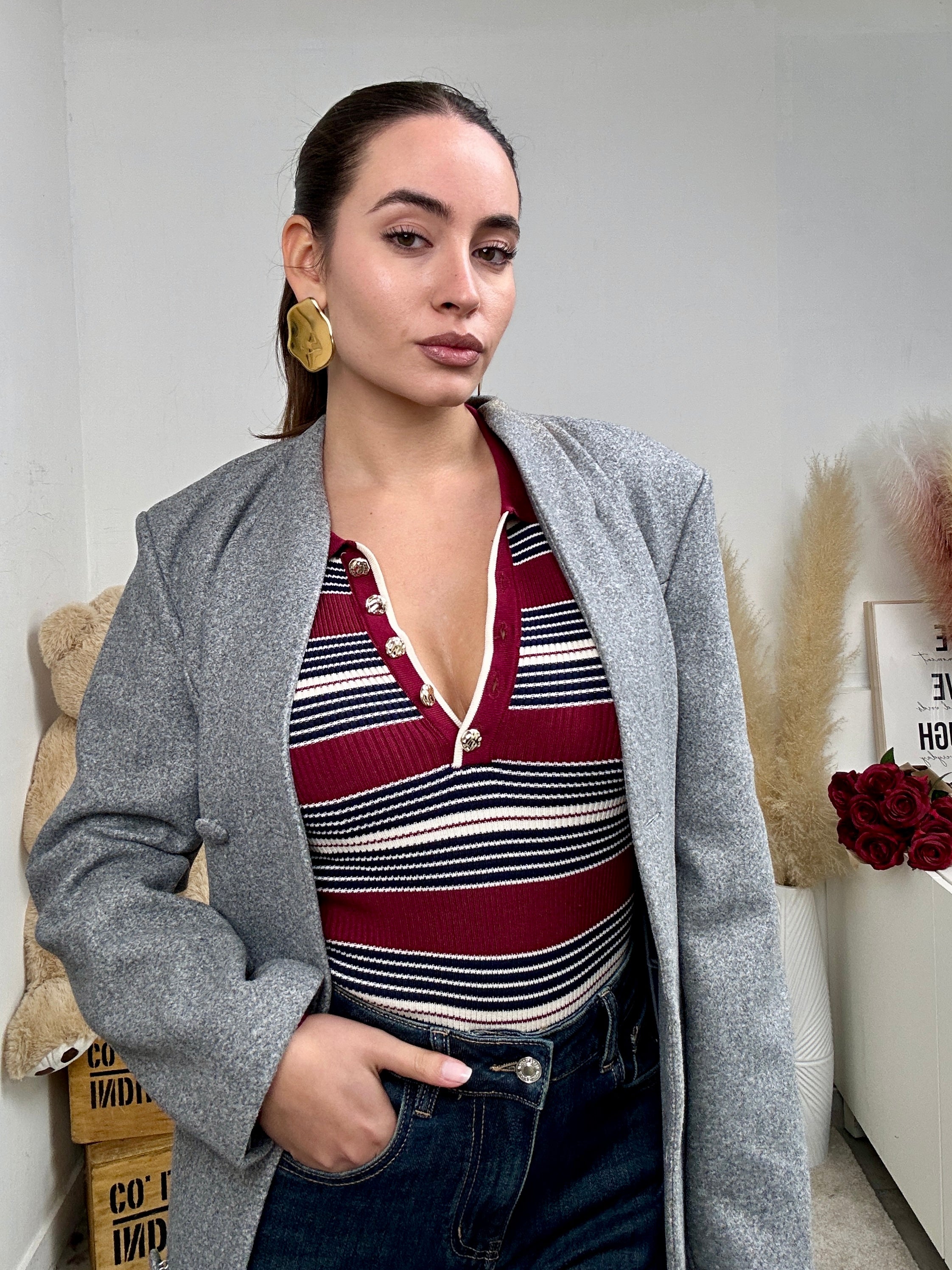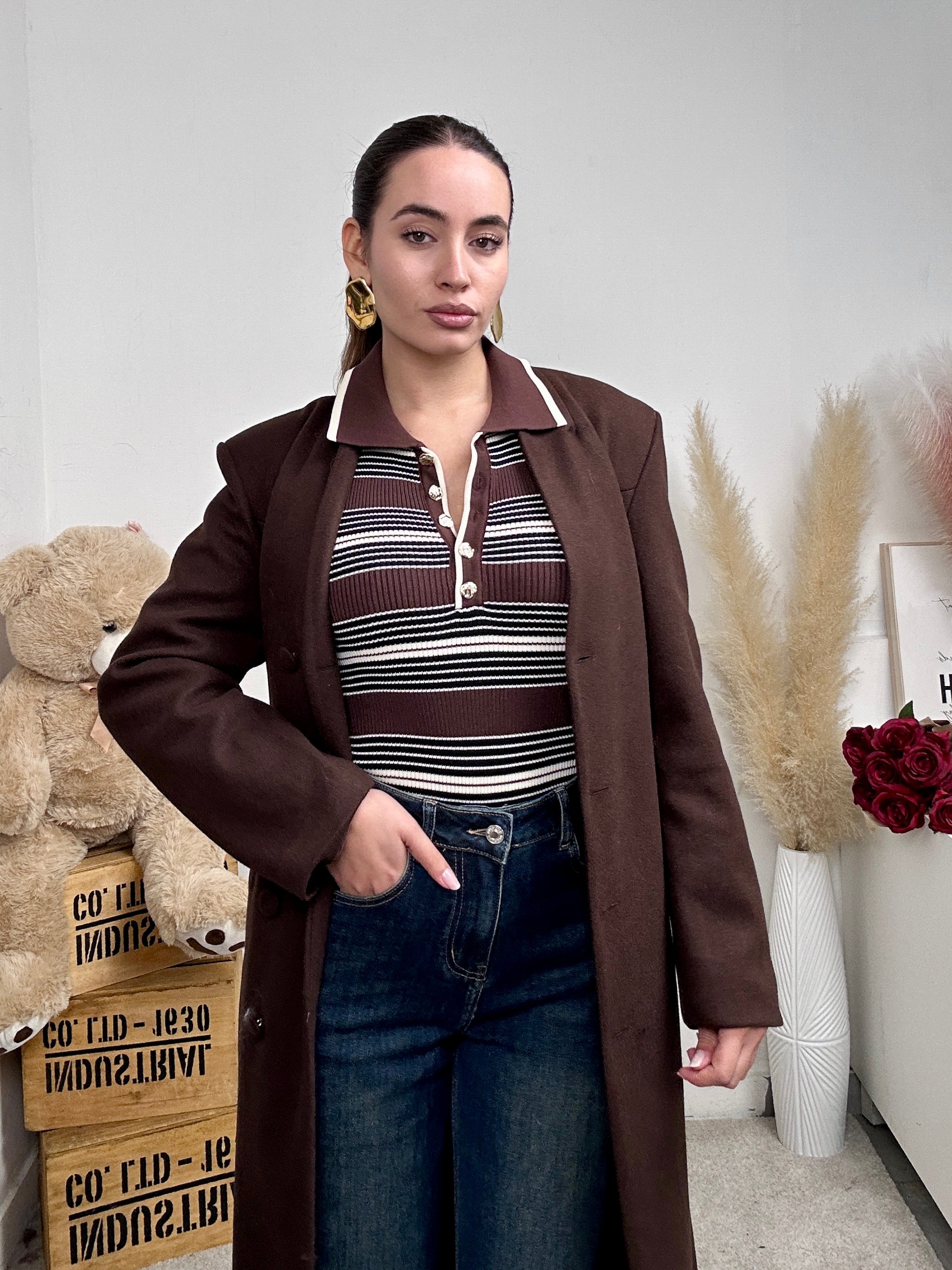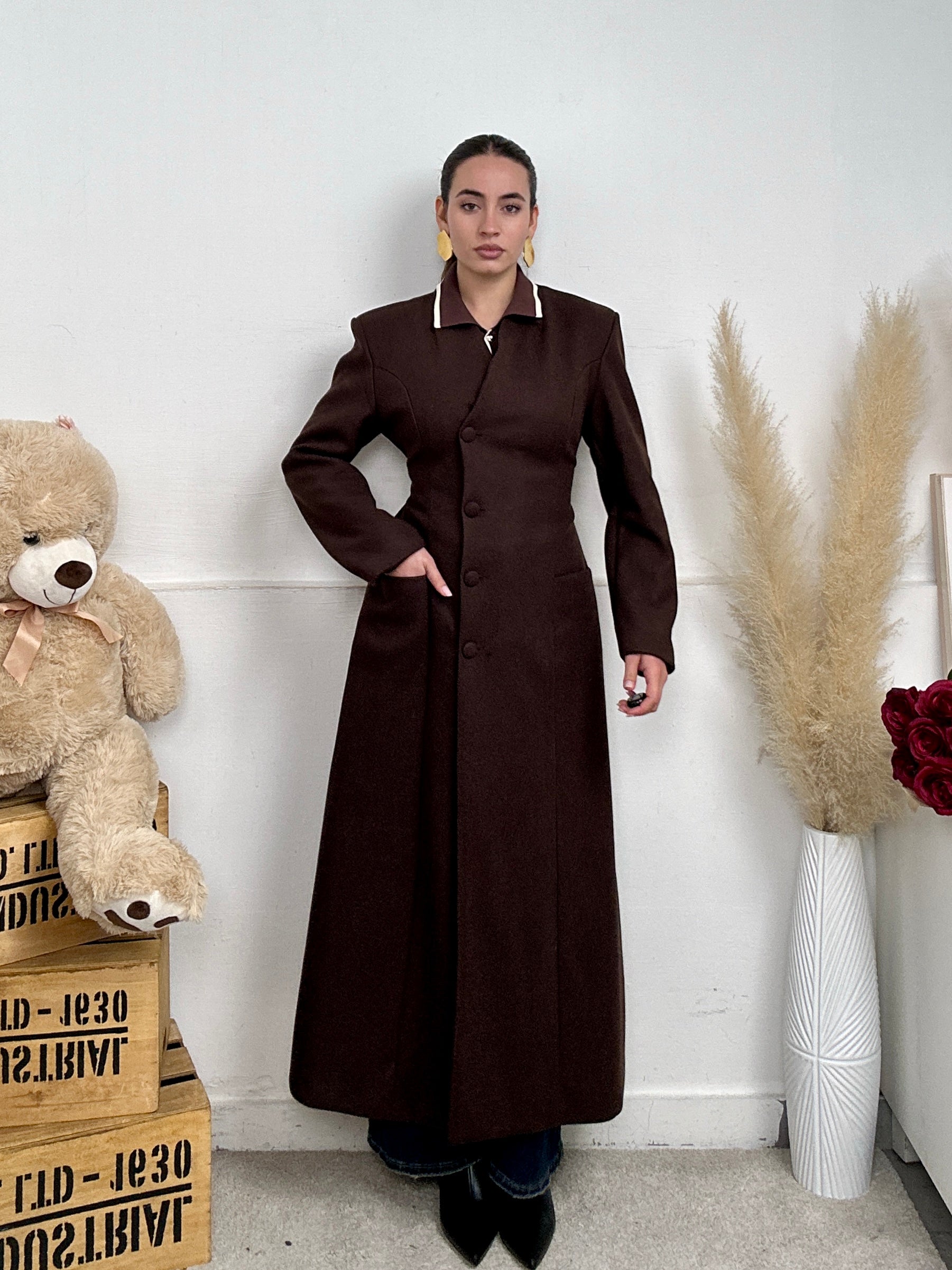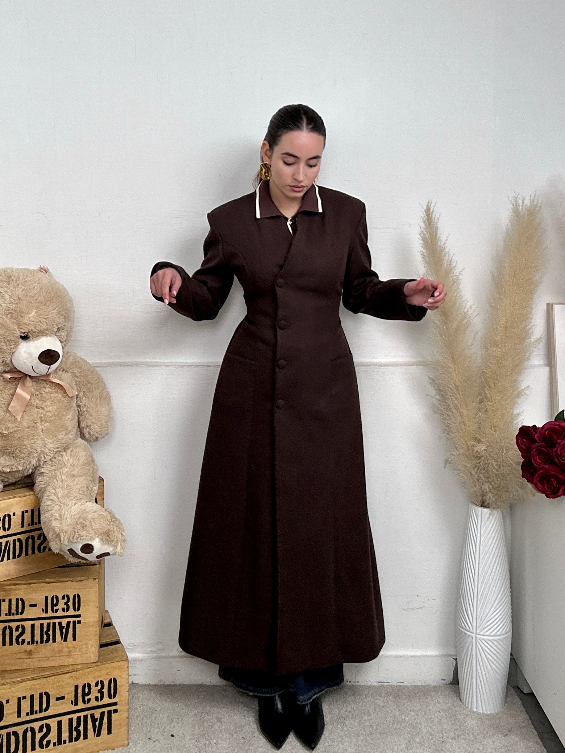 Cappotto LUNGO, a maniche lunghe, con fodera all'interno, con imbottitura sulle spalle, chiusura con bottoni frontali, presenta fiocco dietro, scollo a V e colletto.