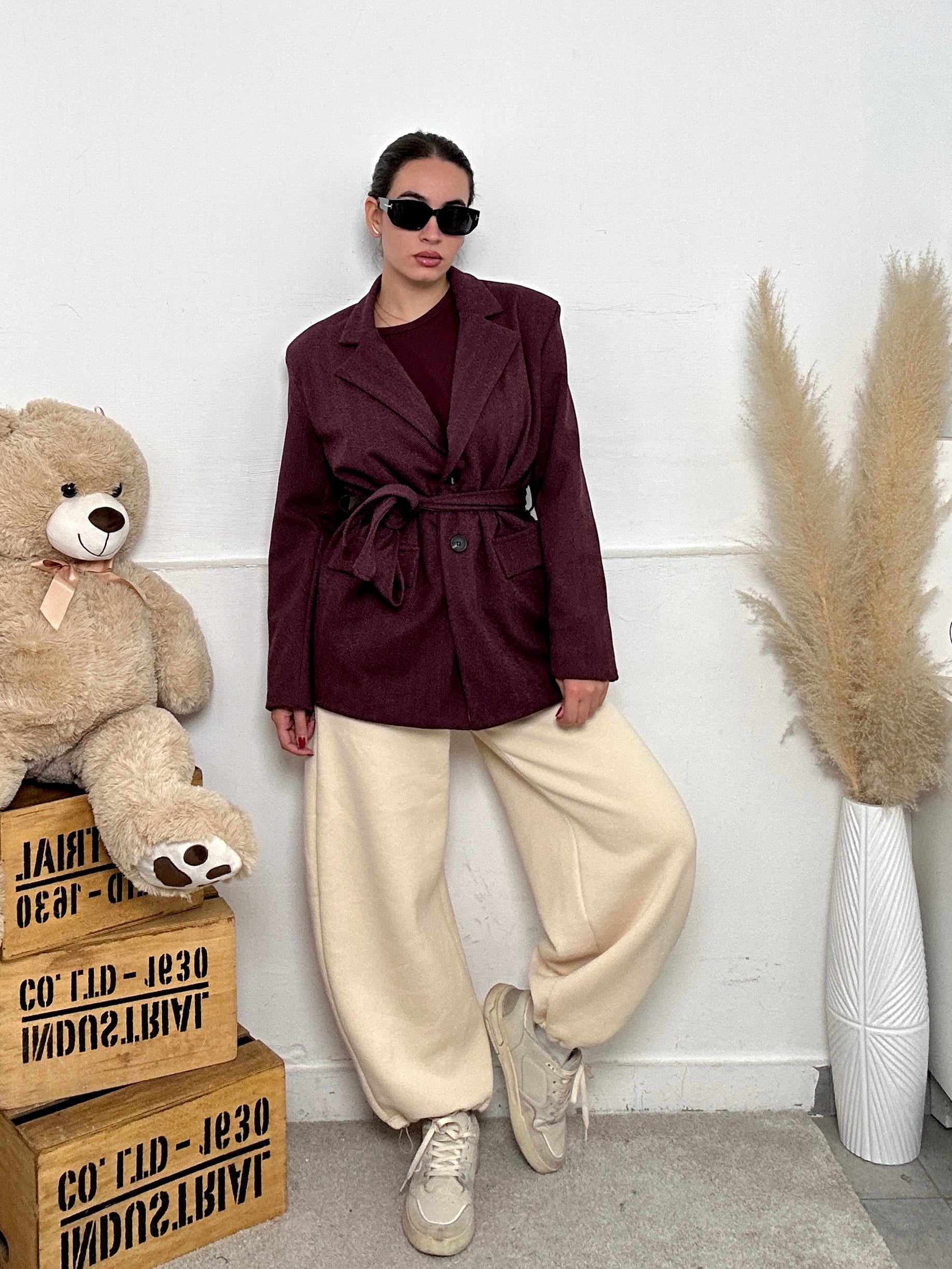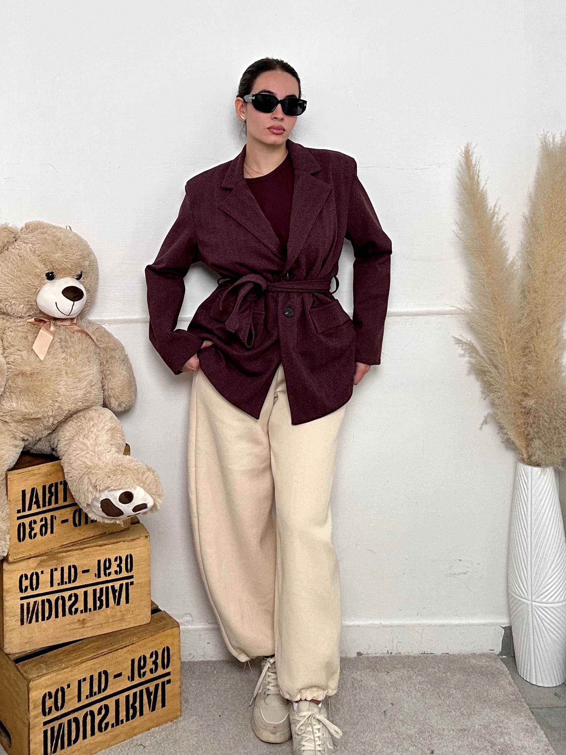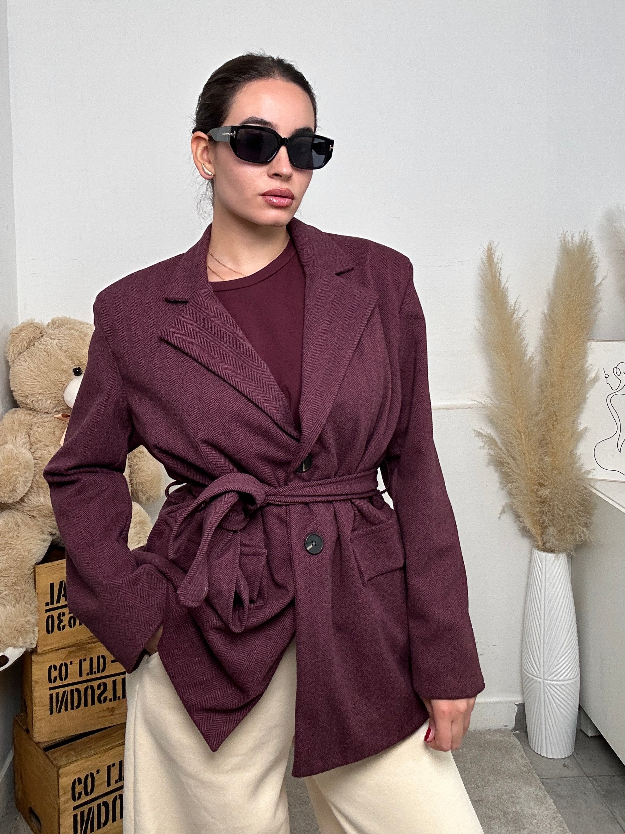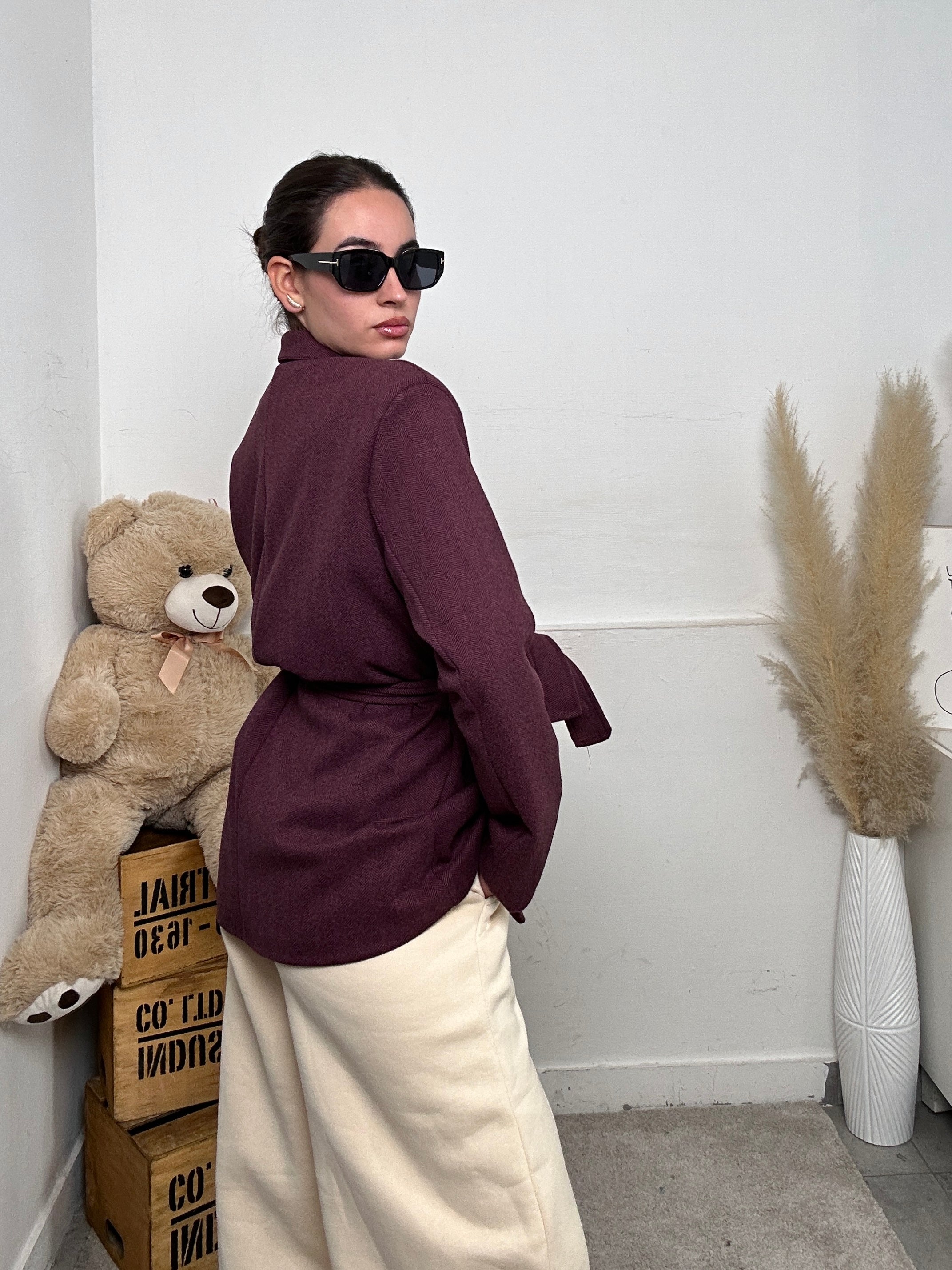 Giacca NINA, a maniche lunghe con spalline imbottite, con tasche frontali, chiusura con bottoni e cintura in vita, scollo a V con colletto.