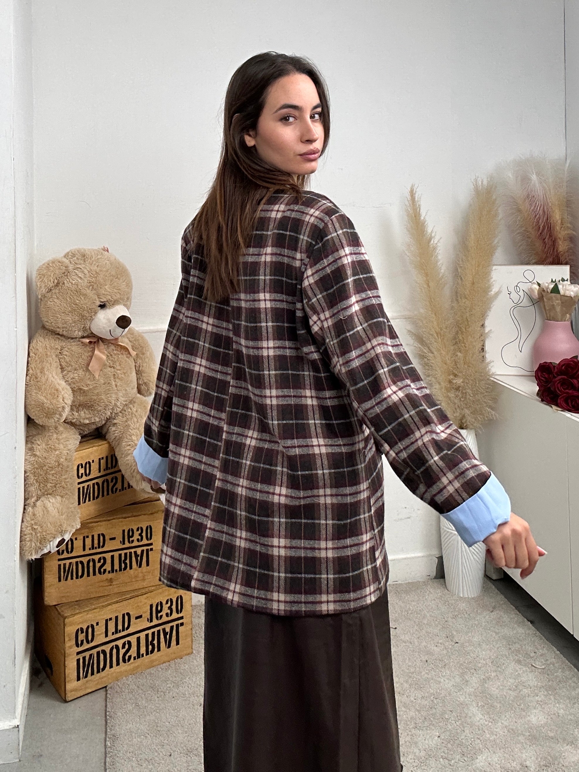 Giacca A QUADRI, oversize con spalline imbottite, colletto e scollo a V, fodera all'interno chiusura con bottoni, tasche frontali e fake camicia che fuoriesce dalle maniche della giacca.