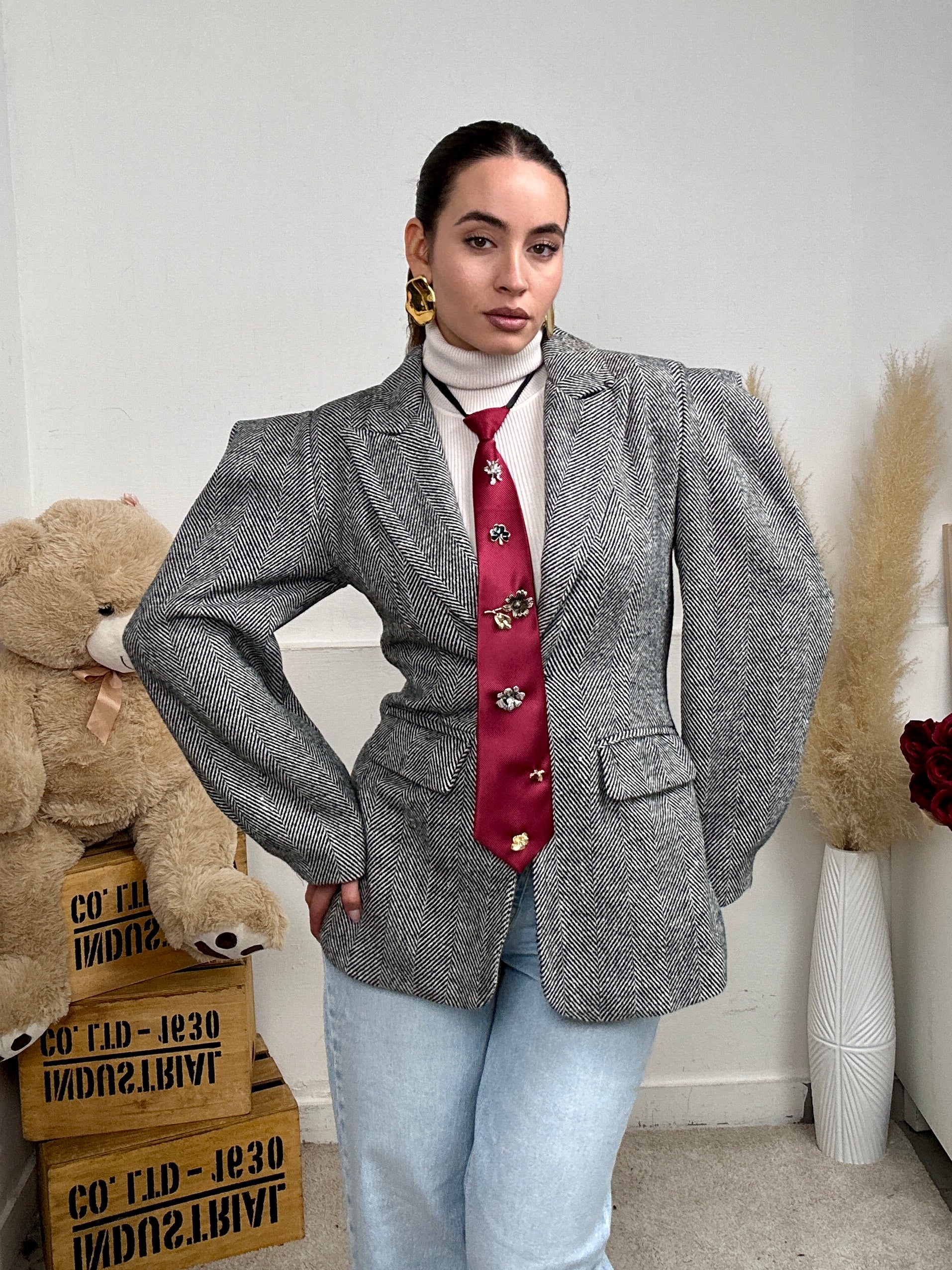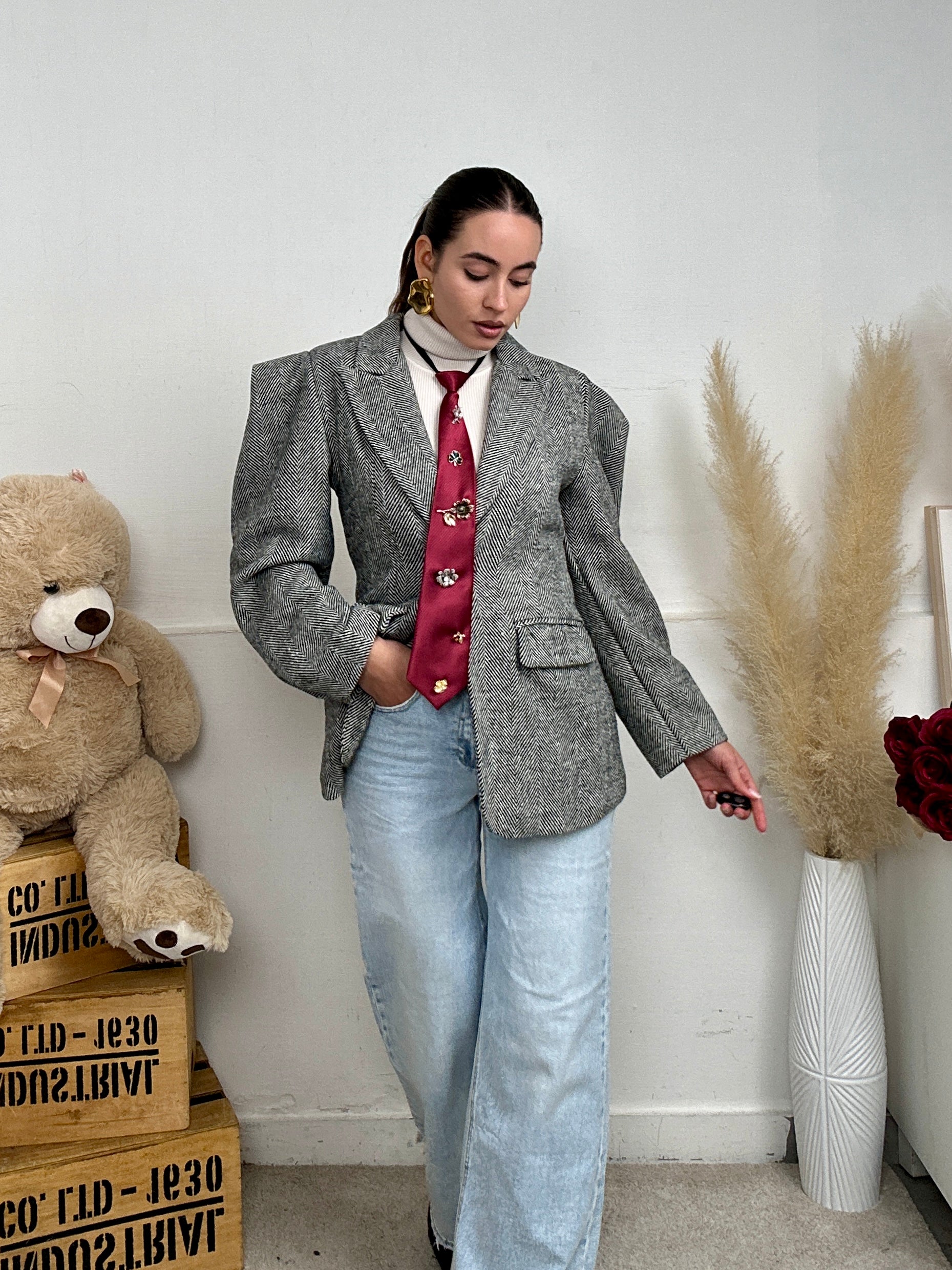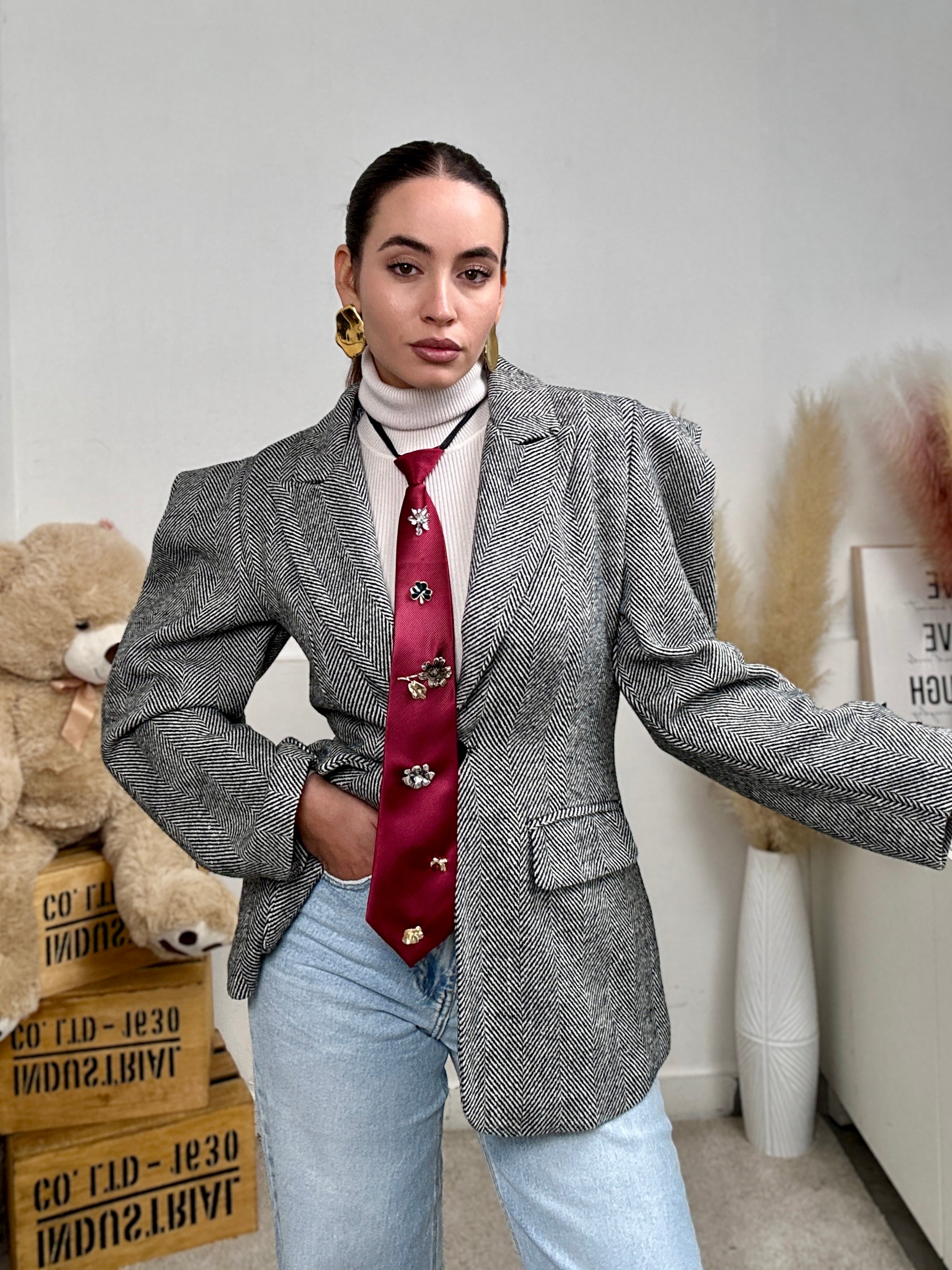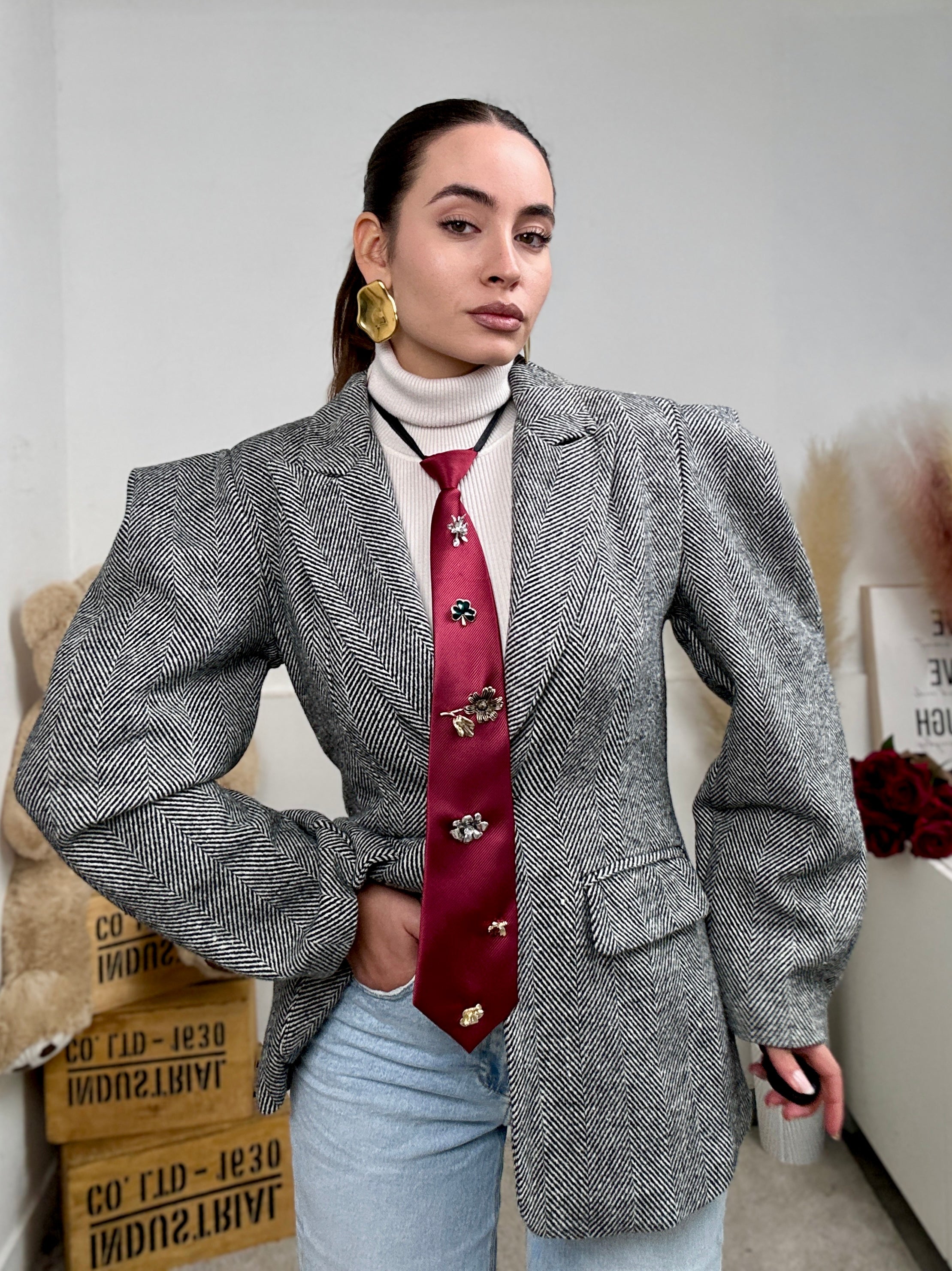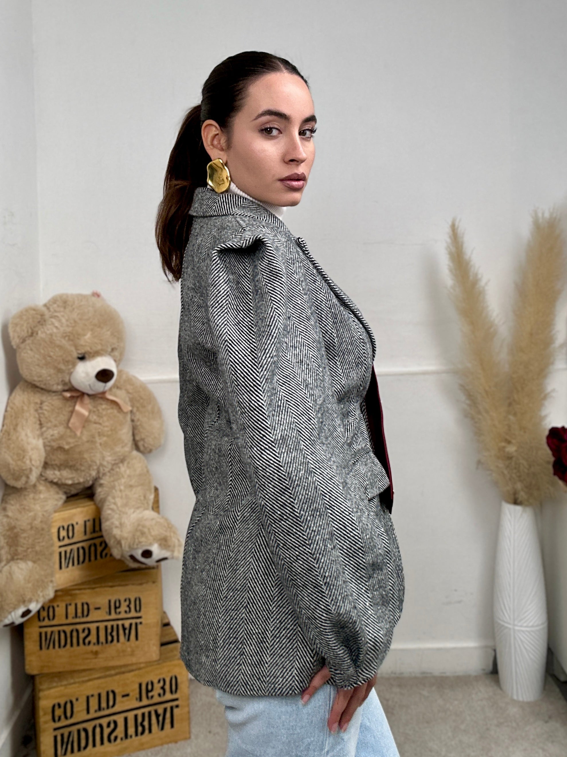 Giacca LUNETTA, lunga con fodera all'interno, a maniche lunghe con imbottitura sulle spalle, scollo a V e colletto, due tasche frontali e chiusura con bottoni.