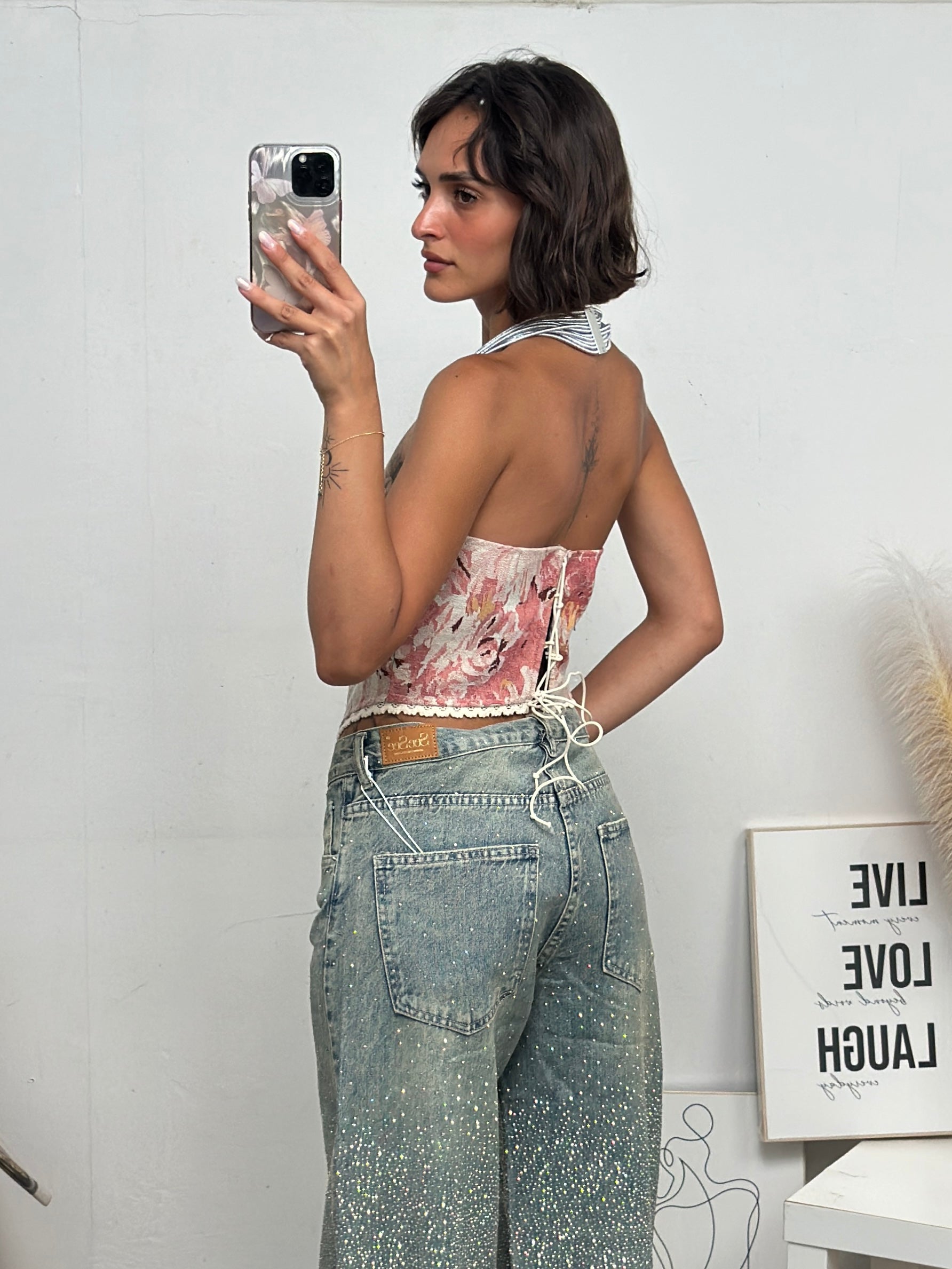 Jeans CHIC a palazzo lavaggio chiaro, con strass sparsi in modo uniforme su tutta la lunghezza