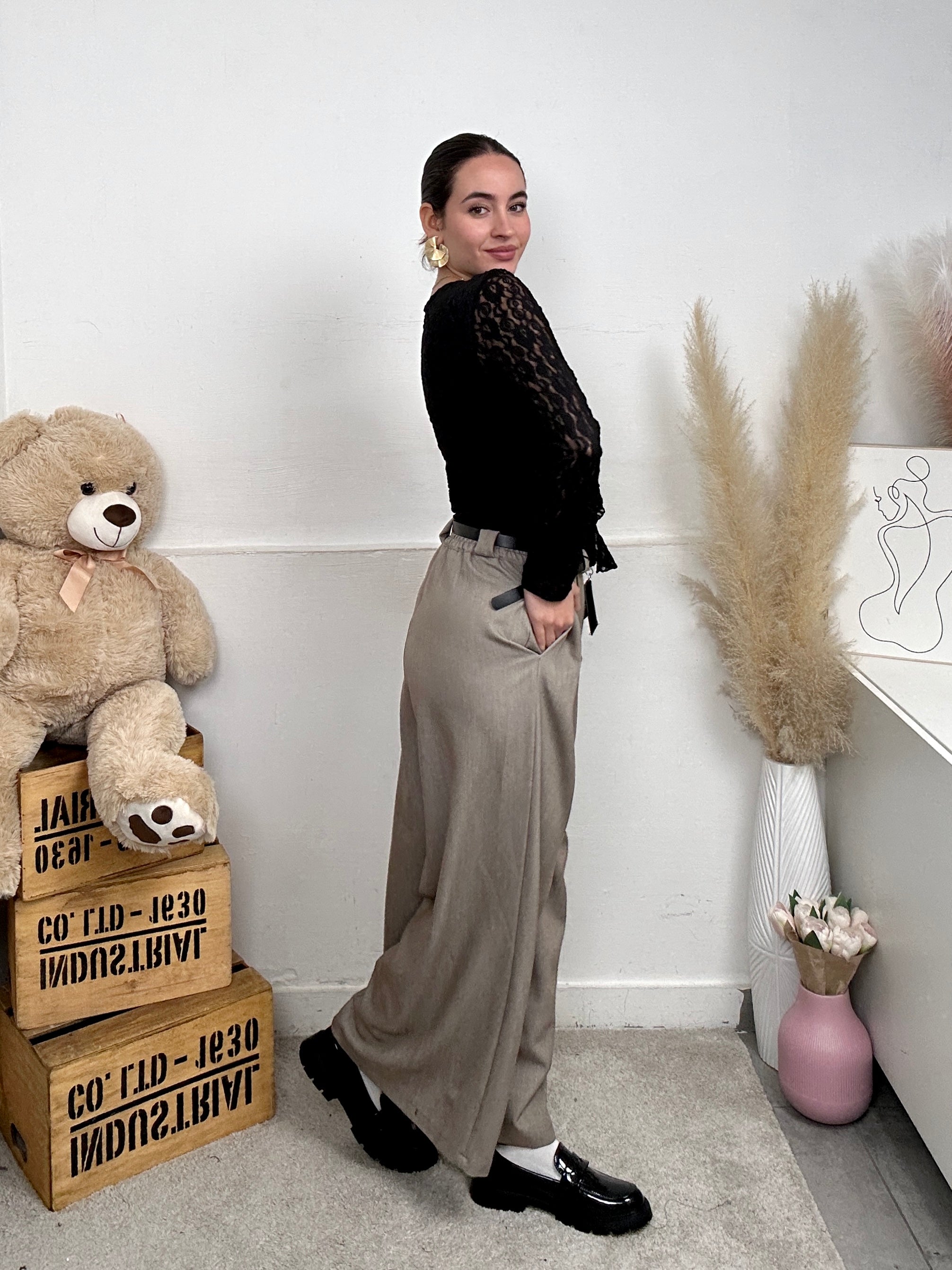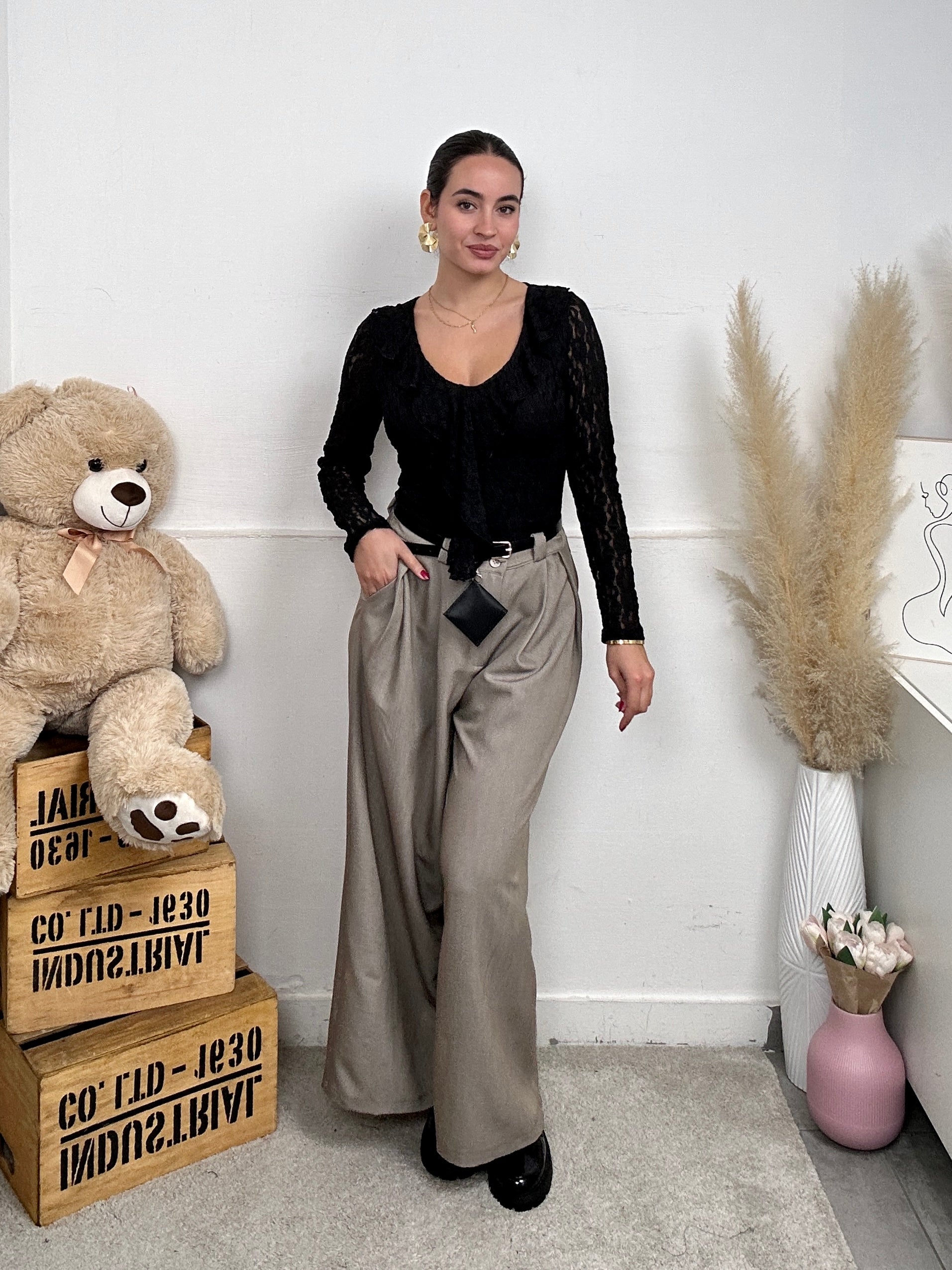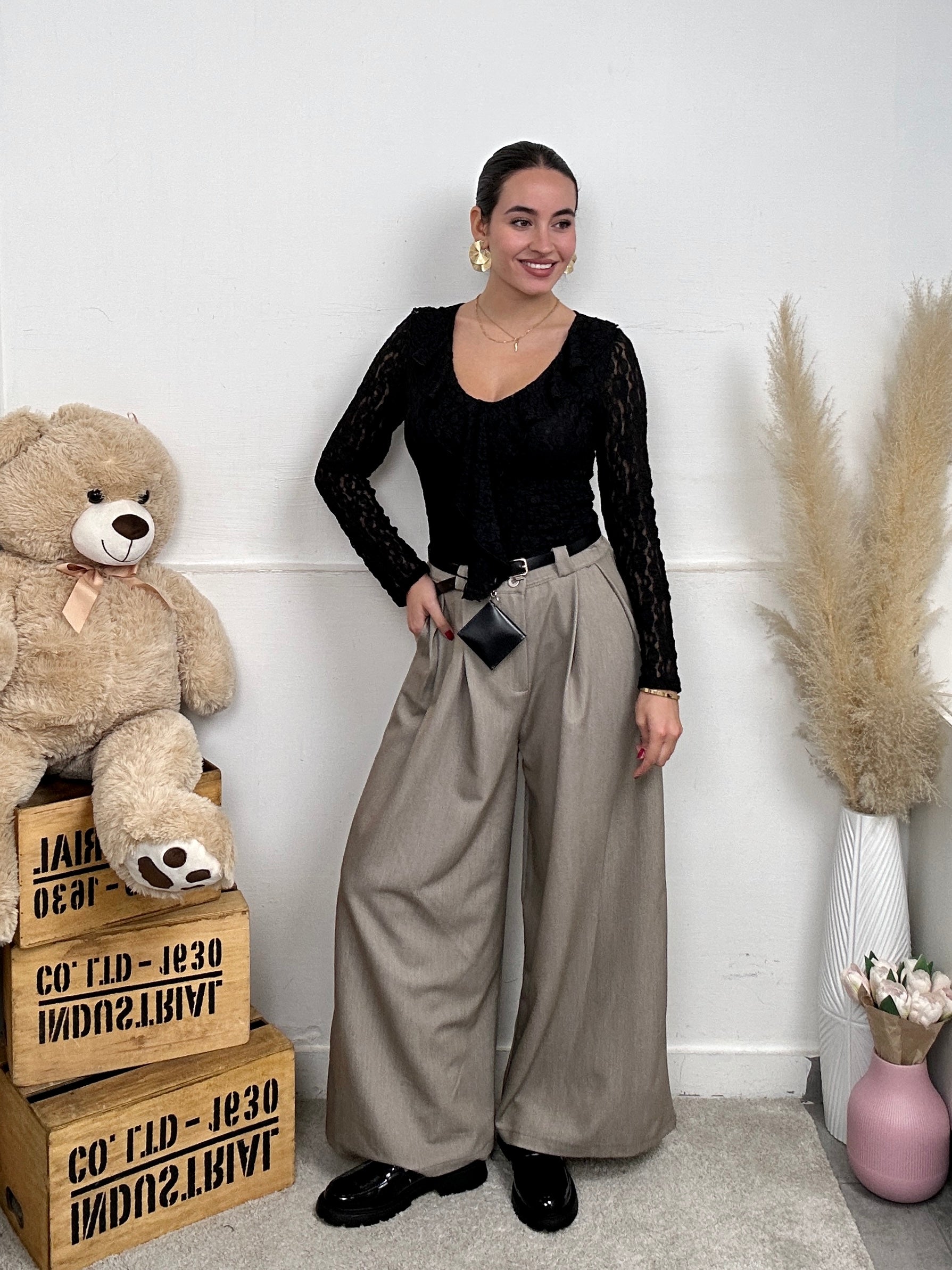 Pantalone con portamoney, a palazzo, con elastico in vita e chiusura con zip, bottone e cintura che porta il suo portamonete.