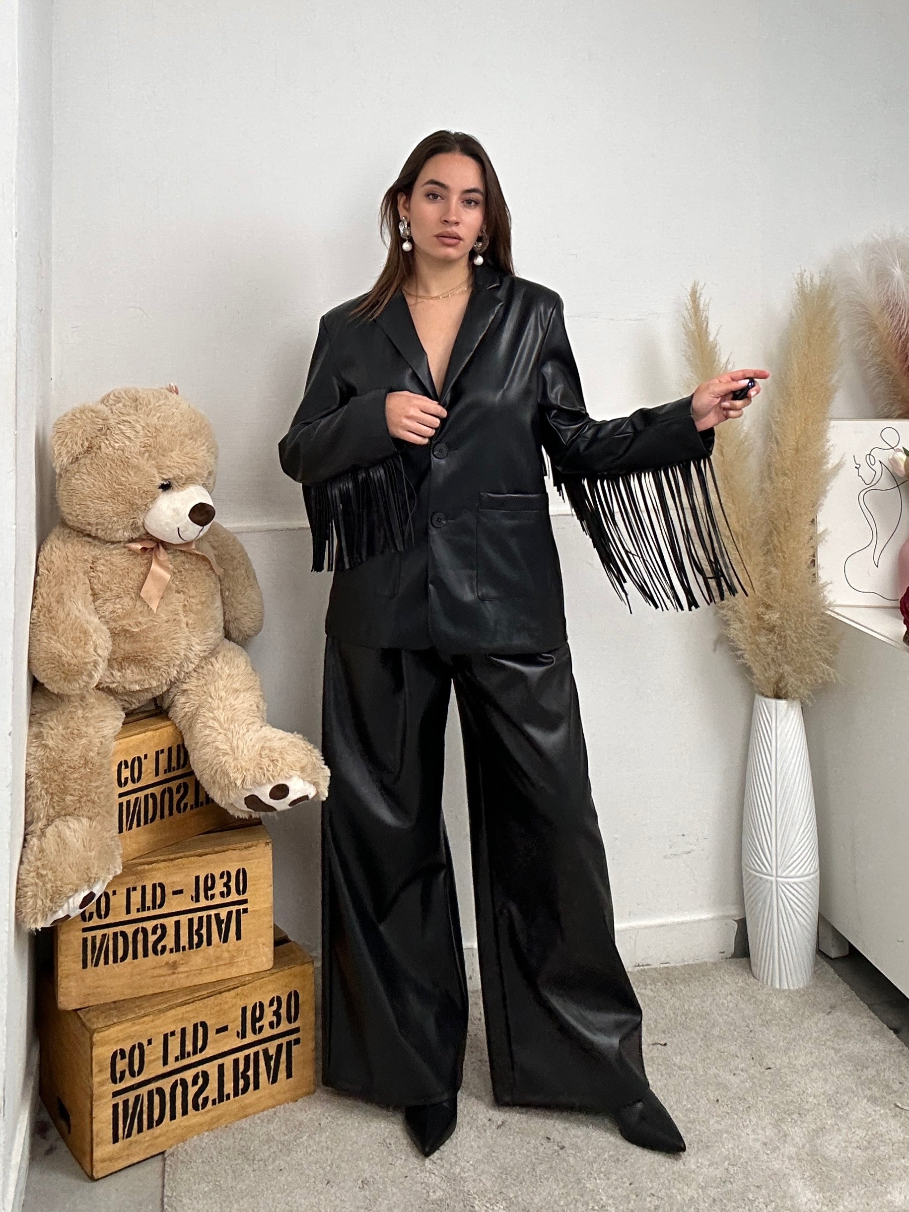 Pantalone in ECOPELLE, a palazzo, con tasche frontali, chiusura con cintura e ha la sua molla dietro, elasticizzato.