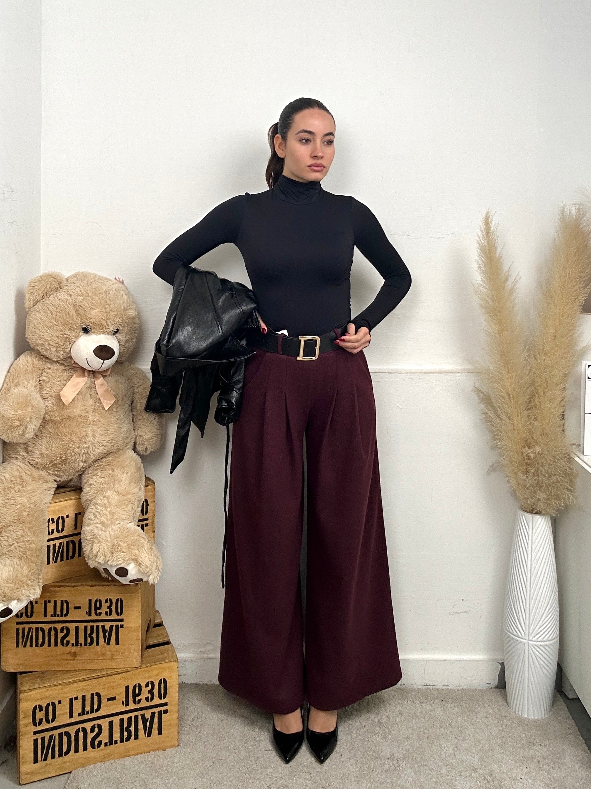Pantalone a palazzo, morbido e caldo, con tasche, con chiusura con zip, molla in vita, bottone e cintura in vita.