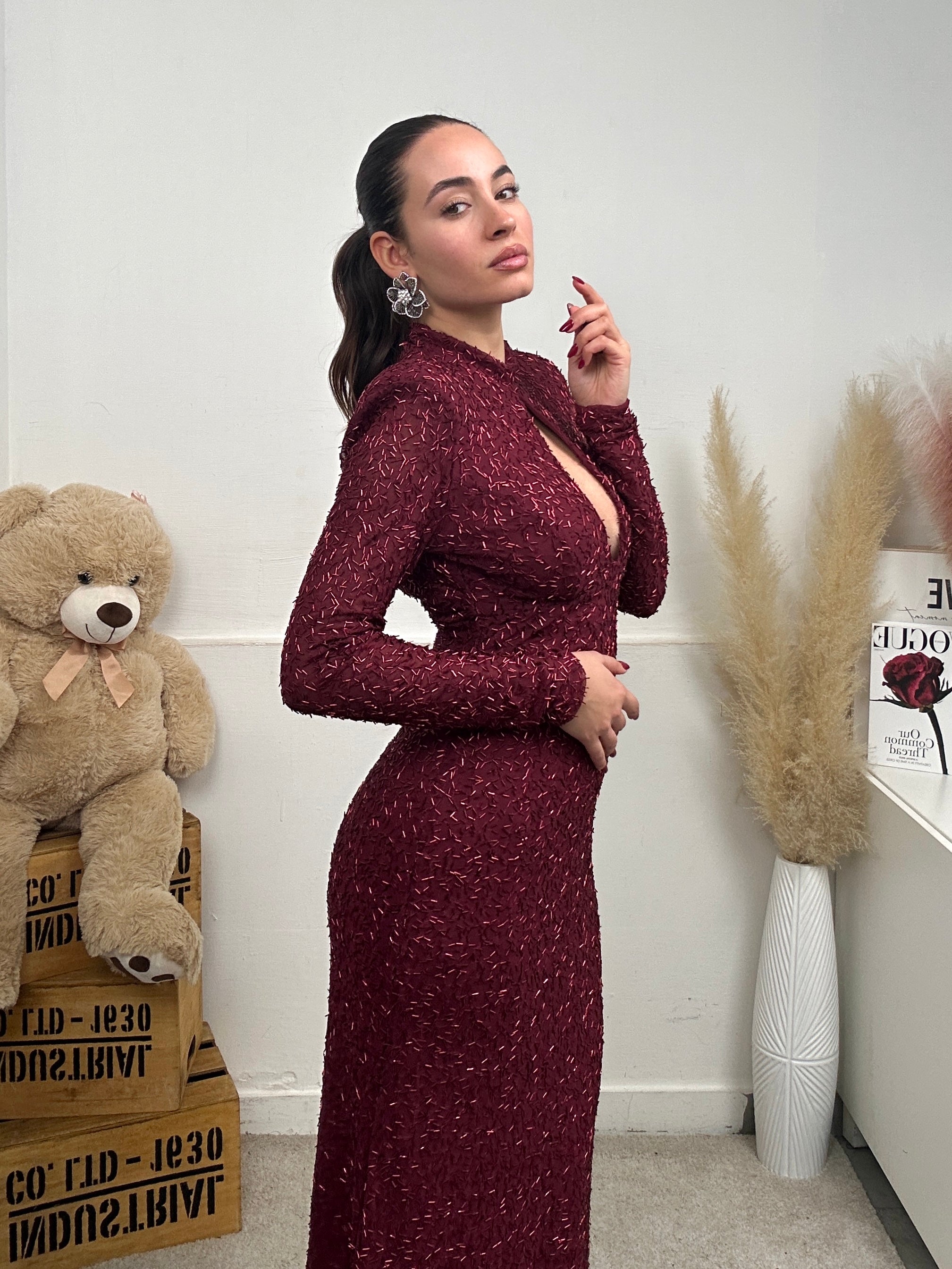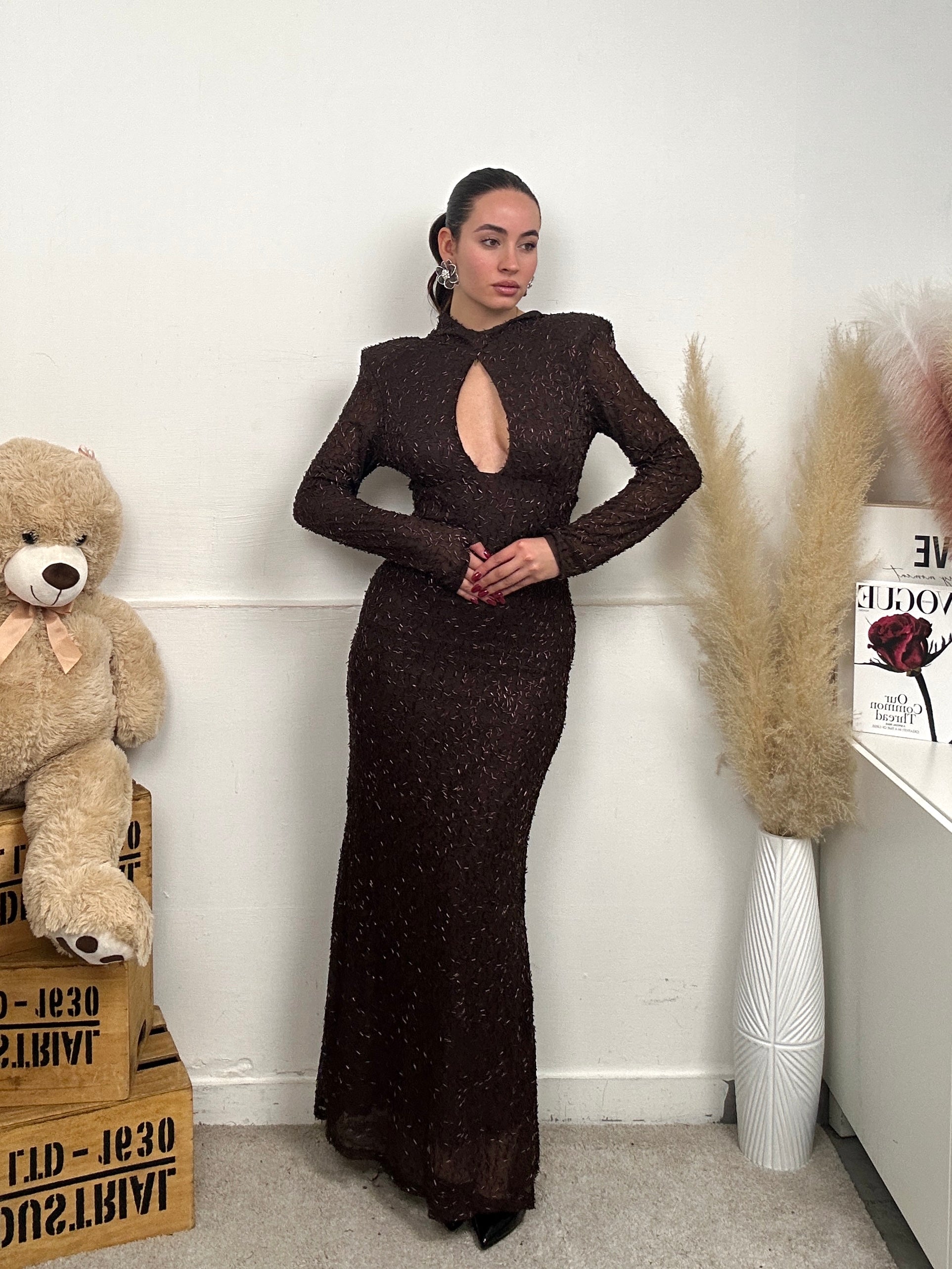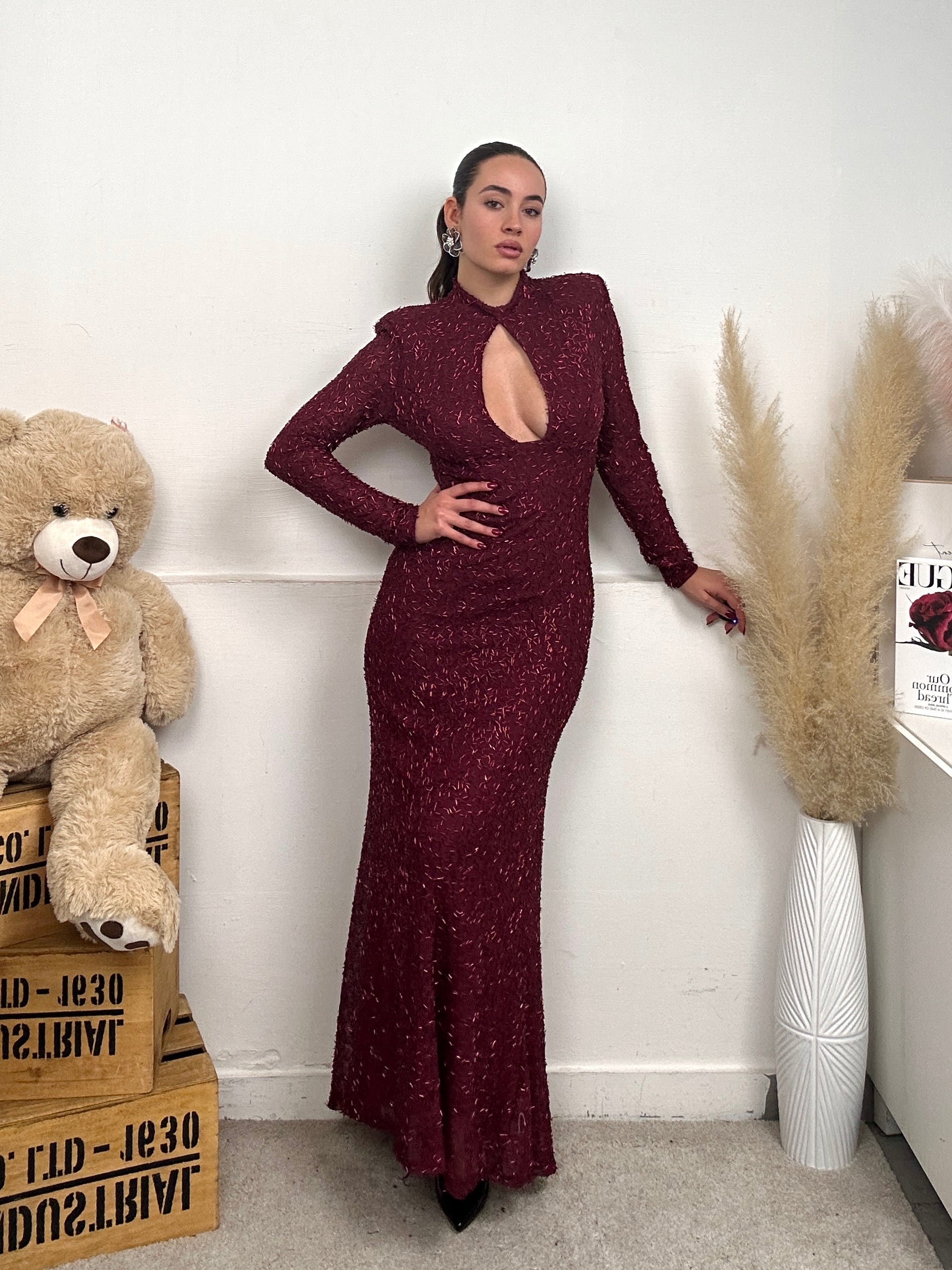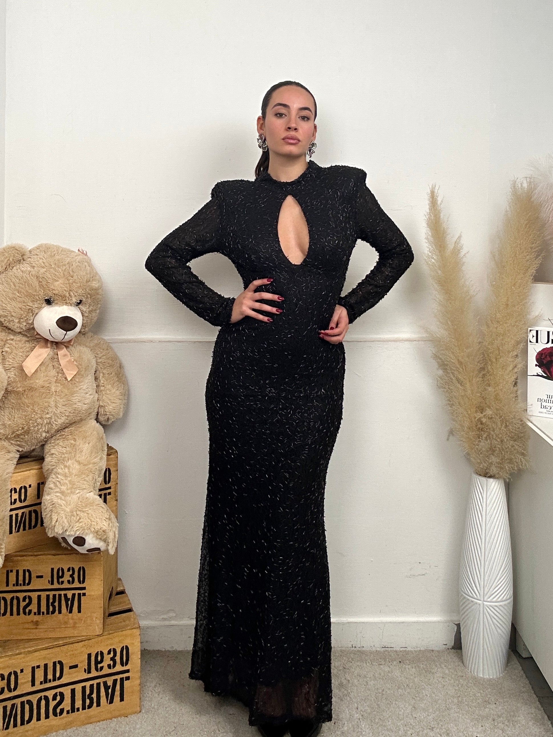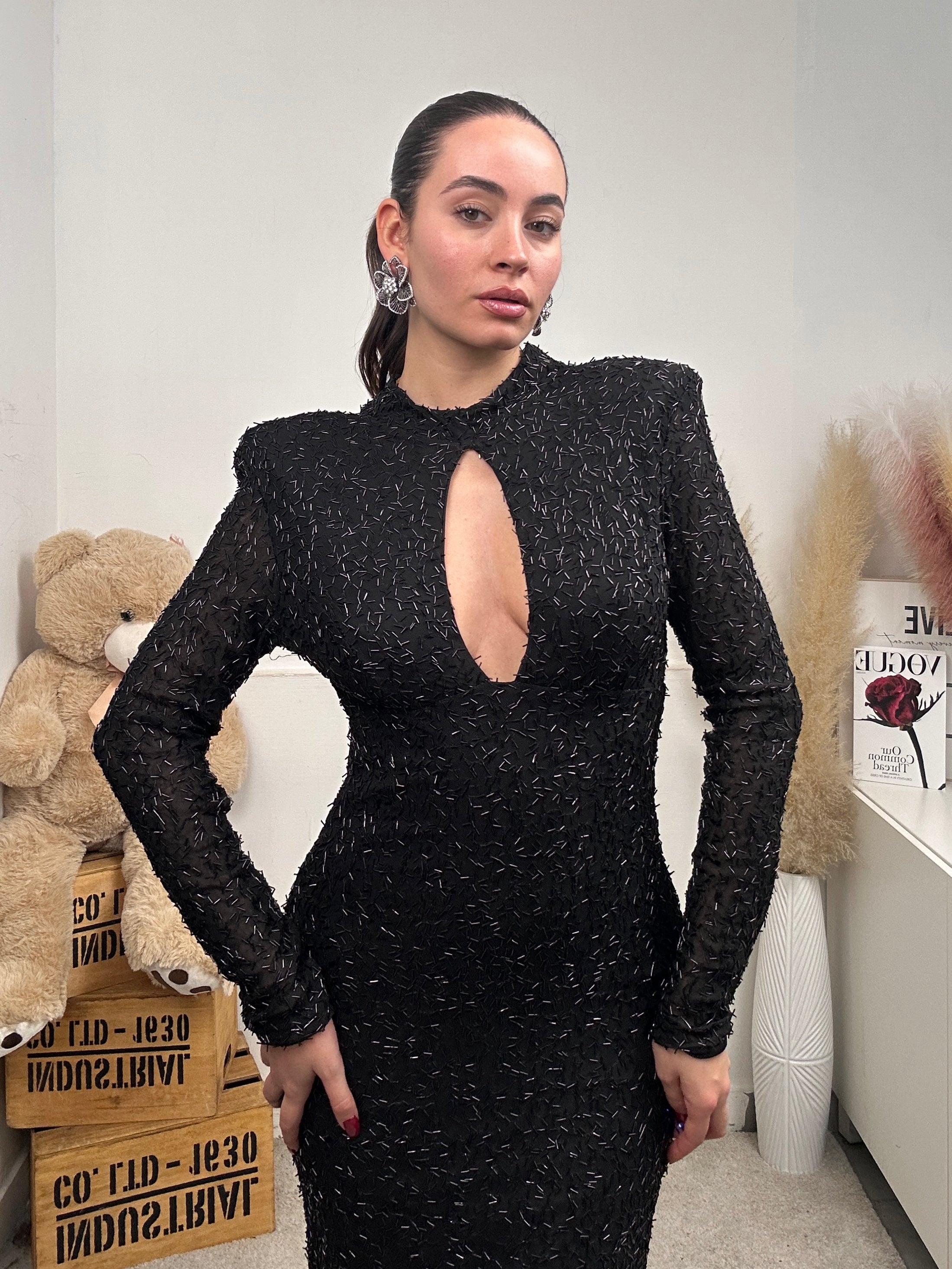 Vestito GOCCIA, lungo a maniche lunghe, spalline imbottite, con scollo a goccia frontale, chiusura con bottoni dietro al collo e pieno di paillettes.