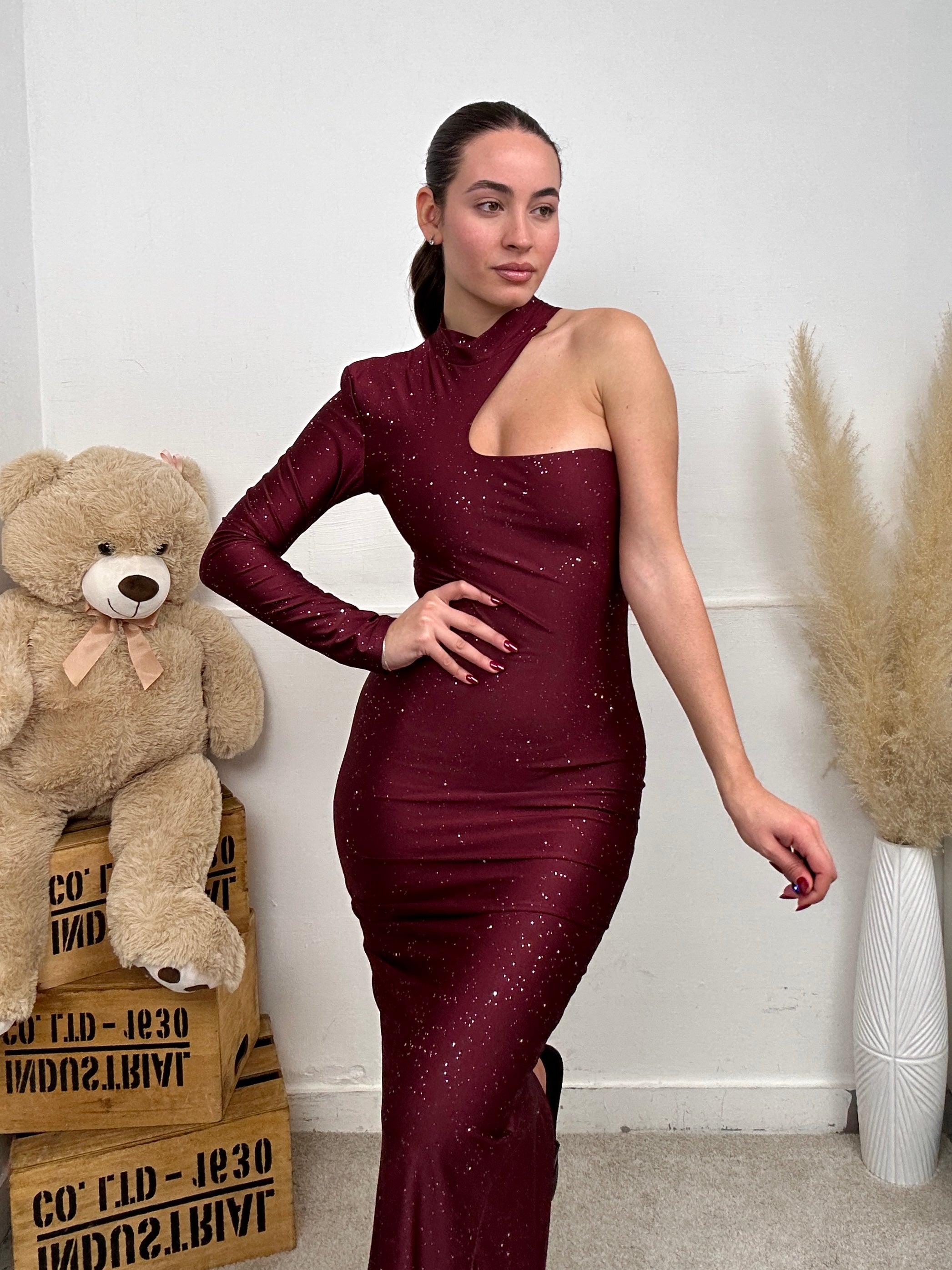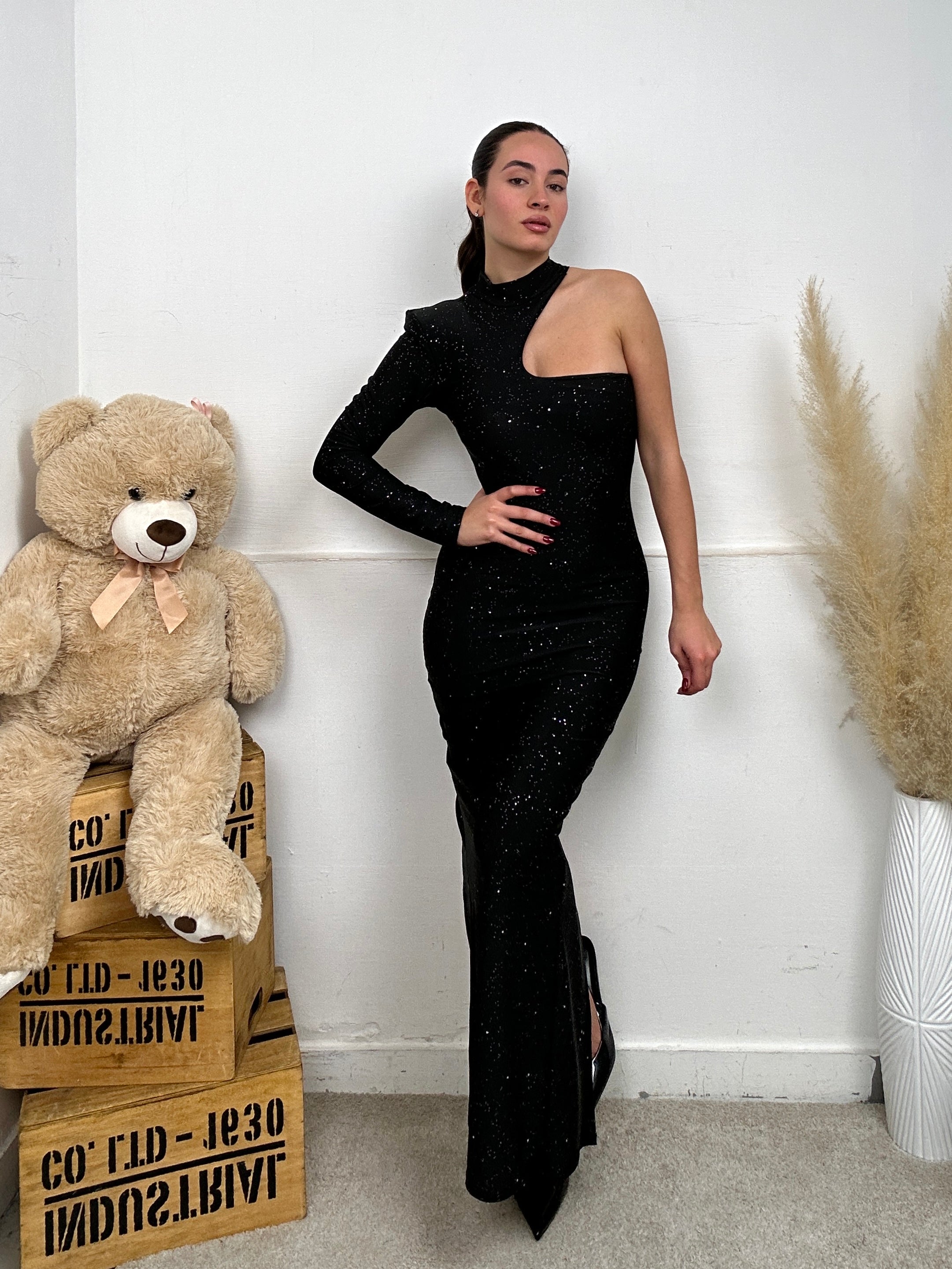 Vestito SCINTILLE, lungo, aderente con una manica lunga coperta e l'altra scoperta, scollo rotondo con chiusura con bottoni dietro al collo e ha un sacco di brillantini sopra.