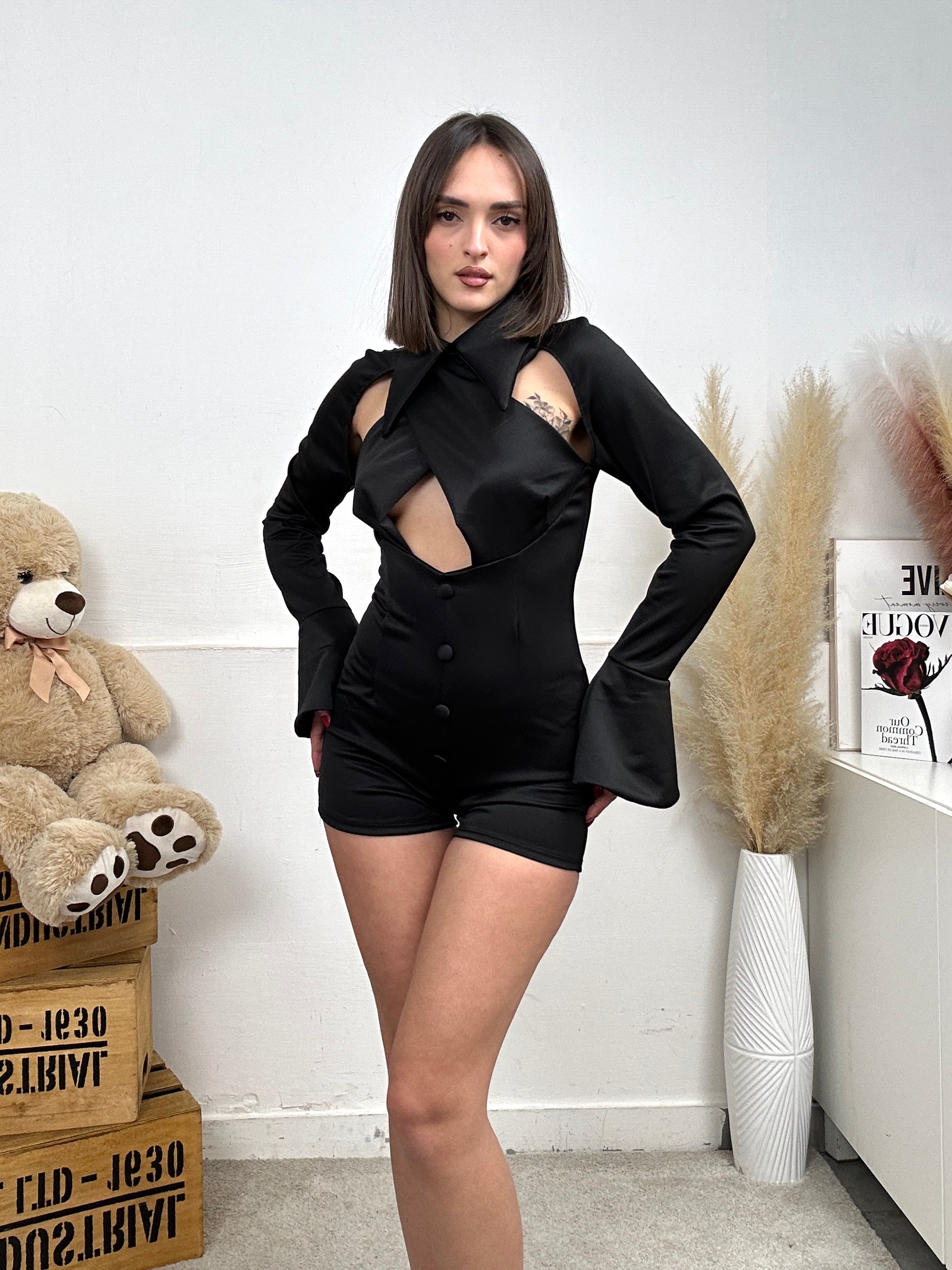 Tutina a giacca, corta a pantaloncino, maniche lunghe e a campana sulle mani, colletto e dettaglio particolare frontale, bottoni finti frontali.