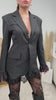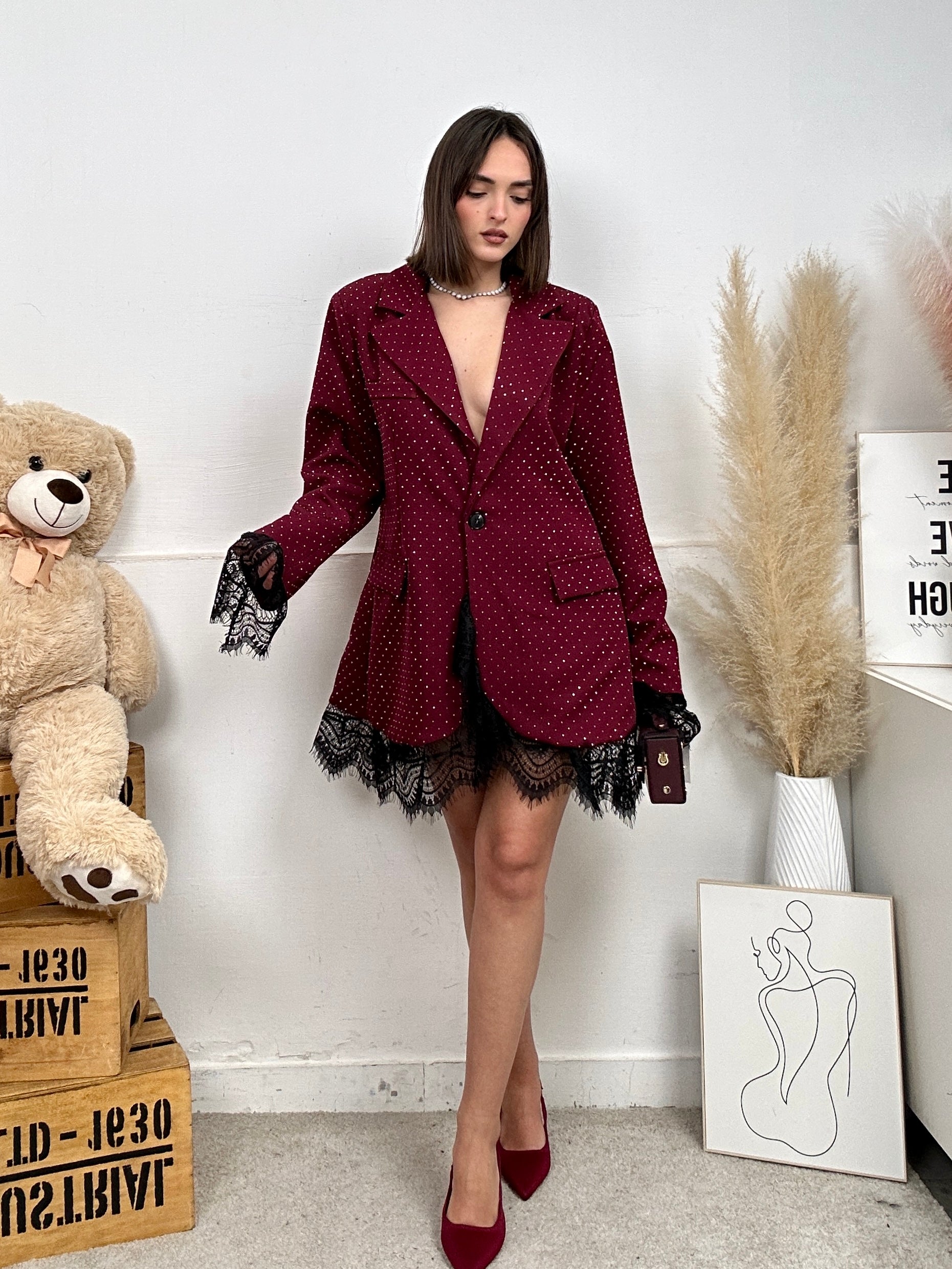 Giacca a dress, piena di strass, lunga, oversize, a maniche lunghe, scollo a V, colletto, spalline imbottite, chiusura con bottone frontale, tasche finte frontali e presenta l'orlo finale sia delle maniche e della giacca in pizzo.