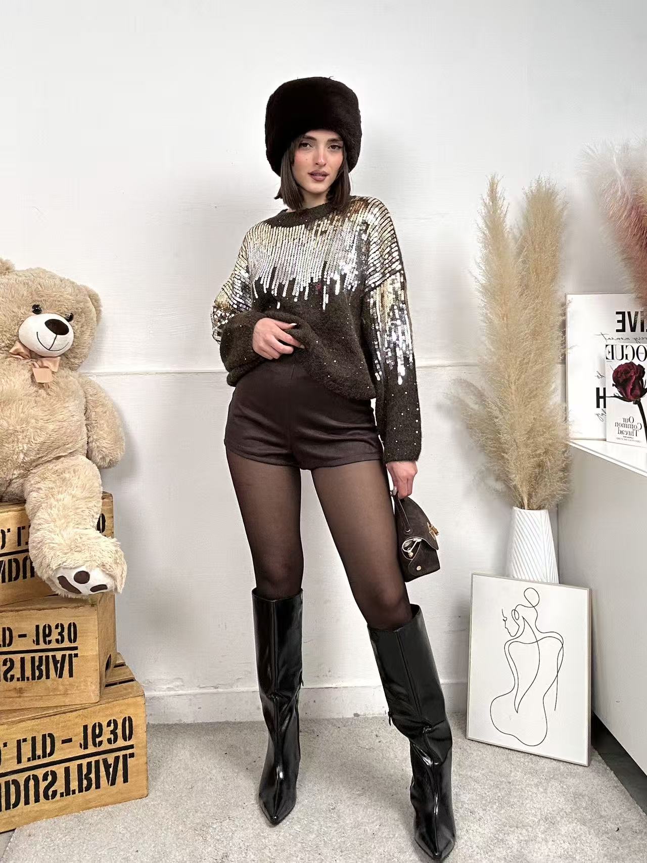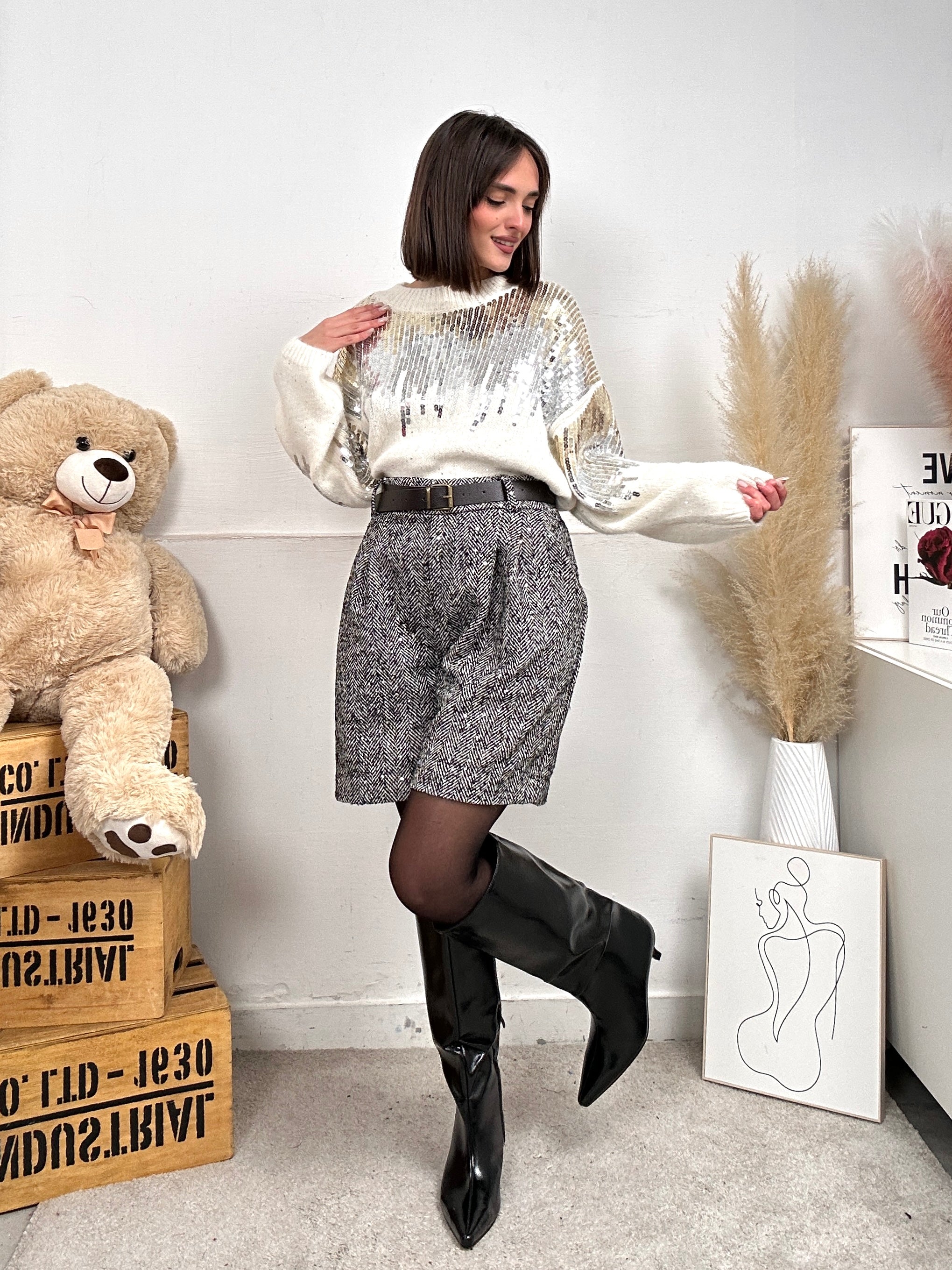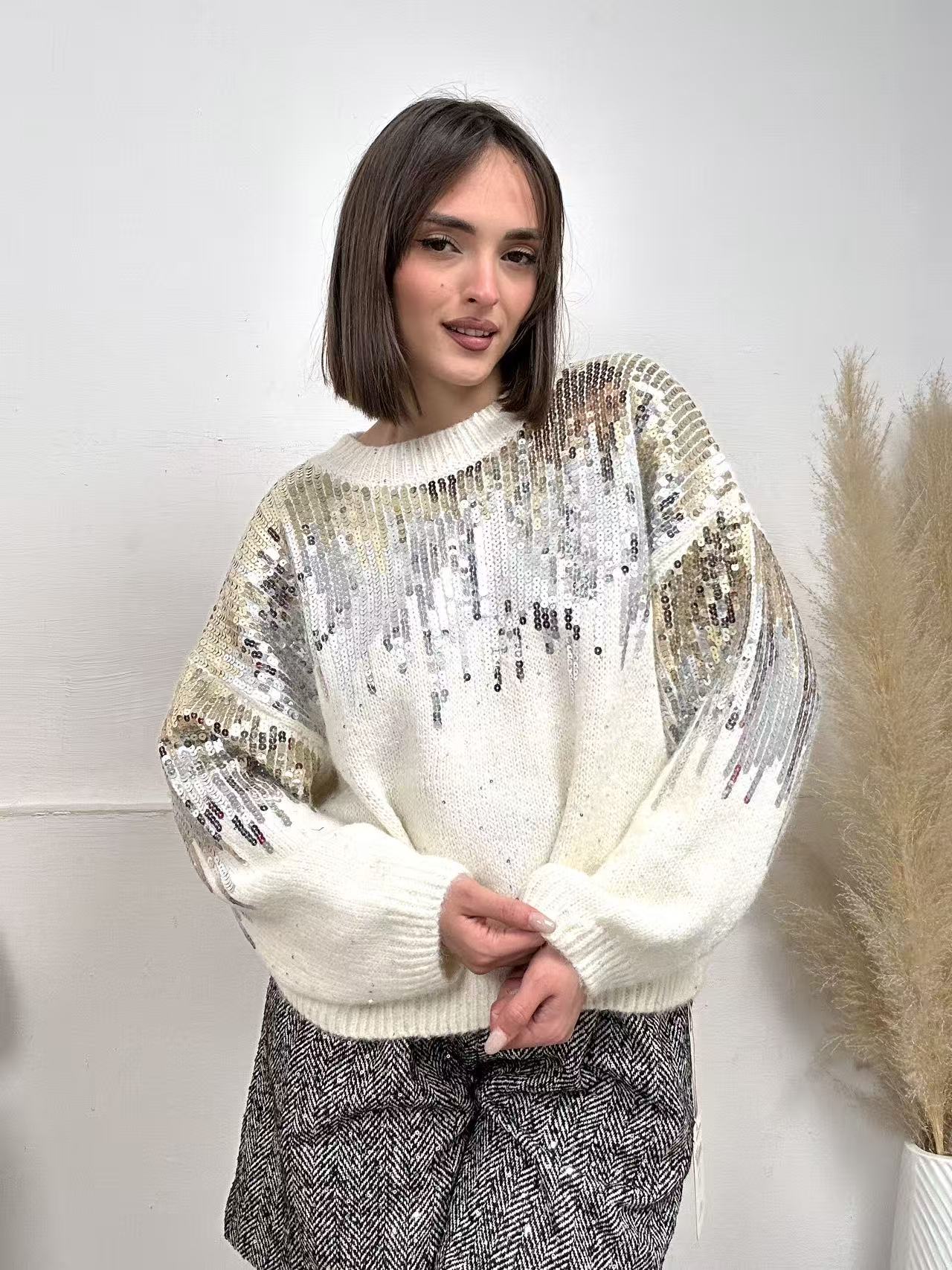Pullover NATALE, oversize, caldo cotone, scollo rotondo e paillettes frontali e sulle maniche.
