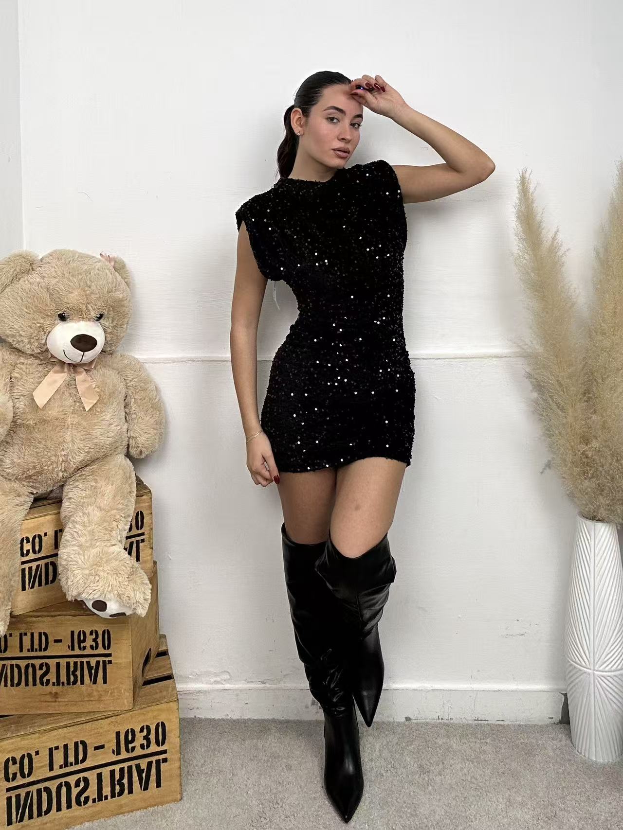 Vestito SHINY, corto con maniche a canottiera, spalline imbottite e pieno di paillettes.