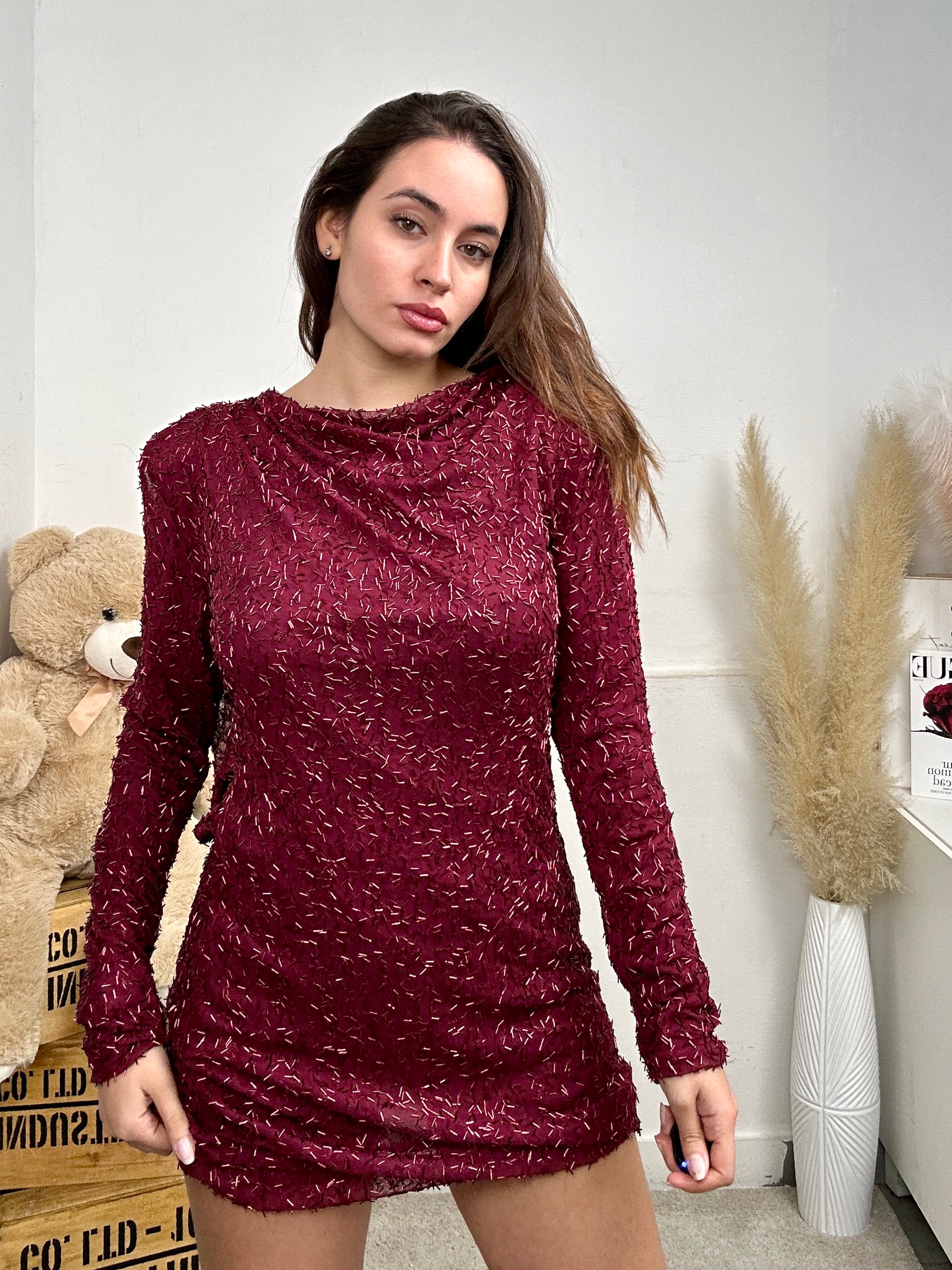 Vestito GLITTER, corto, con spalline imbottite a maniche lunghe e schiena scoperta.