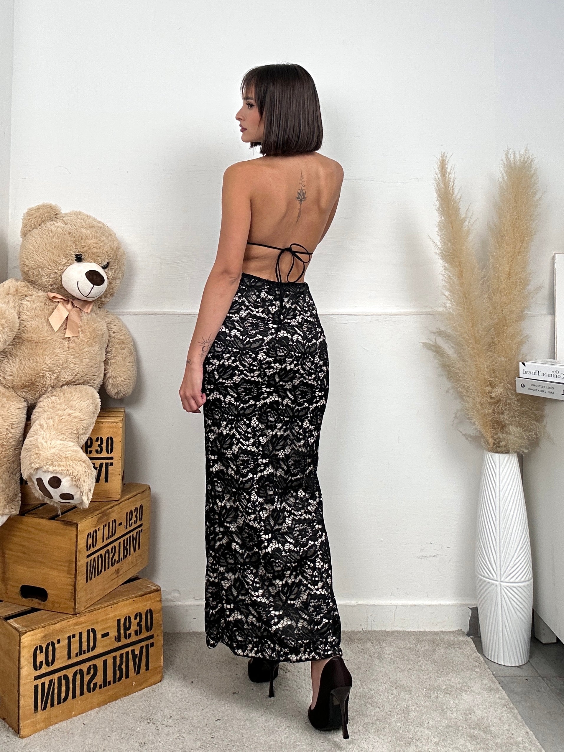 Abito in pizzo con scollo a V e spalline larghe che lasciano la schiena scoperta