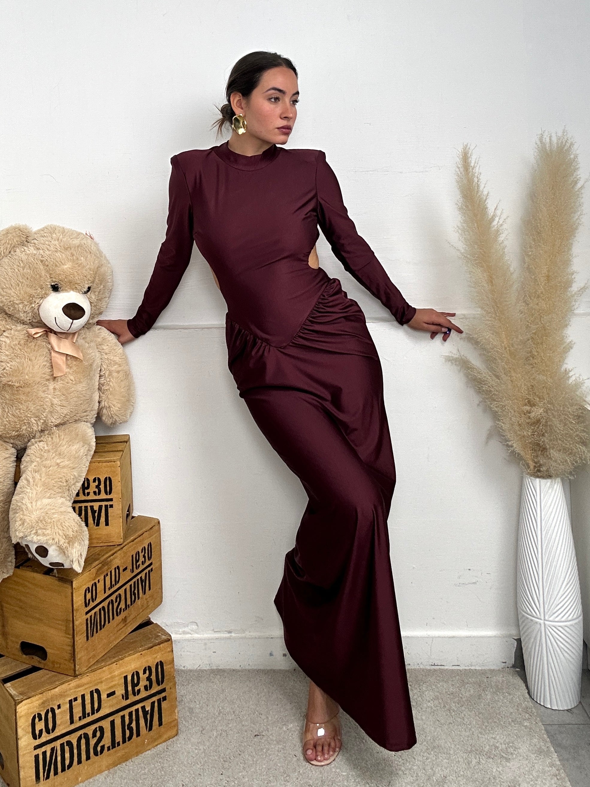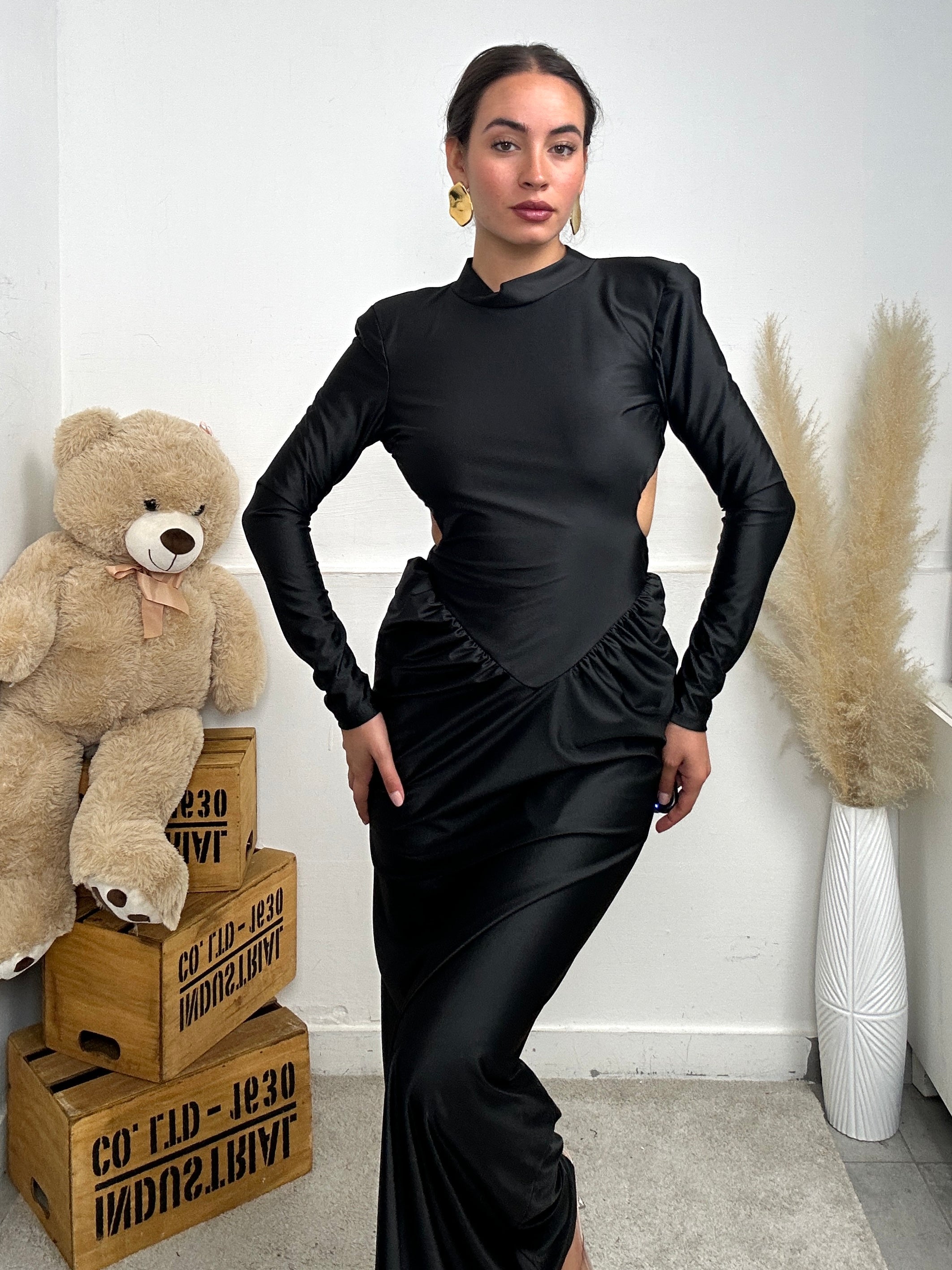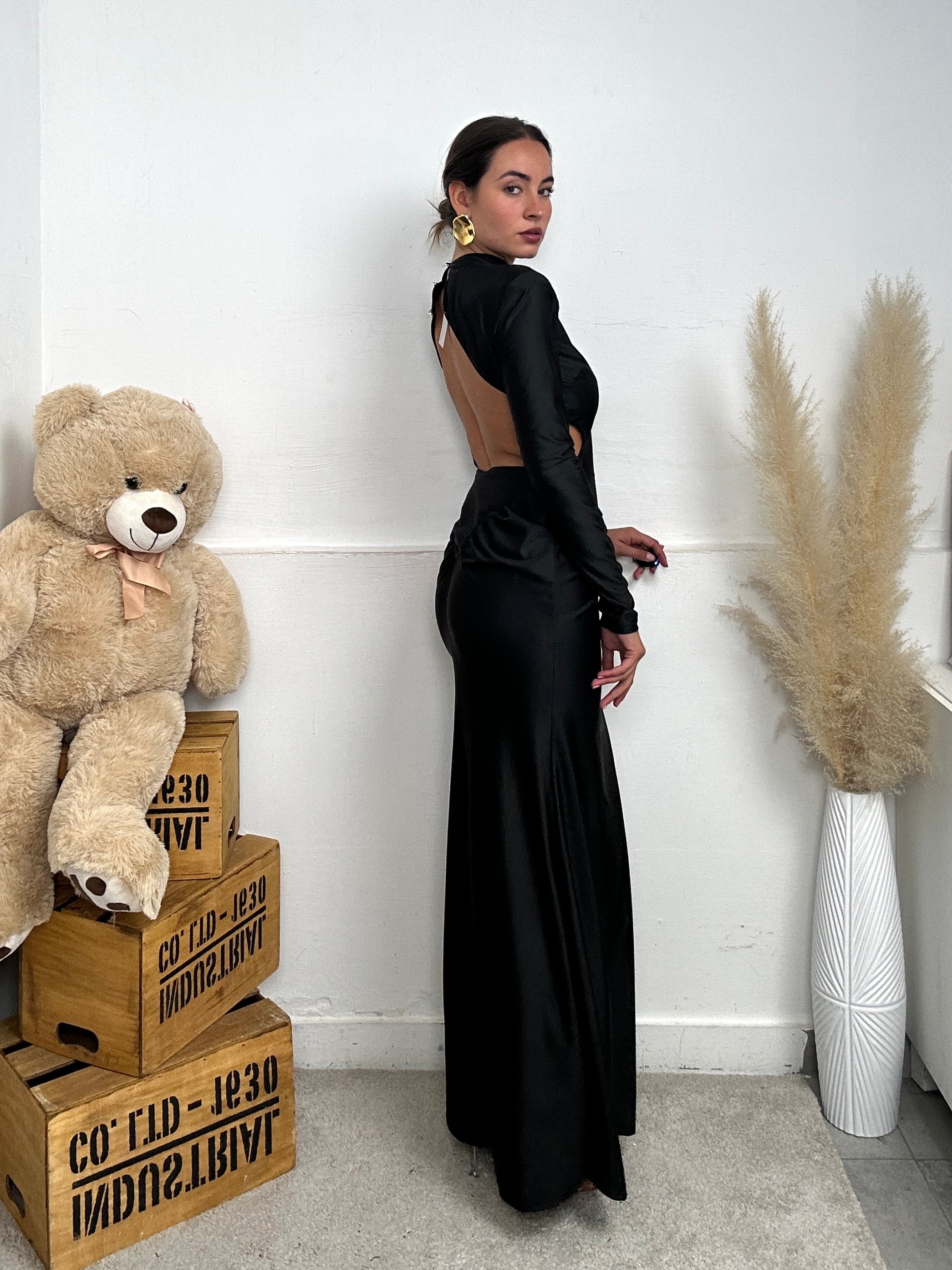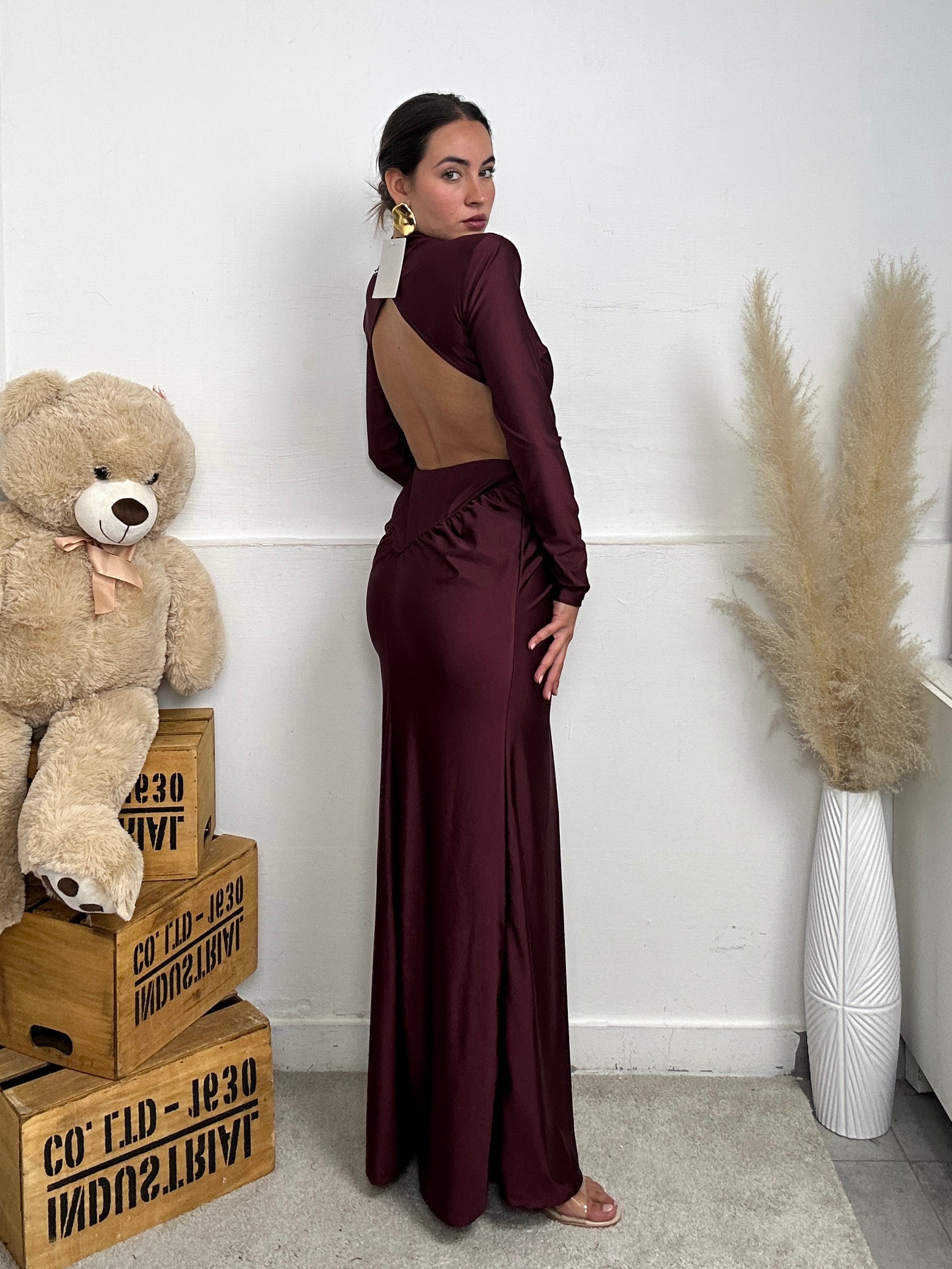 Abito beatrix a maniche lunghe con schiena scoperta e drappeggio laterale