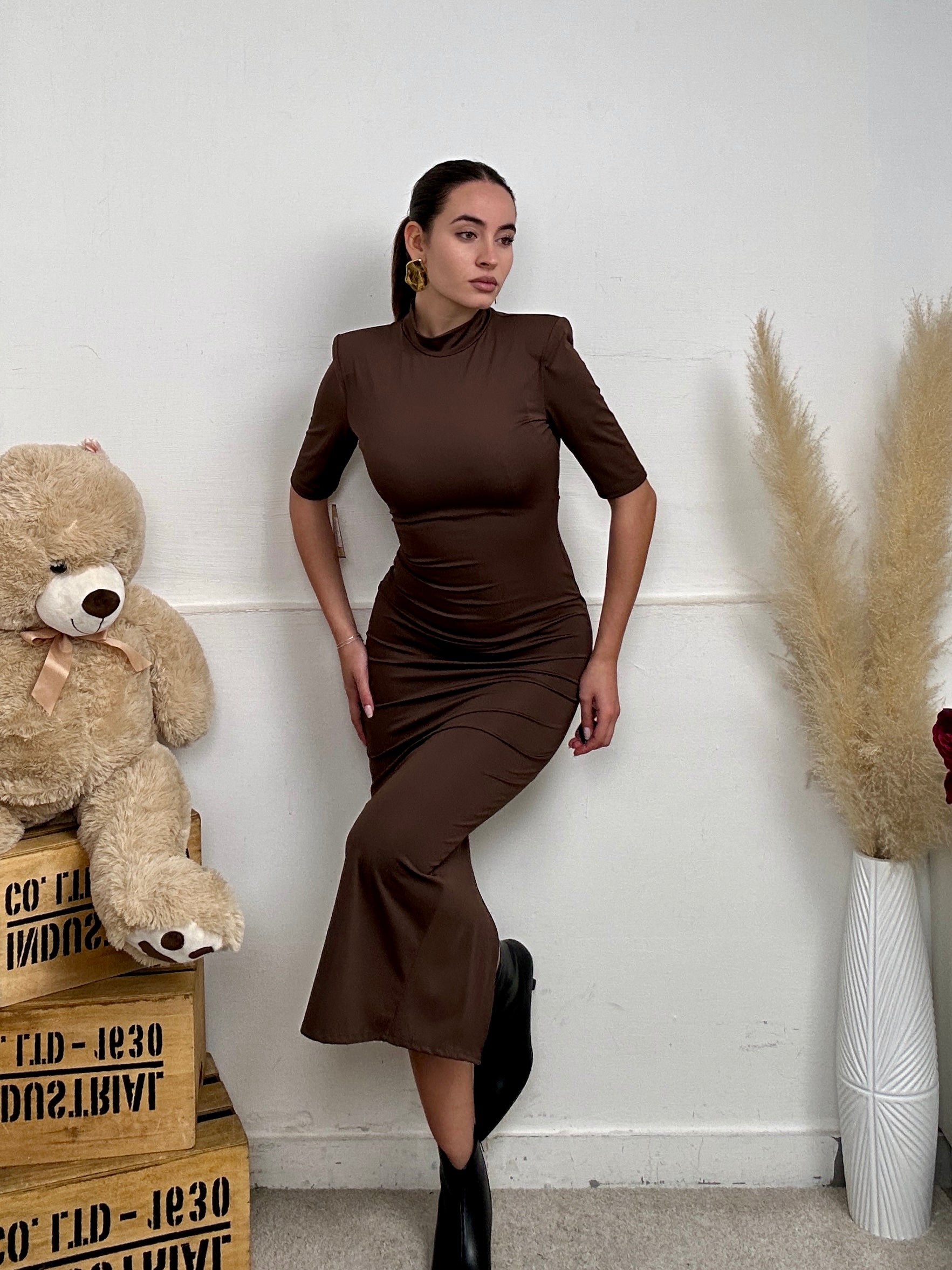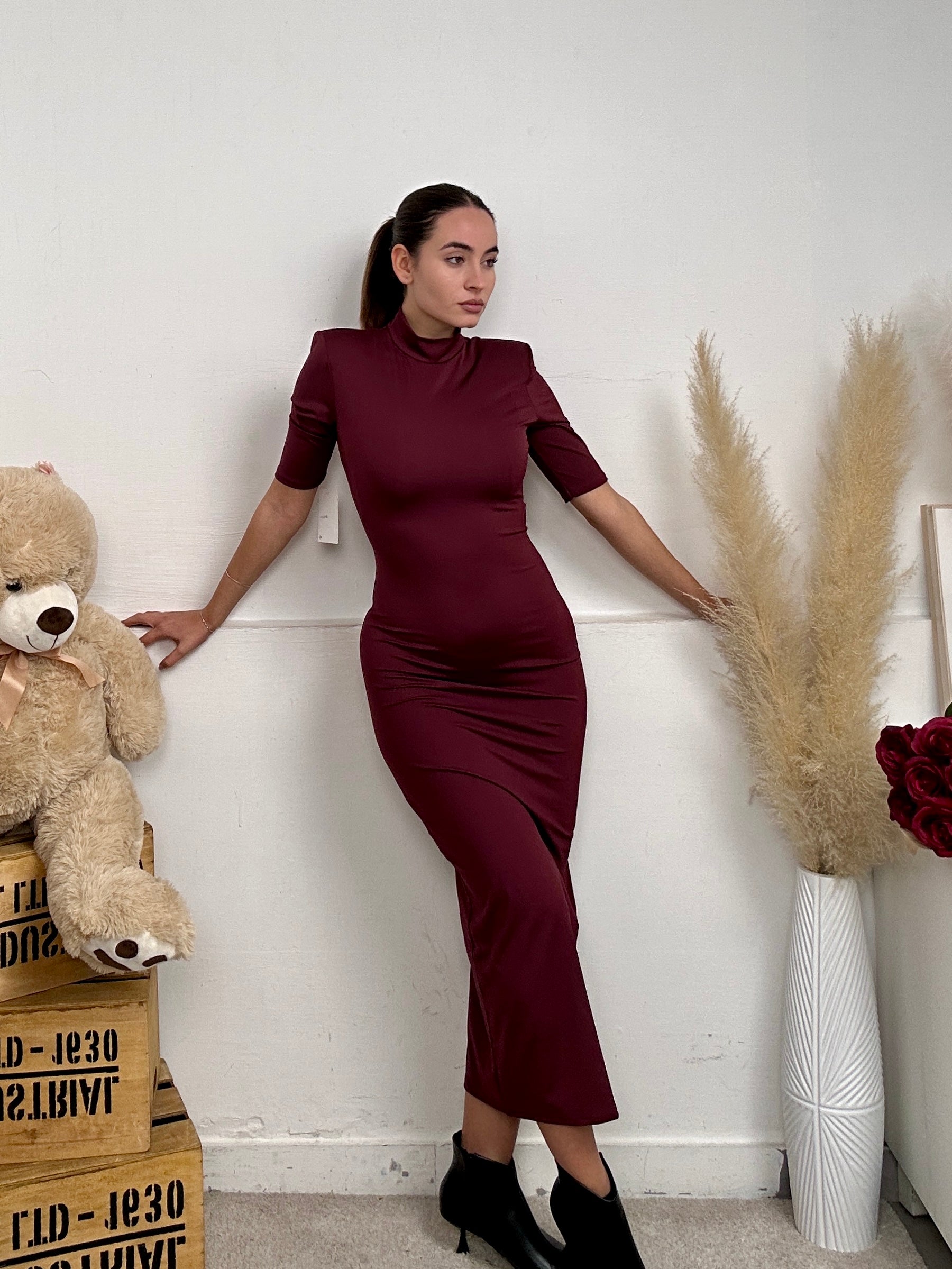 Vestito LILA, lungo a maniche corte con mezzo collo, imbottitura sulle spalle, chiusura con zip e spacco dietro.