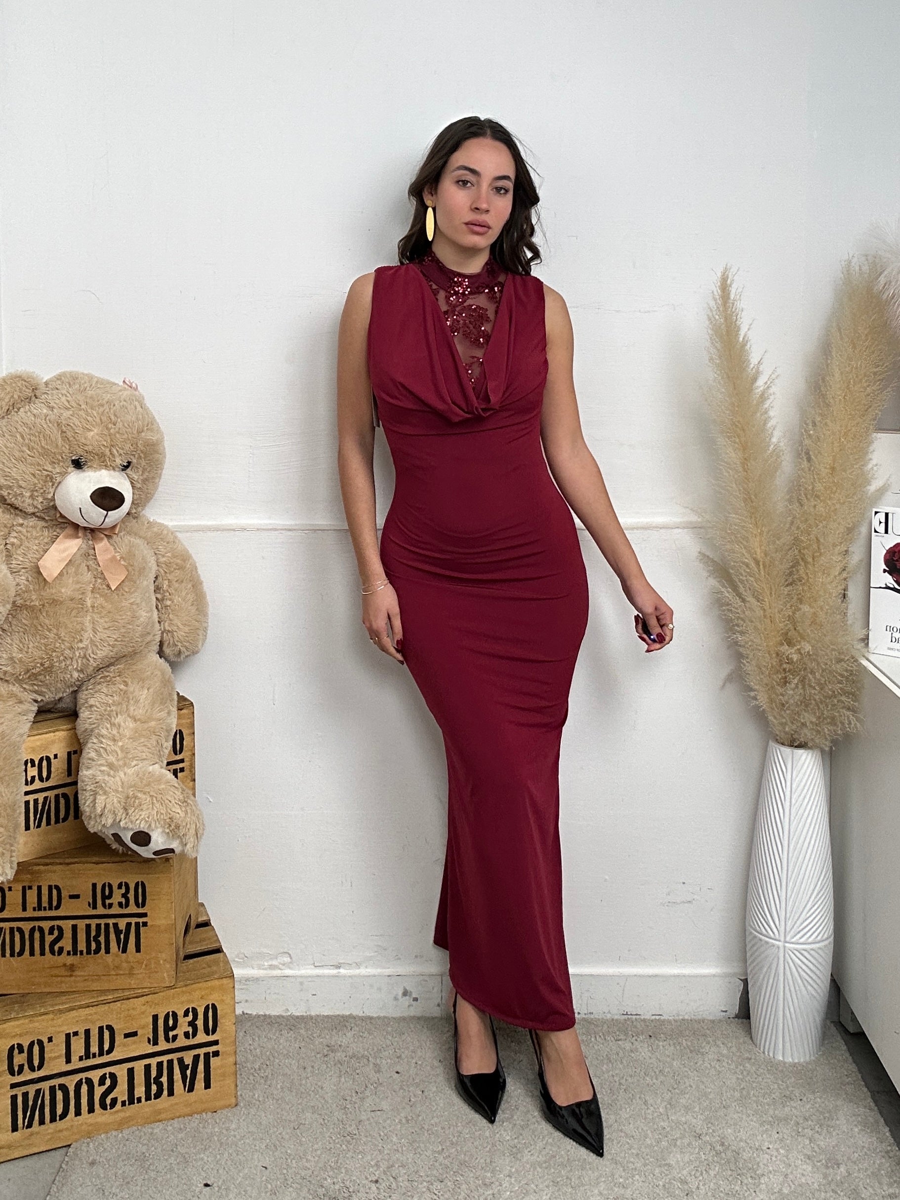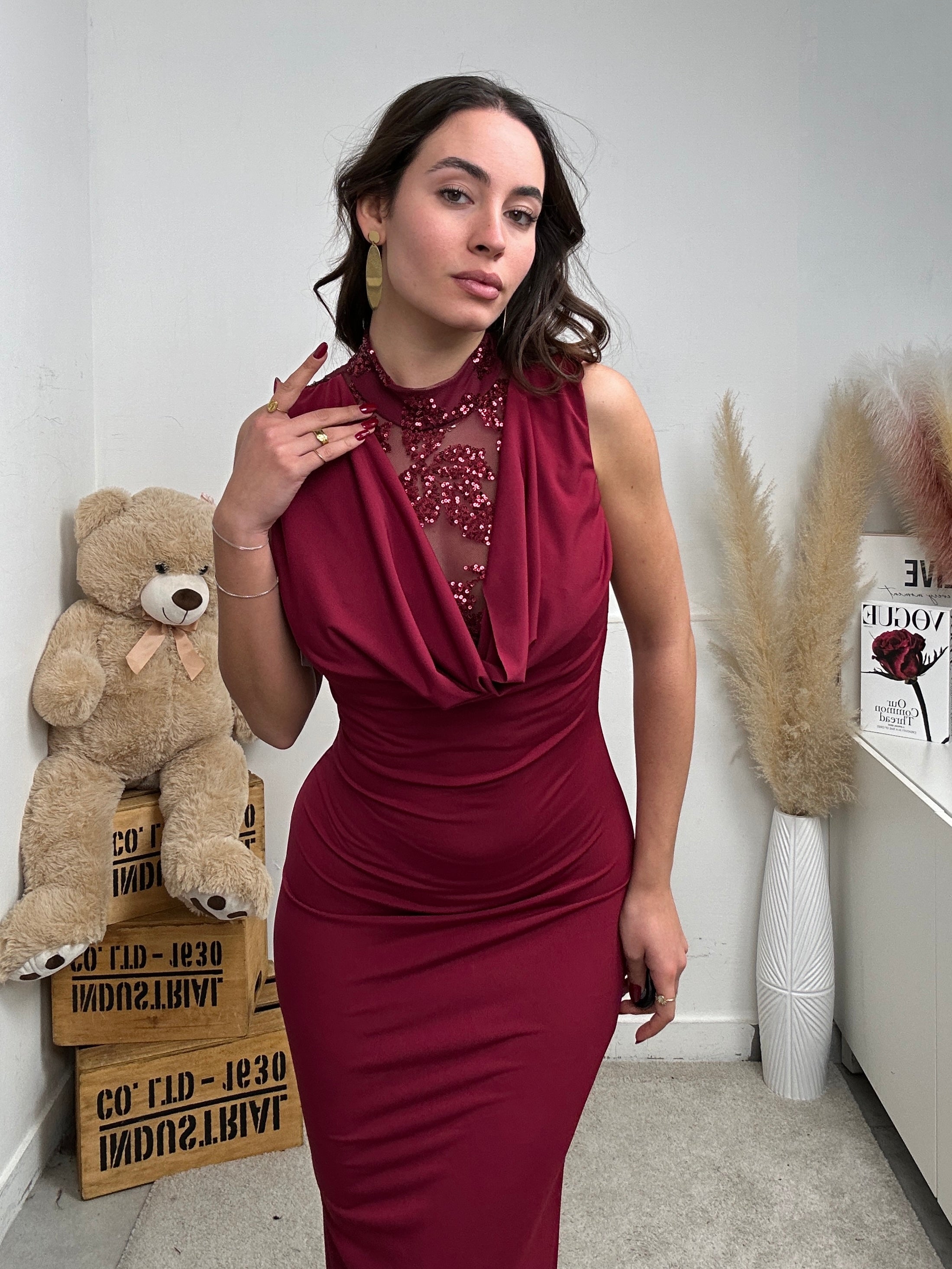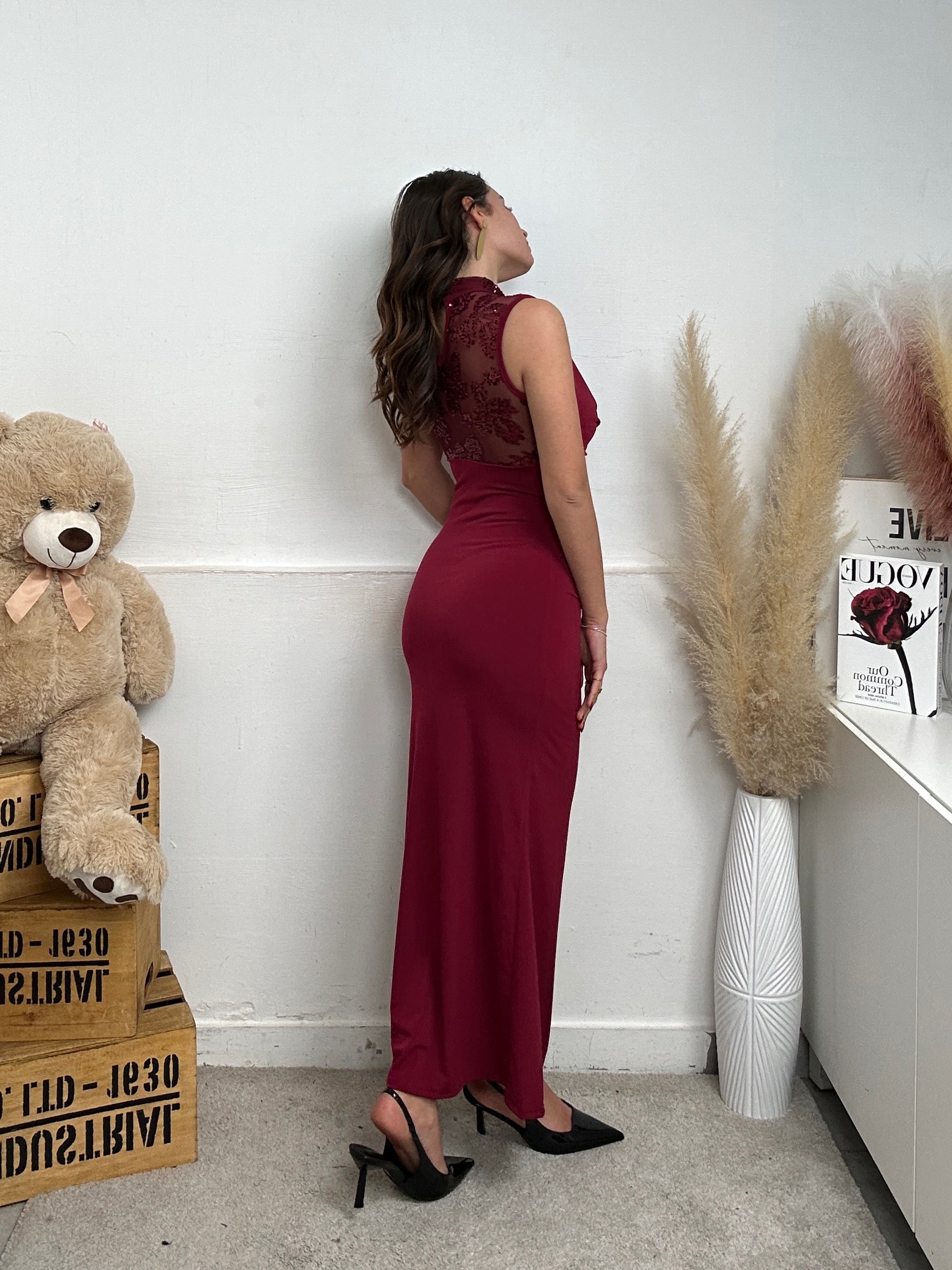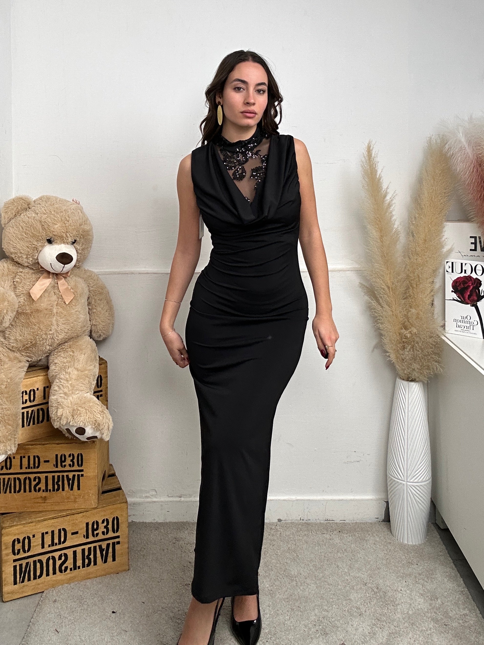 vestito LOPPY, lungo a canottiera, mezzo collo, con imbottitura sulle spalle, scollo frontale che scende e fuoriesce una parte semitrasparente con ricami floreali brillantinati sia davanti che dietro alla schiena, chiusura con bottoni dietro al collo.