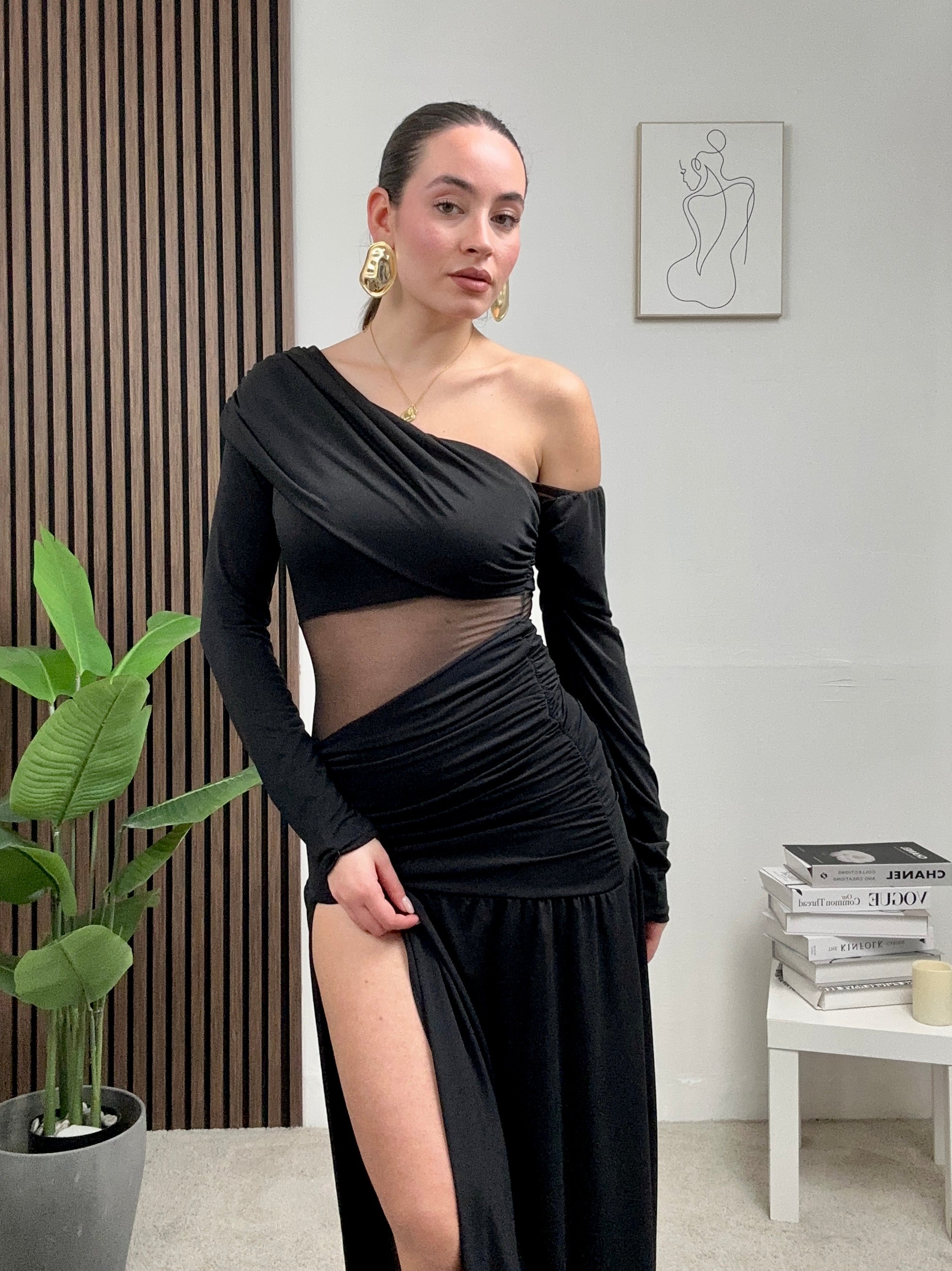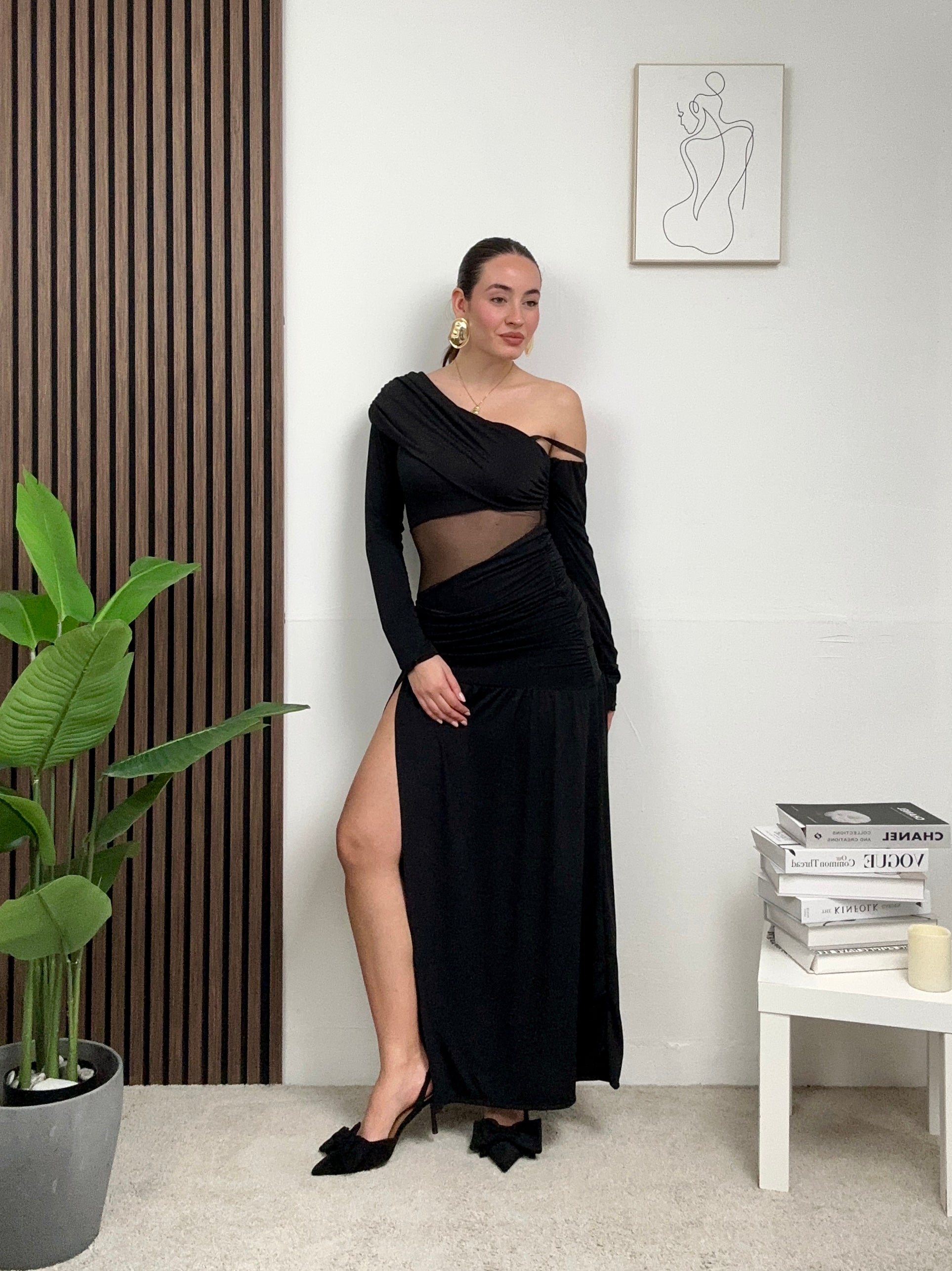 Vestito SERENA, lungo con spacco laterale, una spallina imbottita con l’altra manica che scende, con un particolare dettaglio sul fianco frontale con trasparenza.