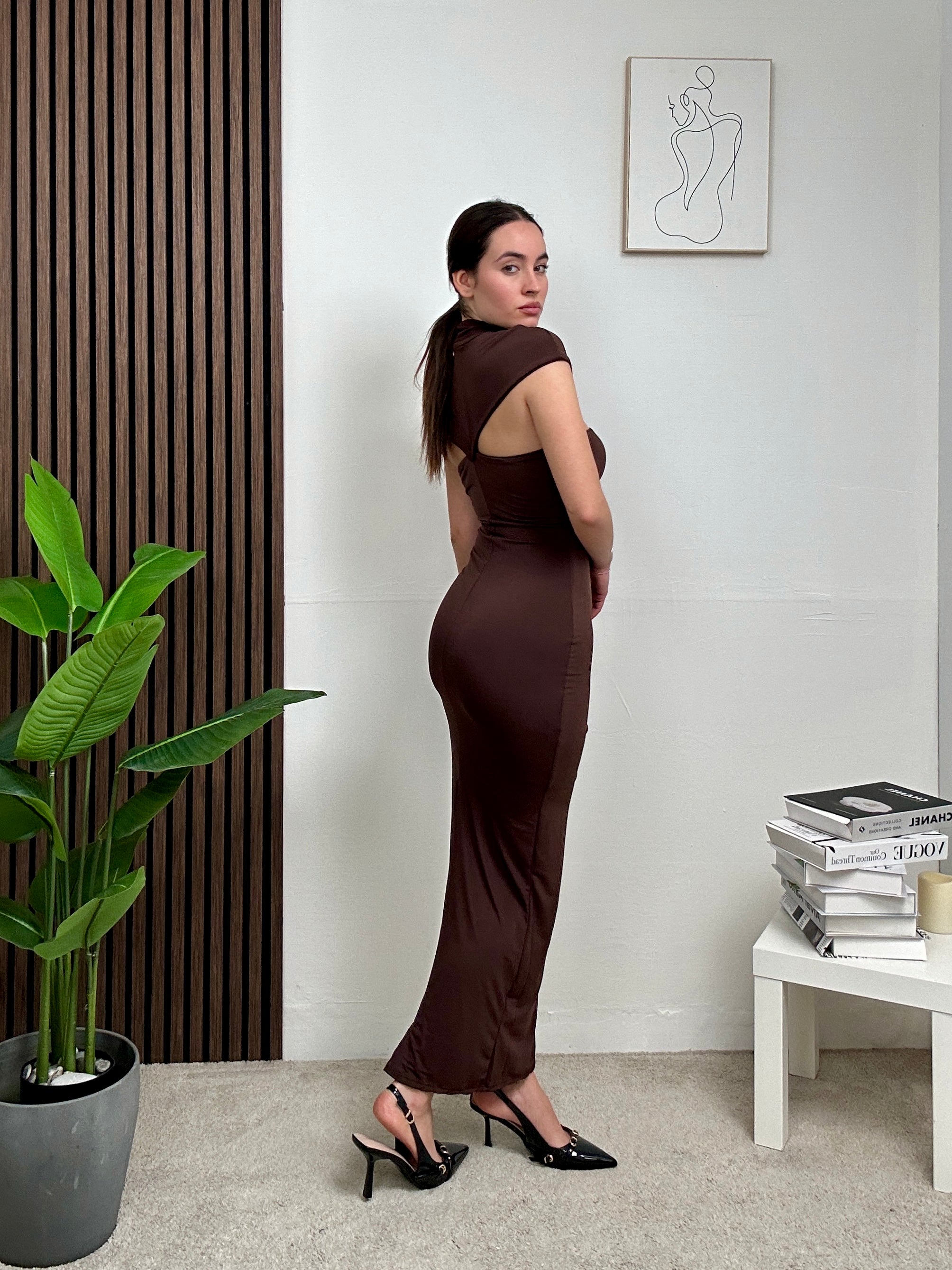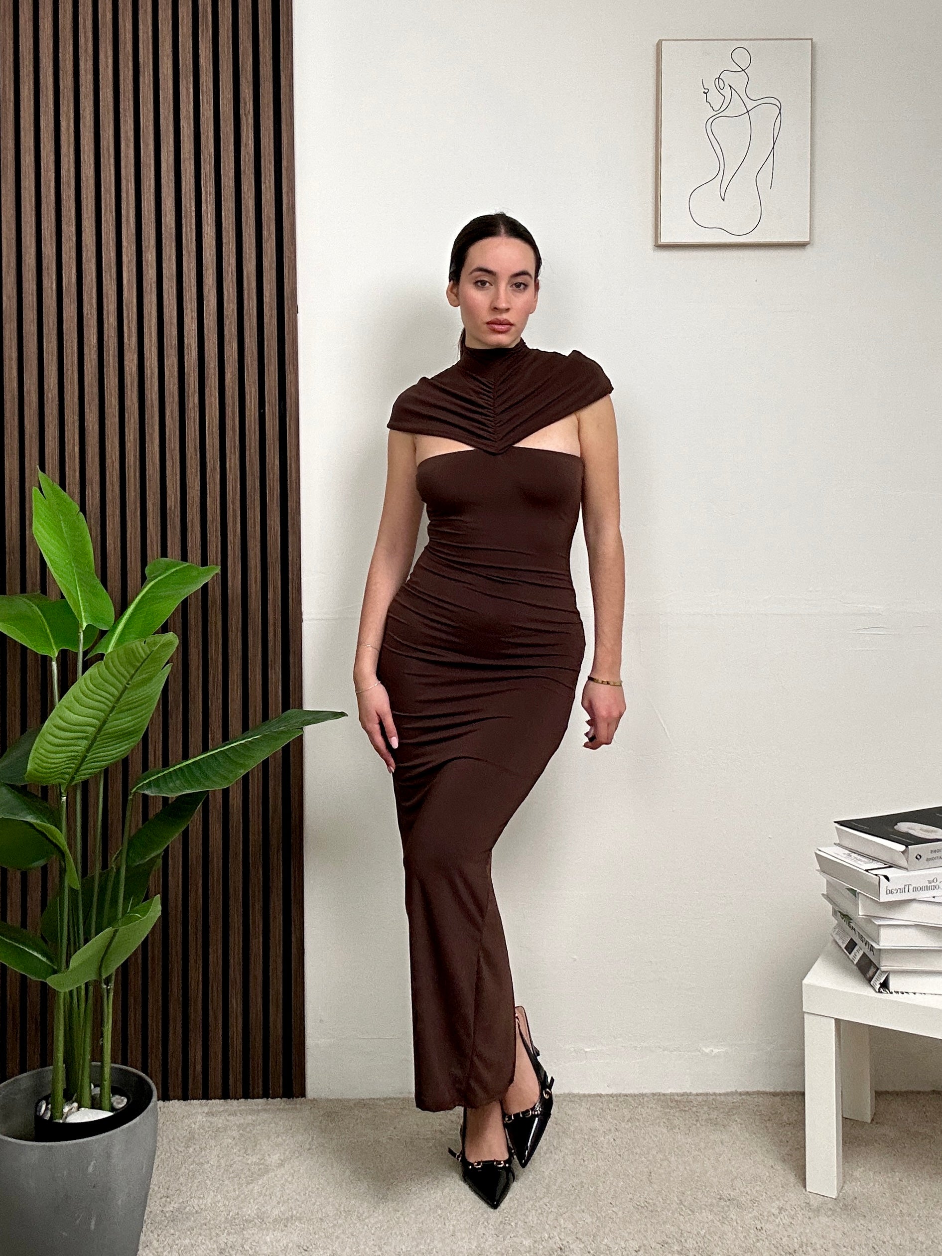 Abito midi aderente con drappeggio strategico che valorizza la silhouette. Il design asimmetrico con collo alto e scollatura a fascia crea un effetto sofisticato e moderno, mentre lo spacco frontale dona movimento.