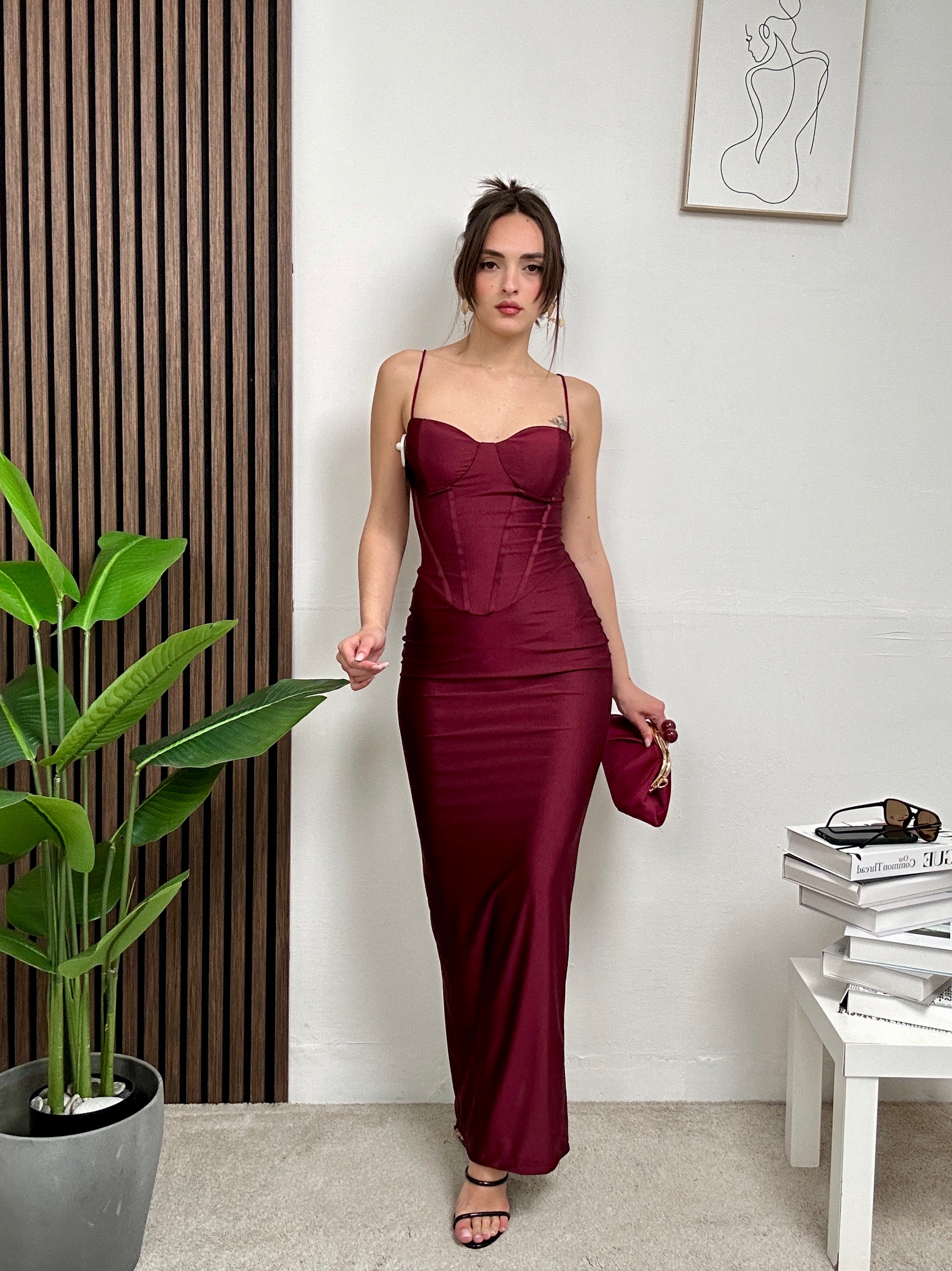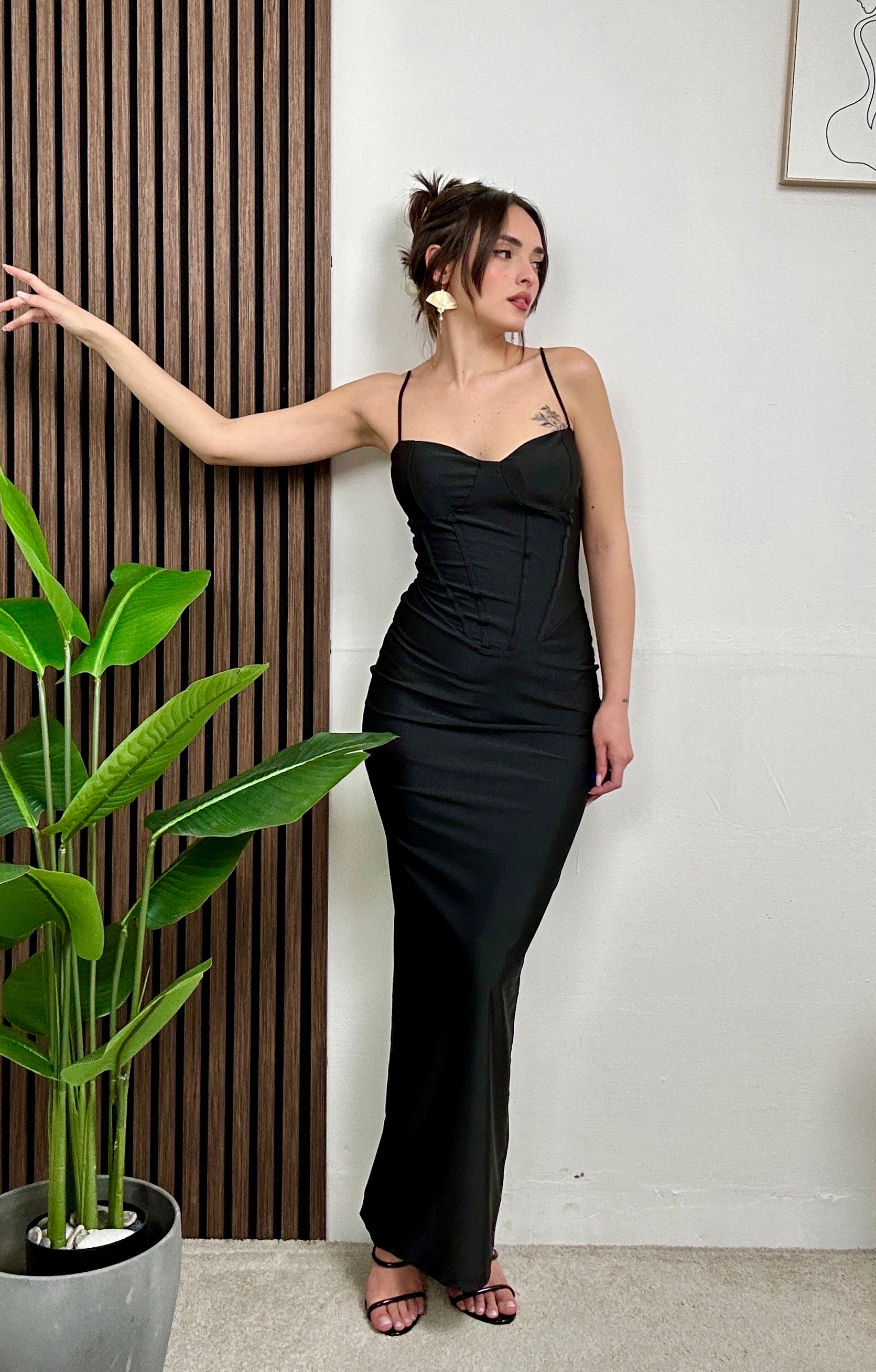 Abito SERA, lungo con scollatura a cuore con bretelle sottili, con spacco dietro, chiusura con zip dietro.
