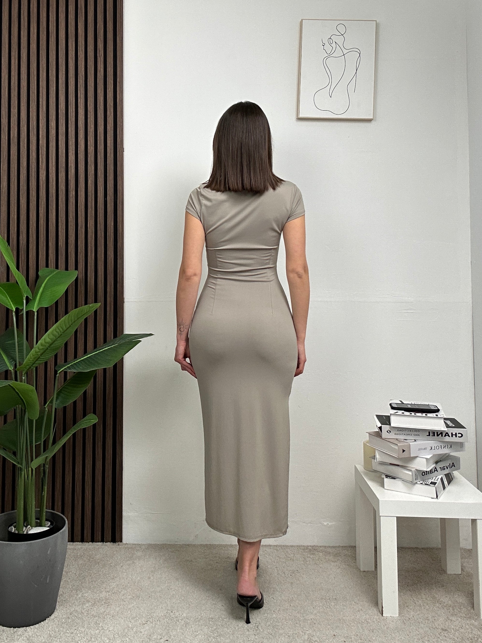 abito lungo a mezza manica con spacco laterale, aderente sul punto vita, tessuto lycra