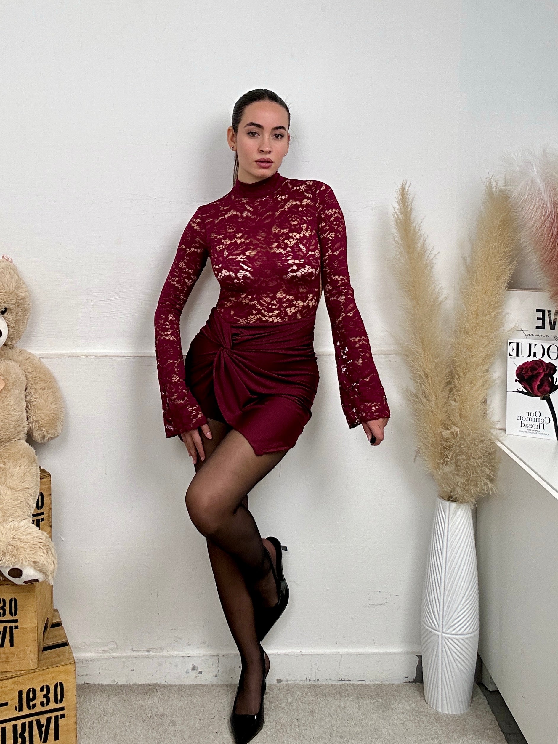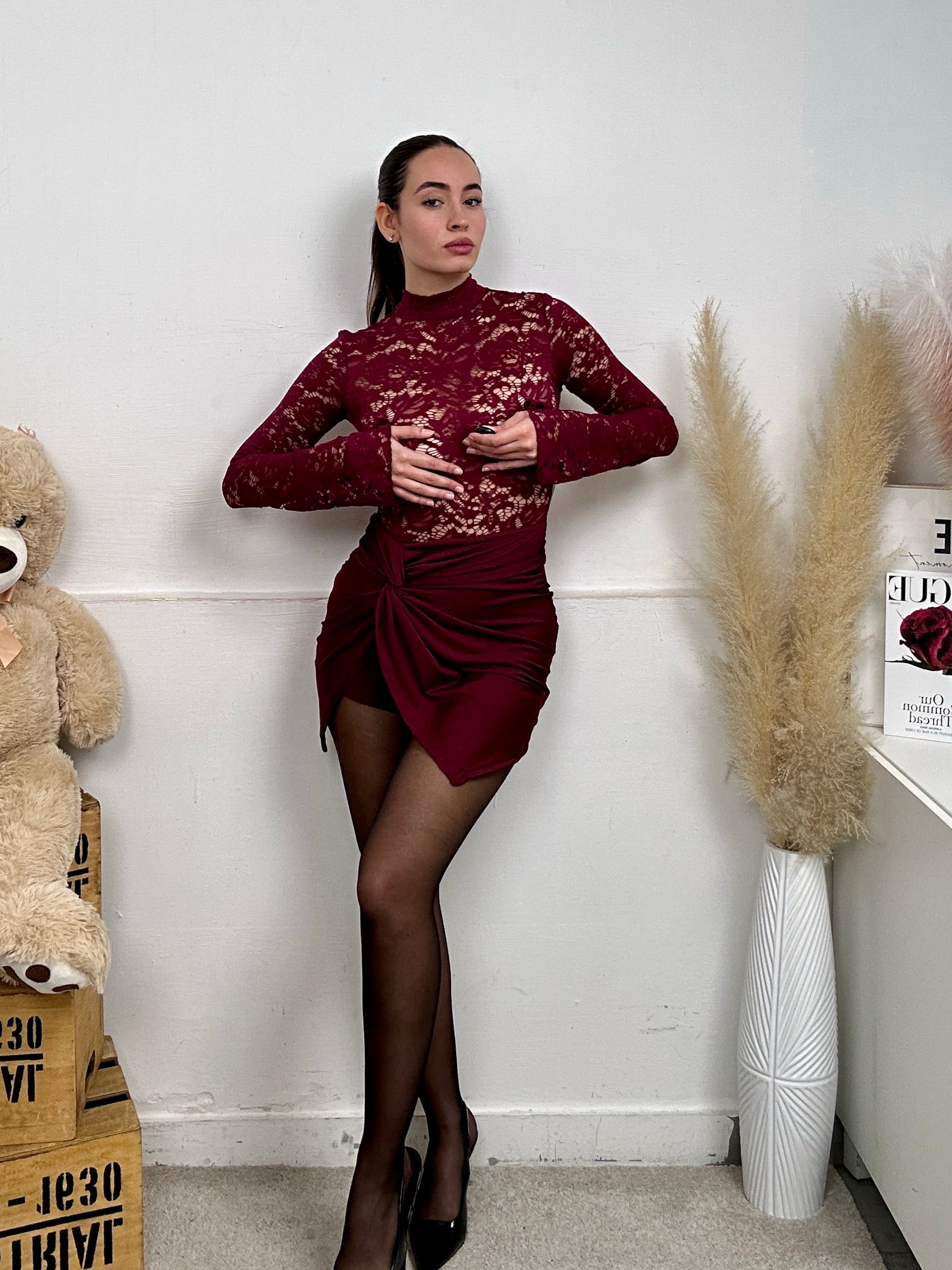 Vestito in pizzo, a maniche lunghe in pizzo con maniche a campana, mezzo collo, schiena scoperta e chiusura con bottone dietro al collo, ha il pantaloncino sotto alla gonna e presenta noto frontalmente.