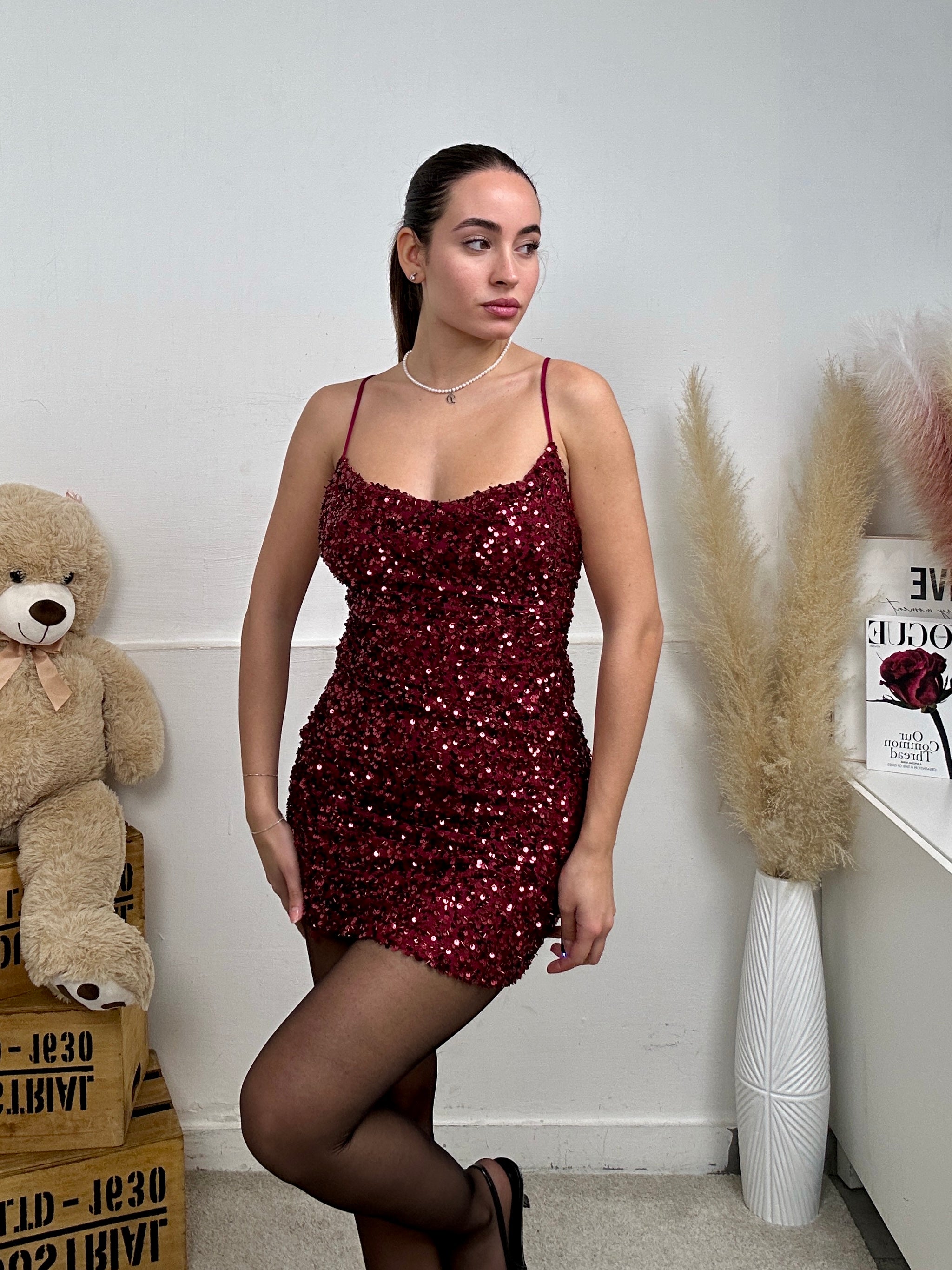 Vestito SEQUINS, corto, con spalline e tantissime paillettes.