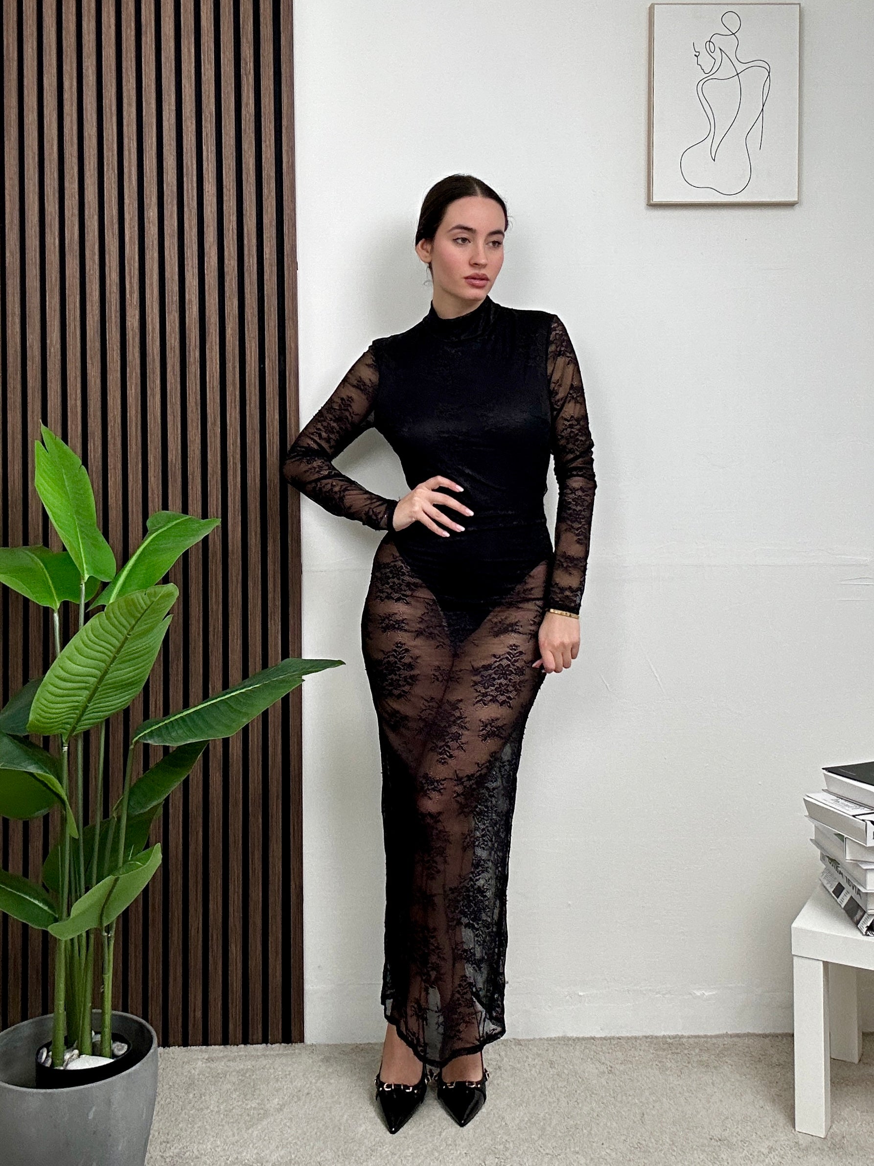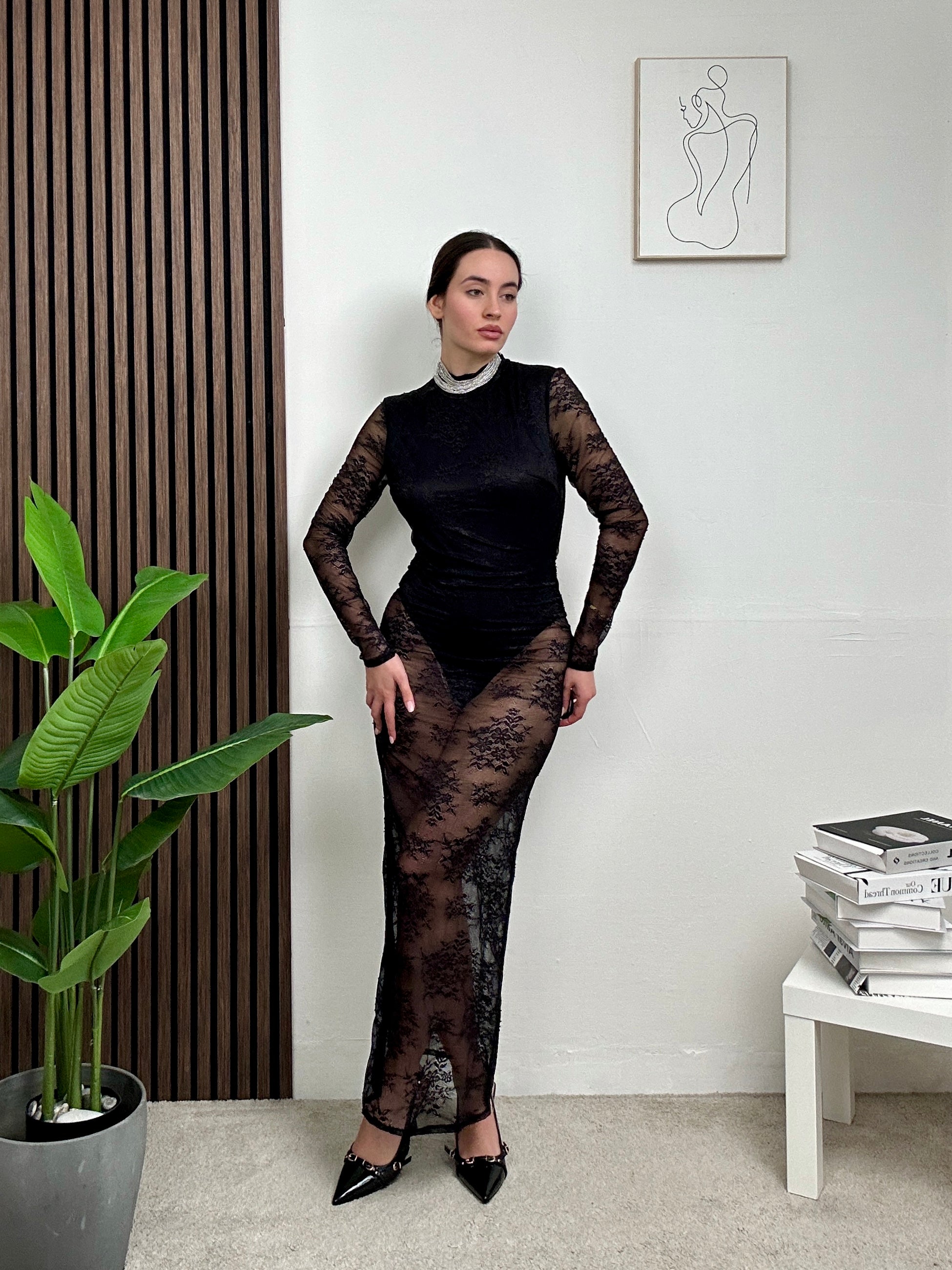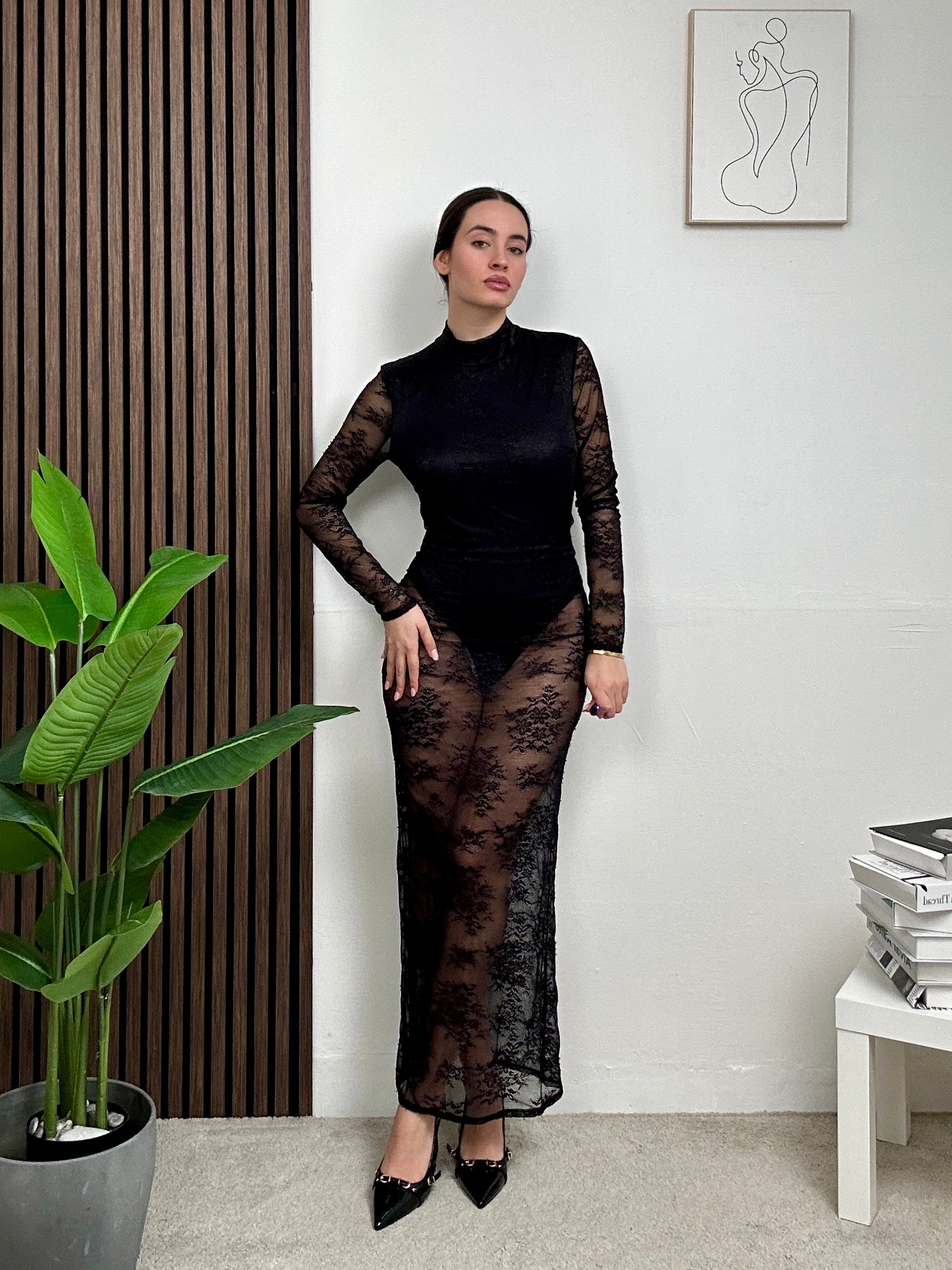 Abito lungo in pizzo nero con body integrato, realizzato in tessuto trasparente effetto vedo-non-vedo. Modello aderente con maniche lunghe, schiena scoperta e linea che valorizza la silhouette. Il body interno garantisce copertura e comfort, mentre il pizzo floreale dona un tocco elegante e sensuale