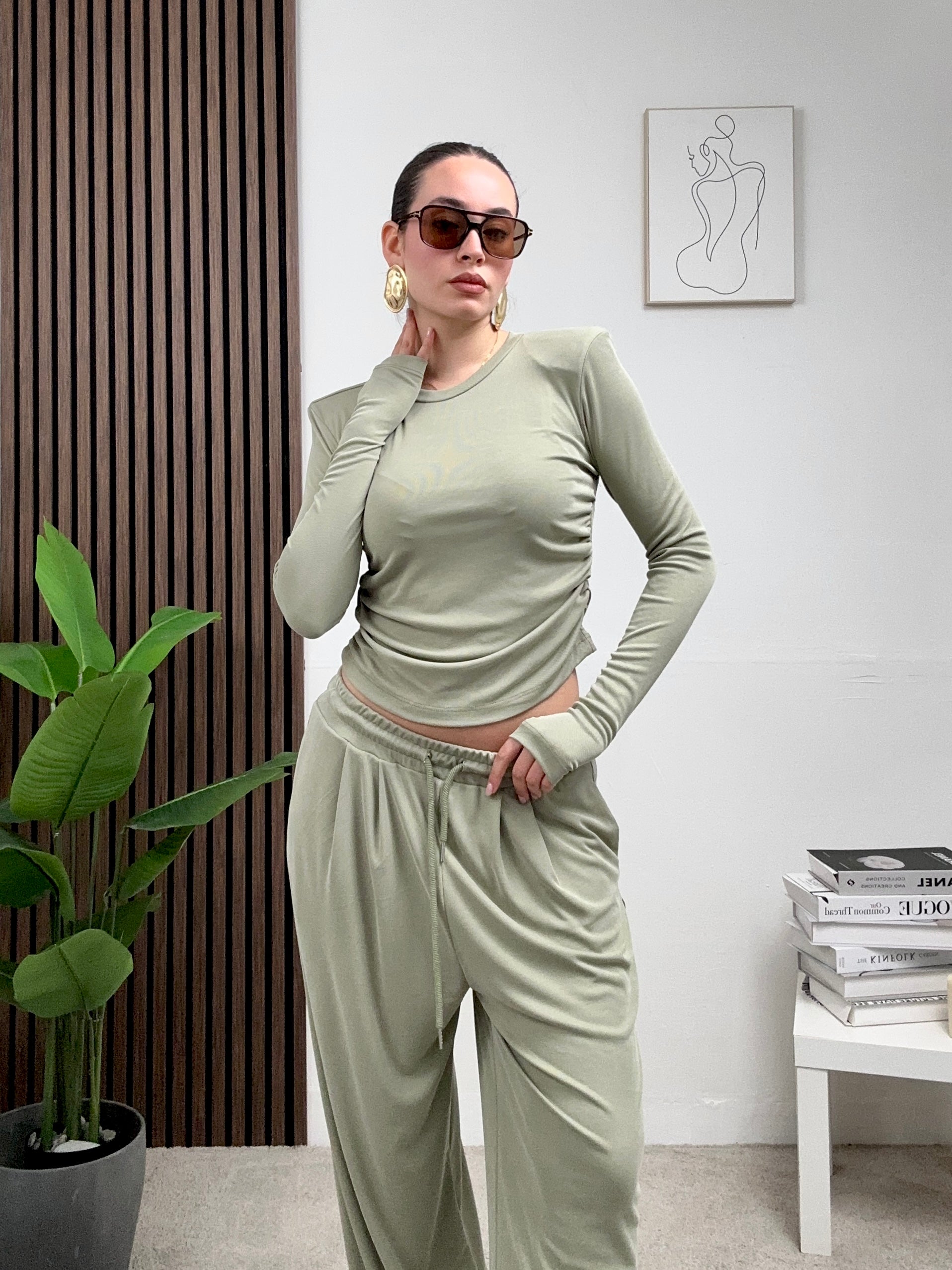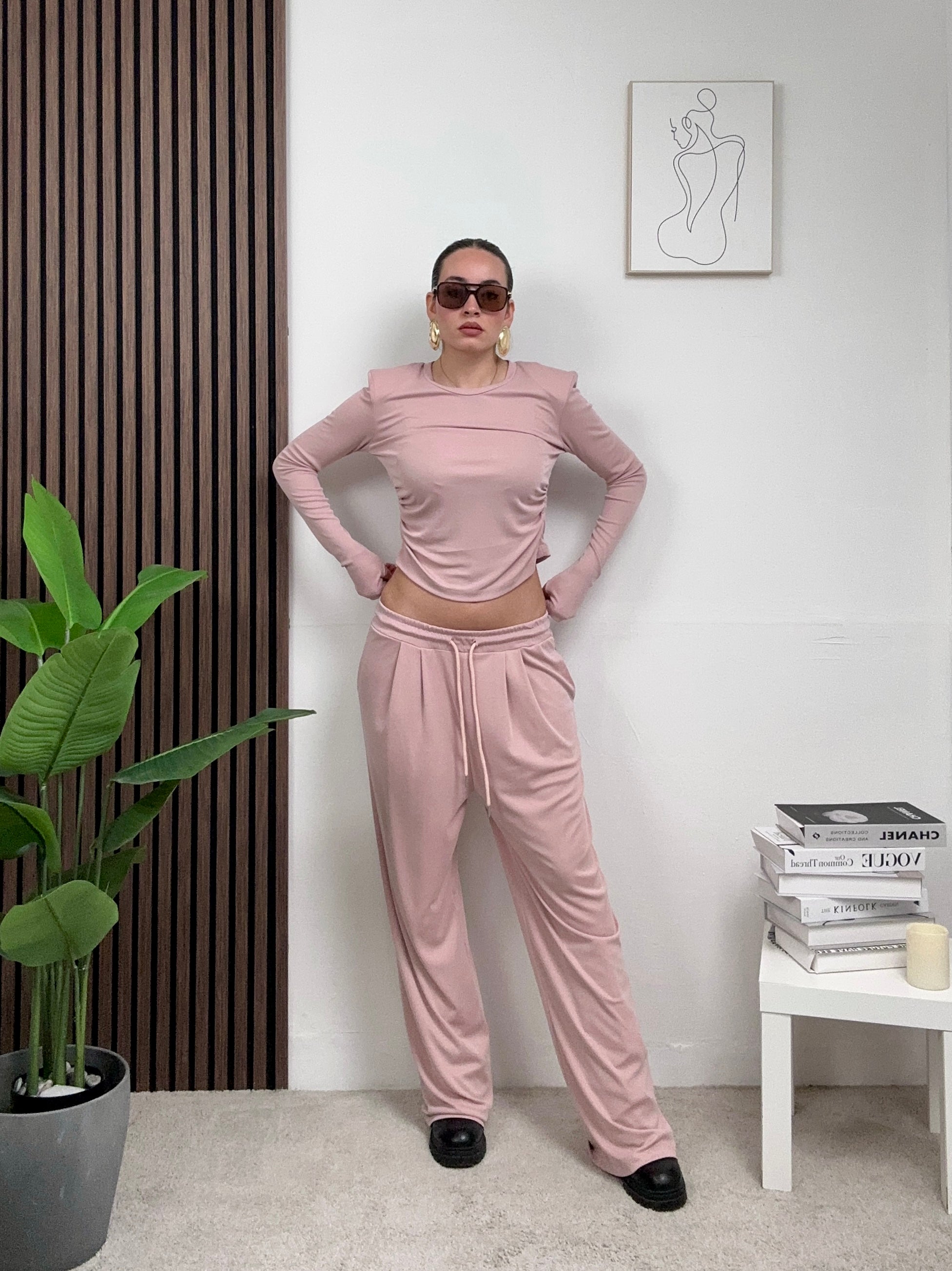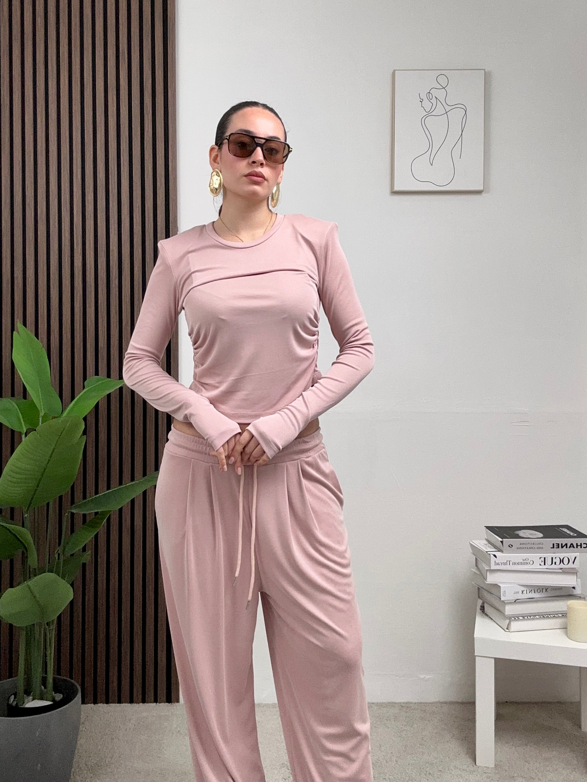 Coordinato COMODO, presenta il pantalone a palazzo elasticizzato con molla in vita, tasche frontali e chiusura con laccetti in vita frontale, e maglia corta a maniche lunghe con spalline imbottite e scollo rotondo.