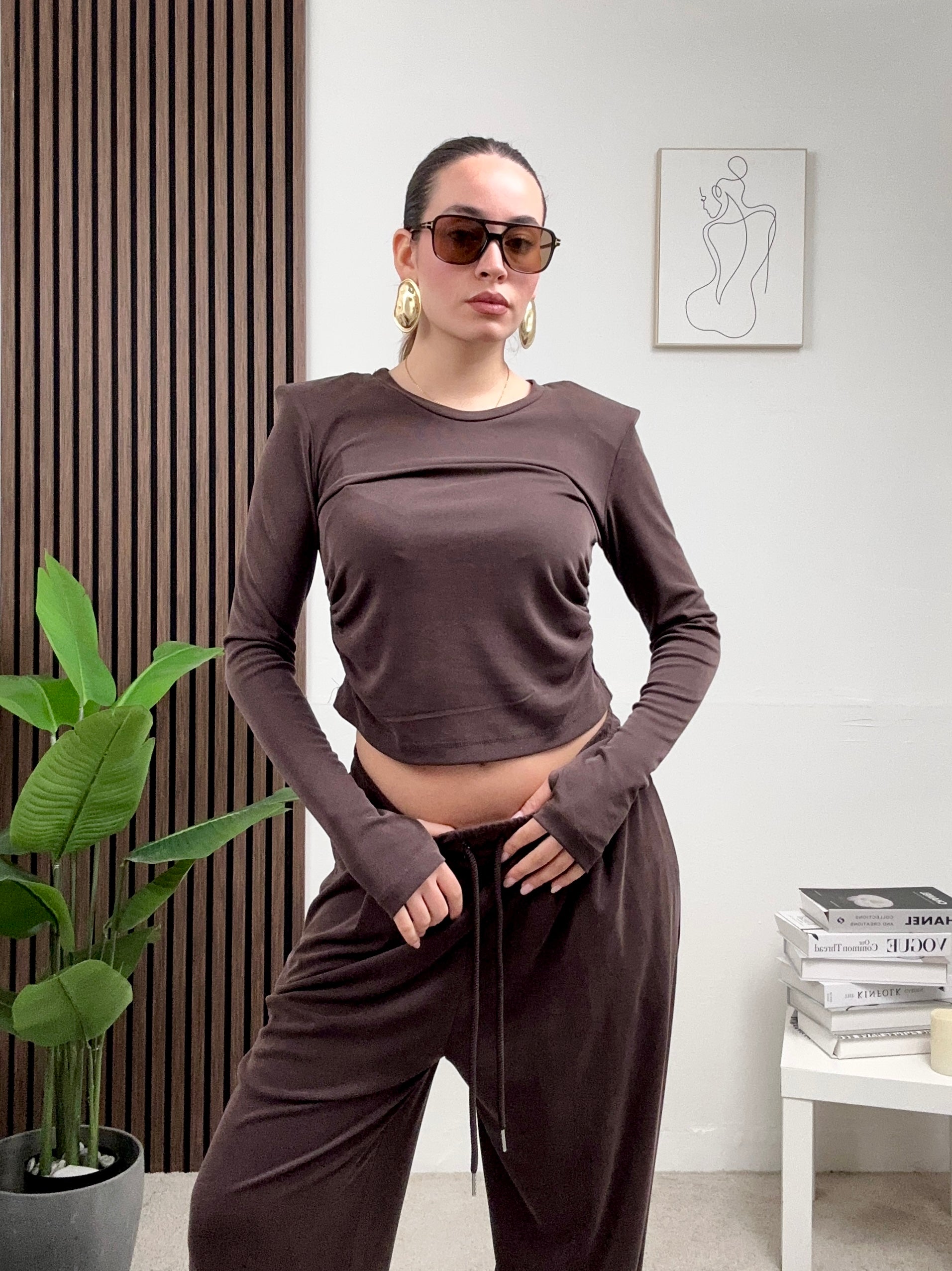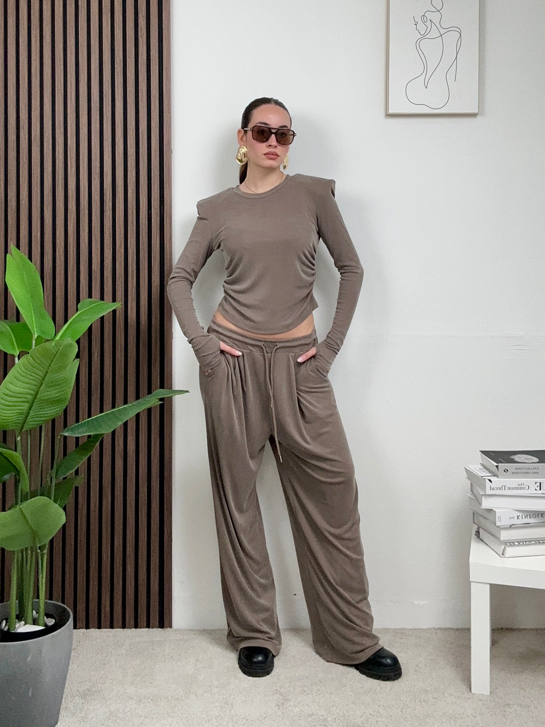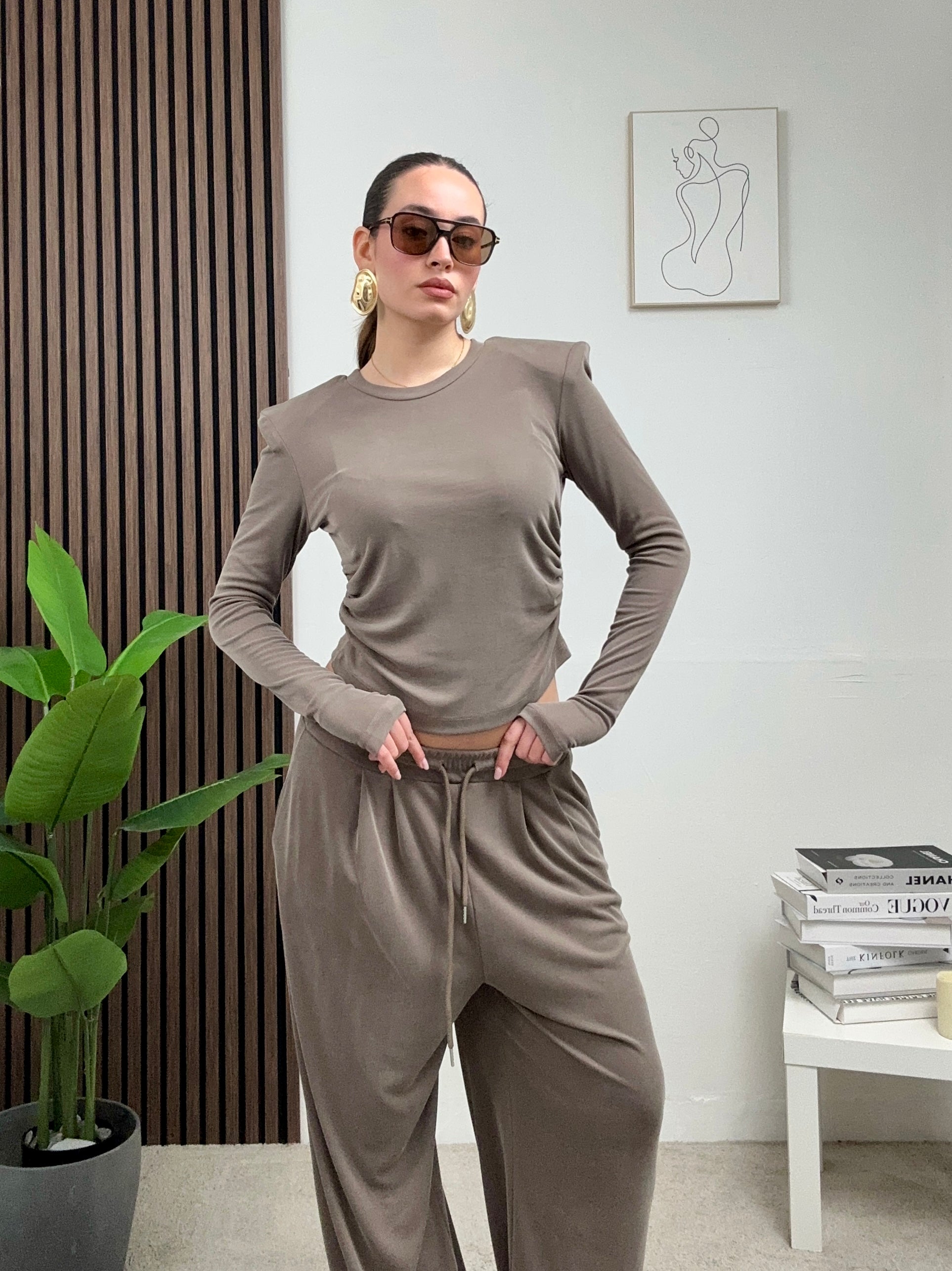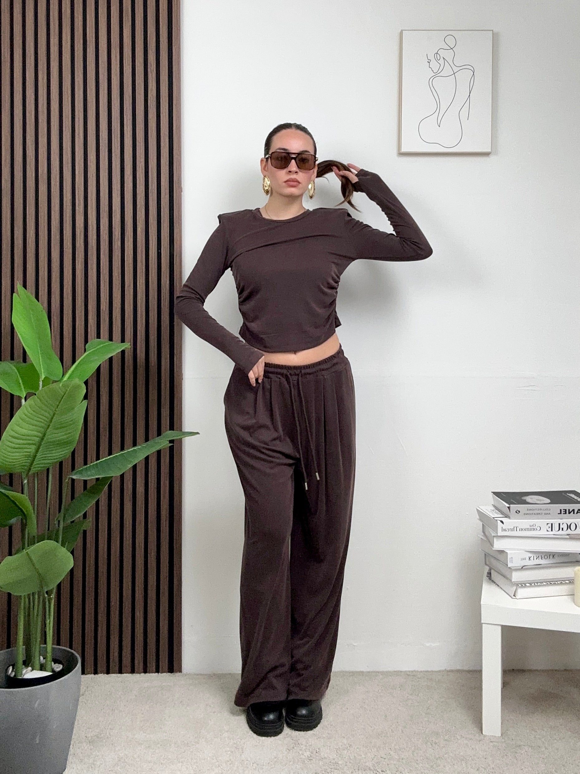 Coordinato COMODO, presenta il pantalone a palazzo elasticizzato con molla in vita, tasche frontali e chiusura con laccetti in vita frontale, e maglia corta a maniche lunghe con spalline imbottite e scollo rotondo.