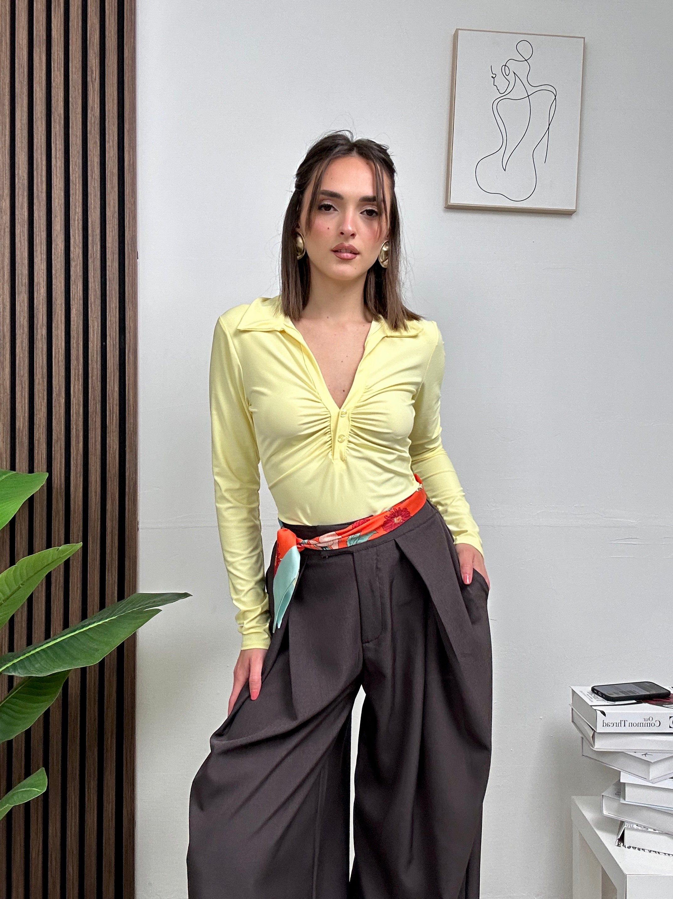 Body WOMEN, in lycra con uno scollo a V con bottoncini frontali con maniche lunghe, leggermente aggrappato vicino al seno con colletto largo
