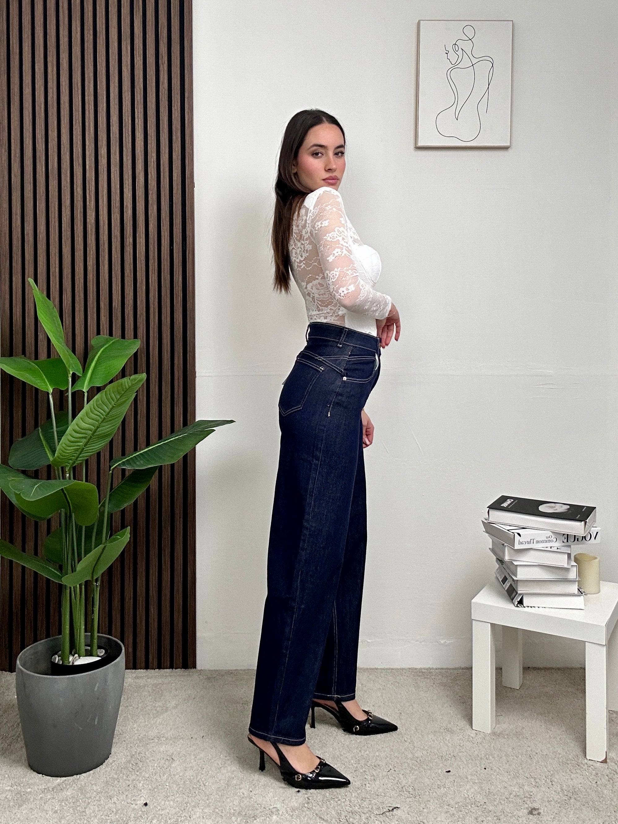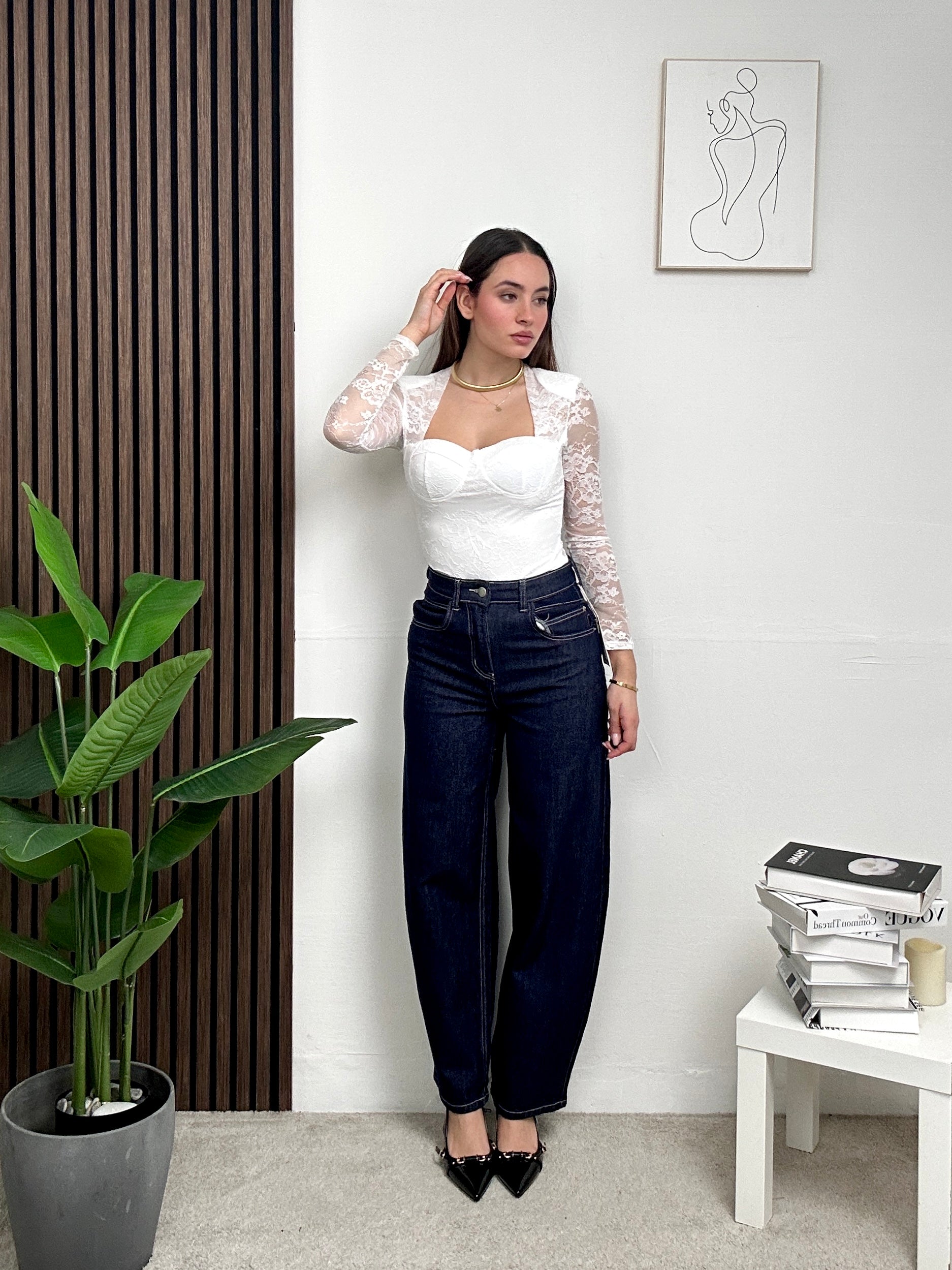Body in pizzo, a maniche lunghe con scollo quadrato, coppe all’interno, totalmente in pizzo.