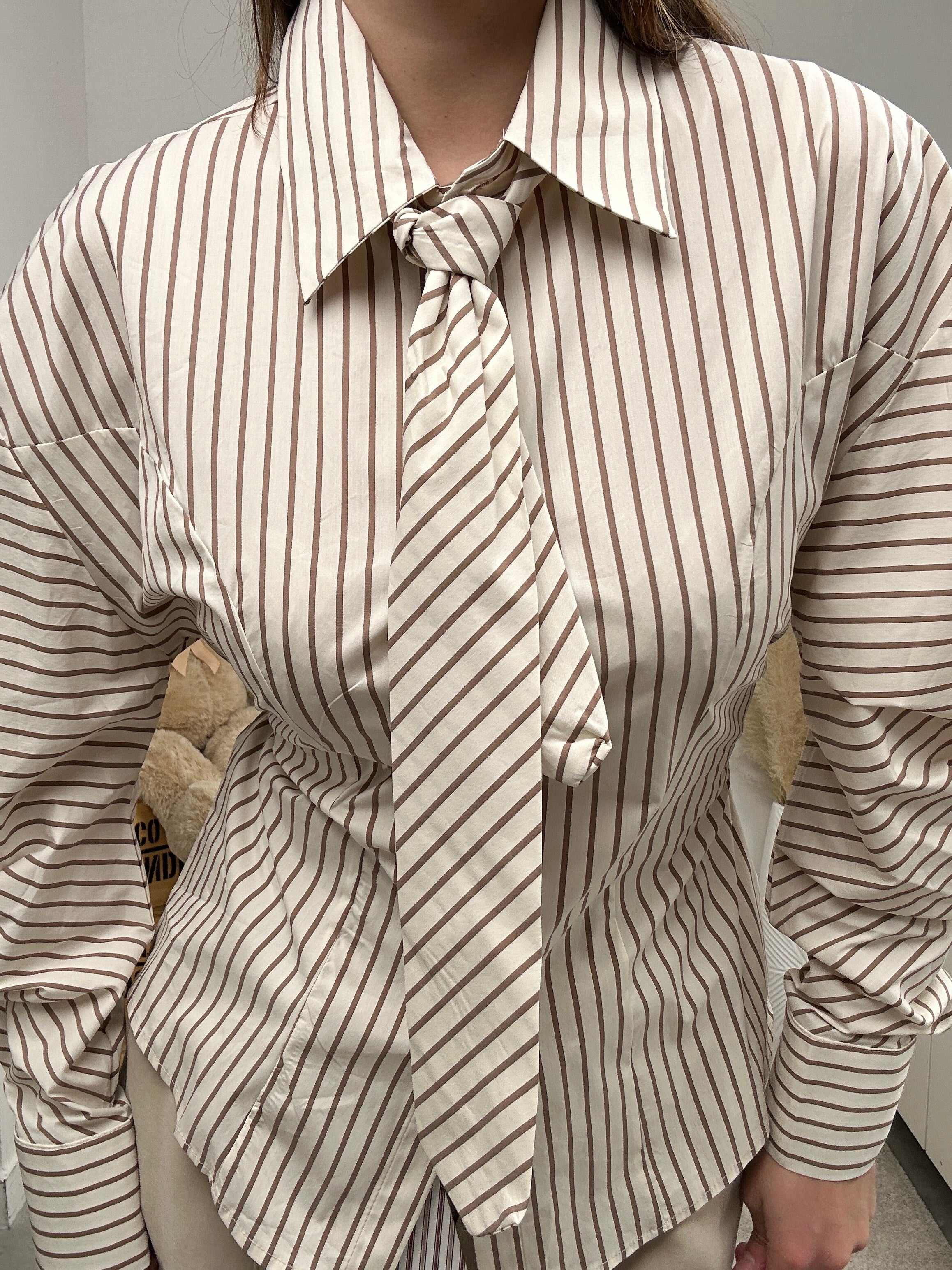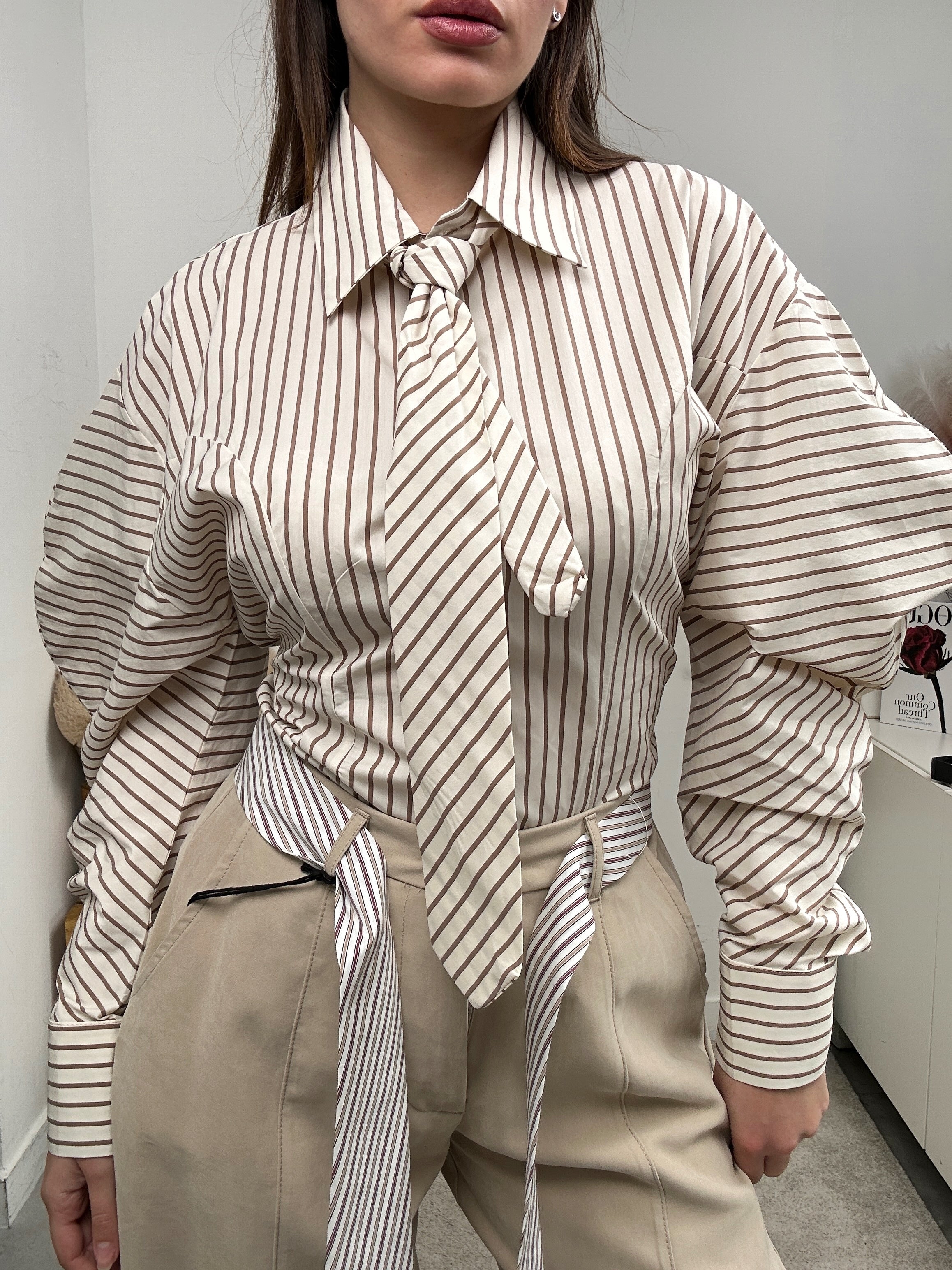 Camicia a RIGHE, lunga e oversize con maniche lunghe a sbuffo, colletto, chiusura con bottoni frontali, cravatta a righe e cintura con fiocco dietro.