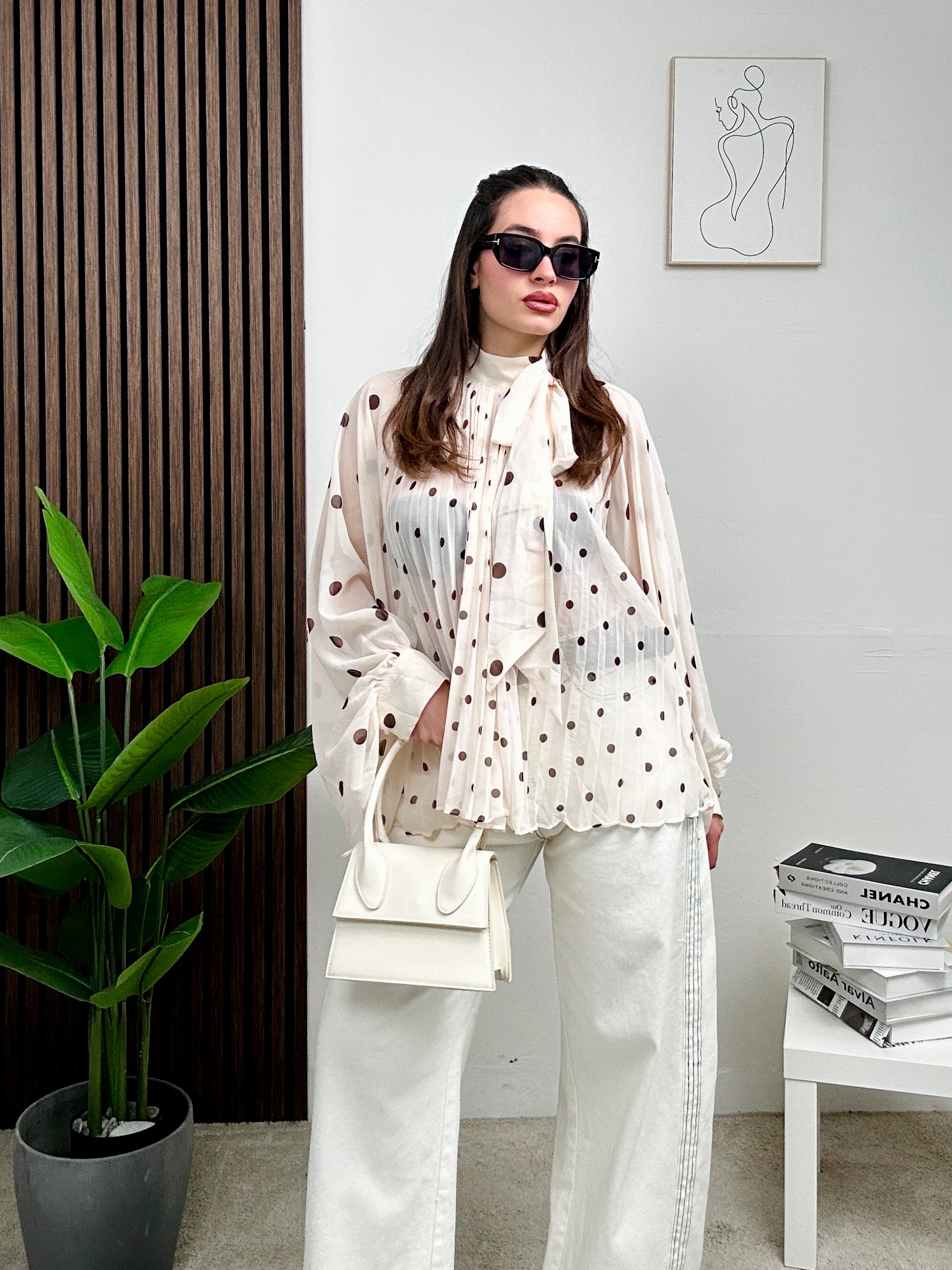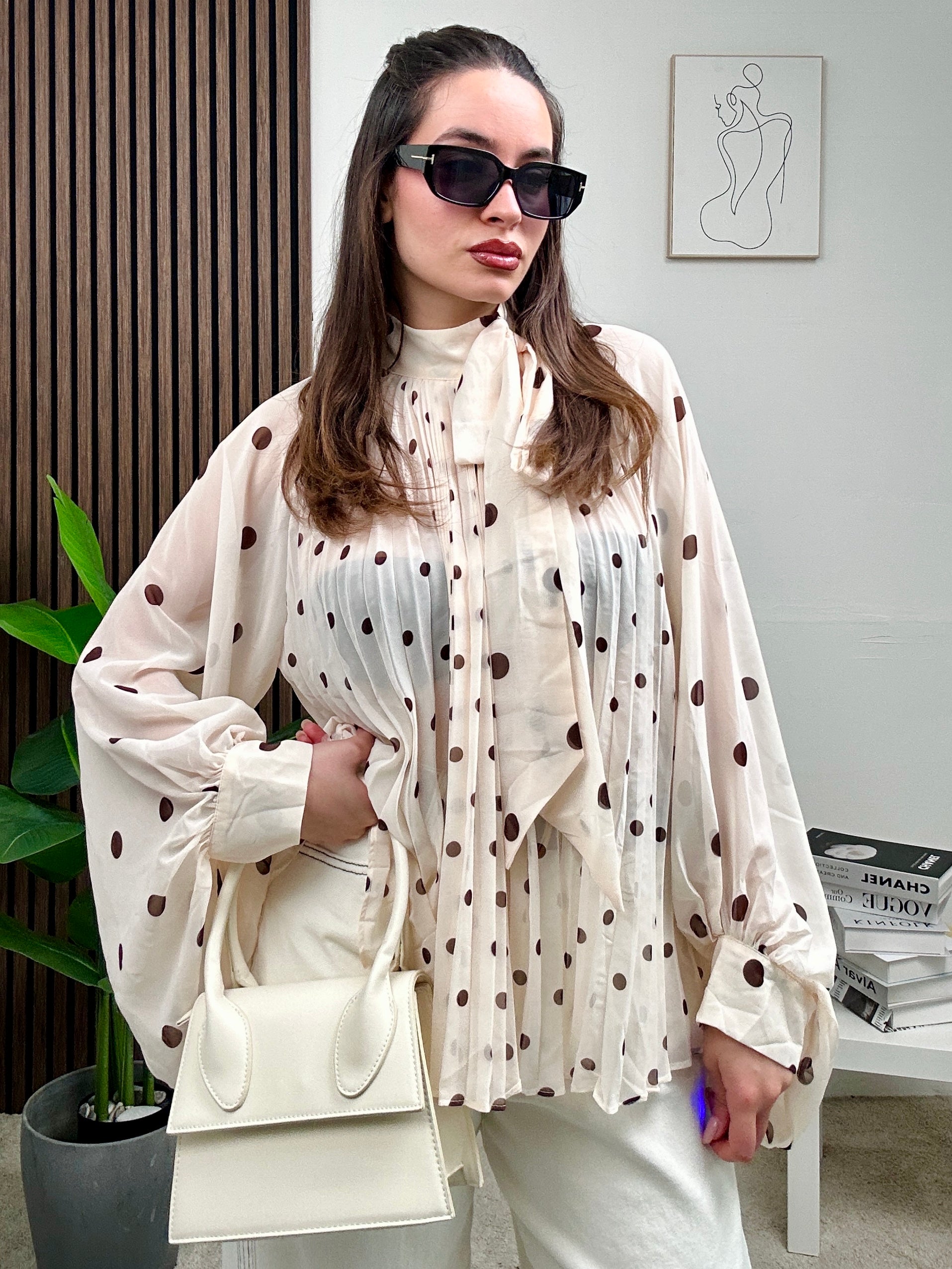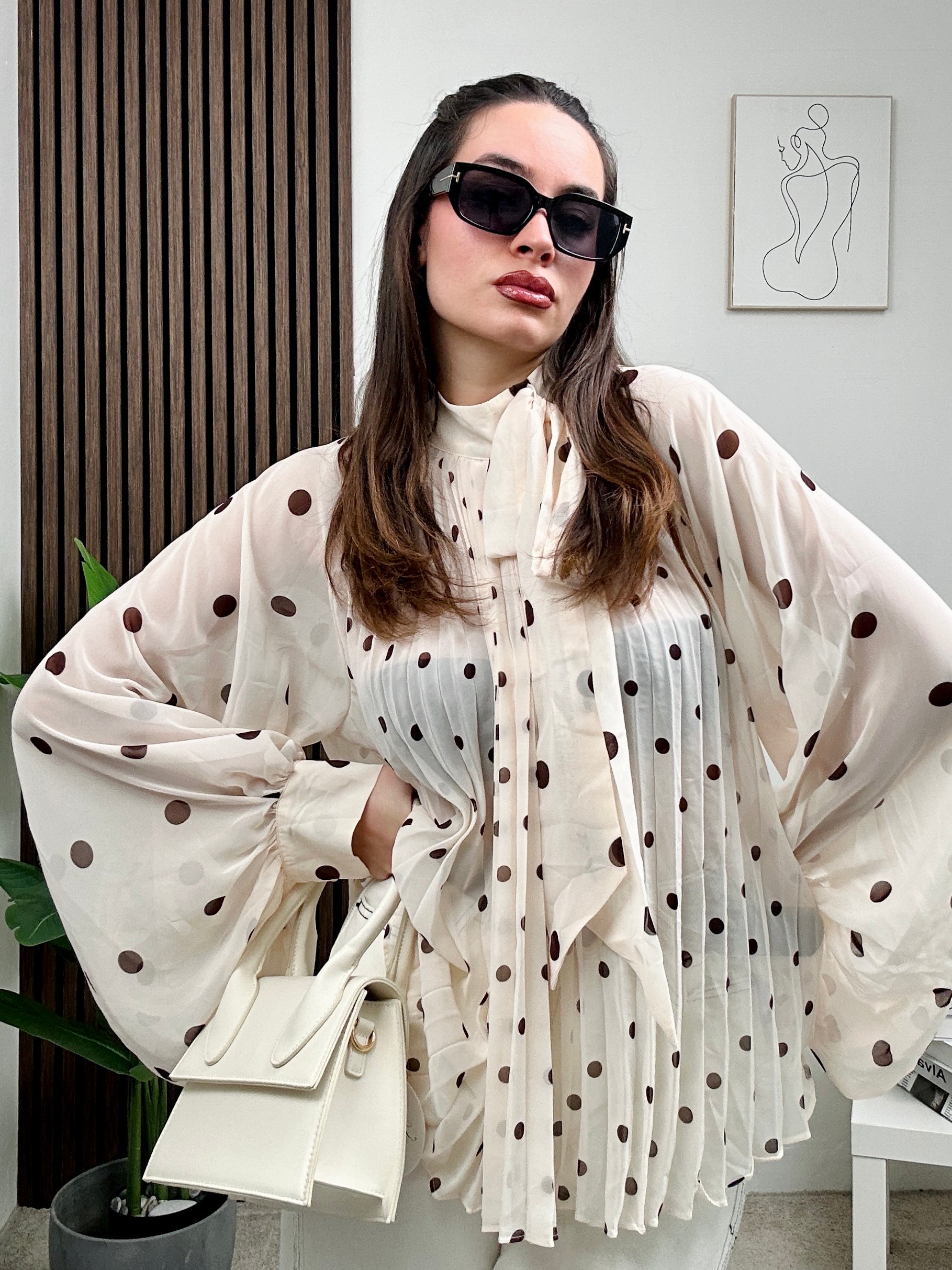 Camicia over, a pois, lunga a maniche lunghe con chiusura con fiocco frontale.