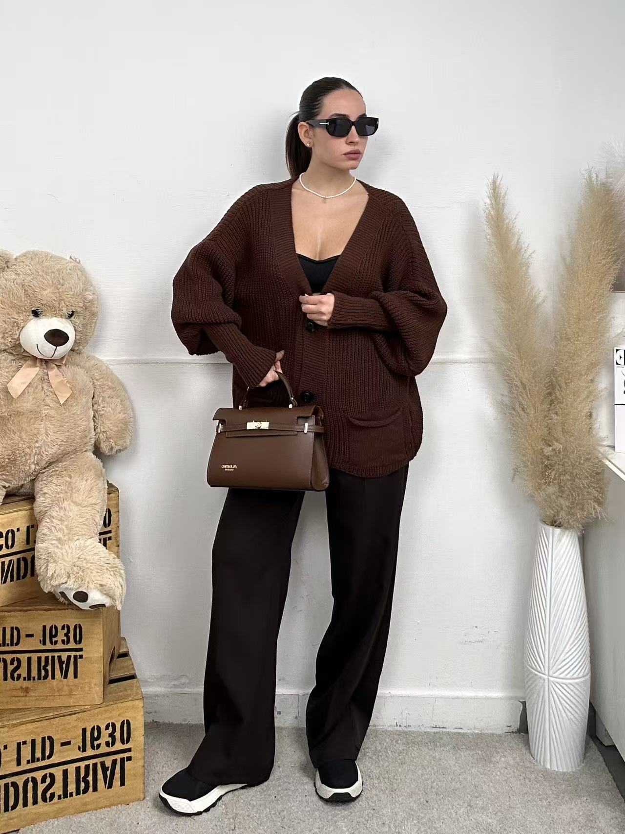 Cardigan Lungo, con scollo a V, chiusura con bottoni frontale, tasche frontali e maniche a sbuffo e finiscono sulla mano strette.