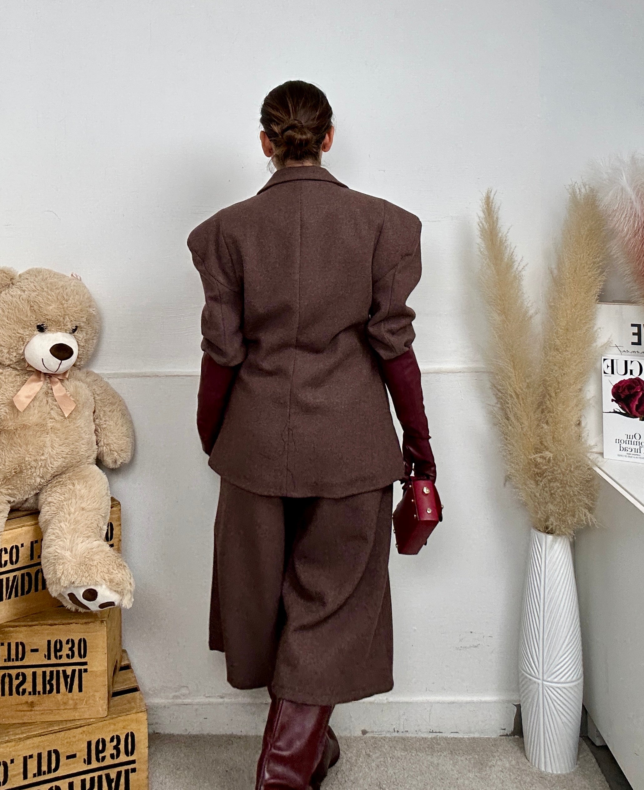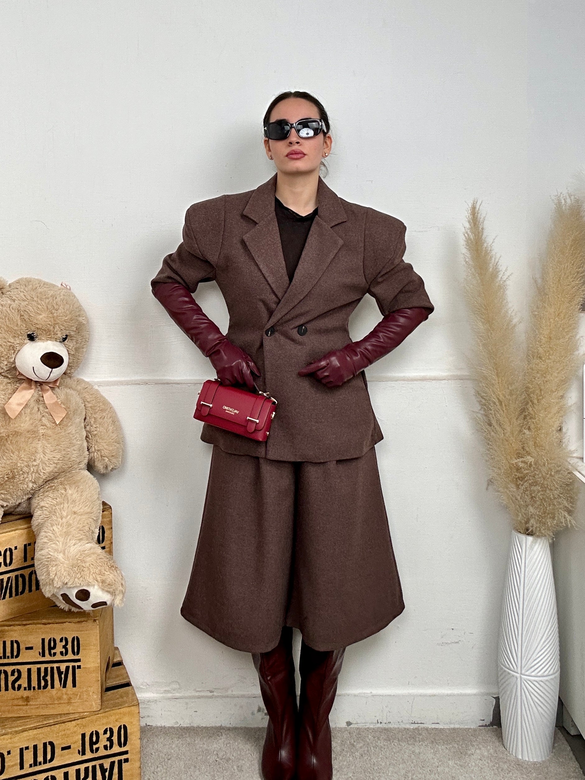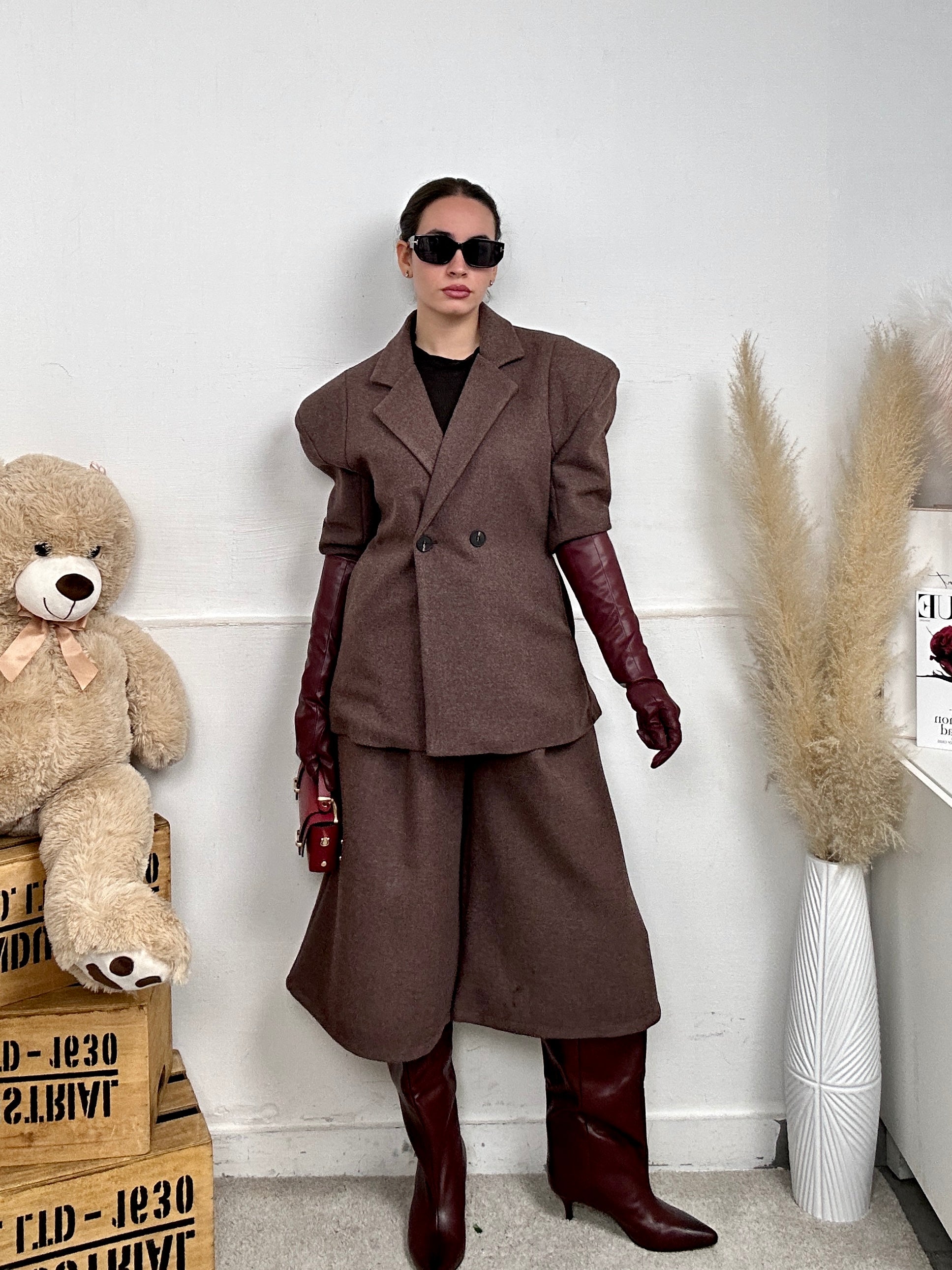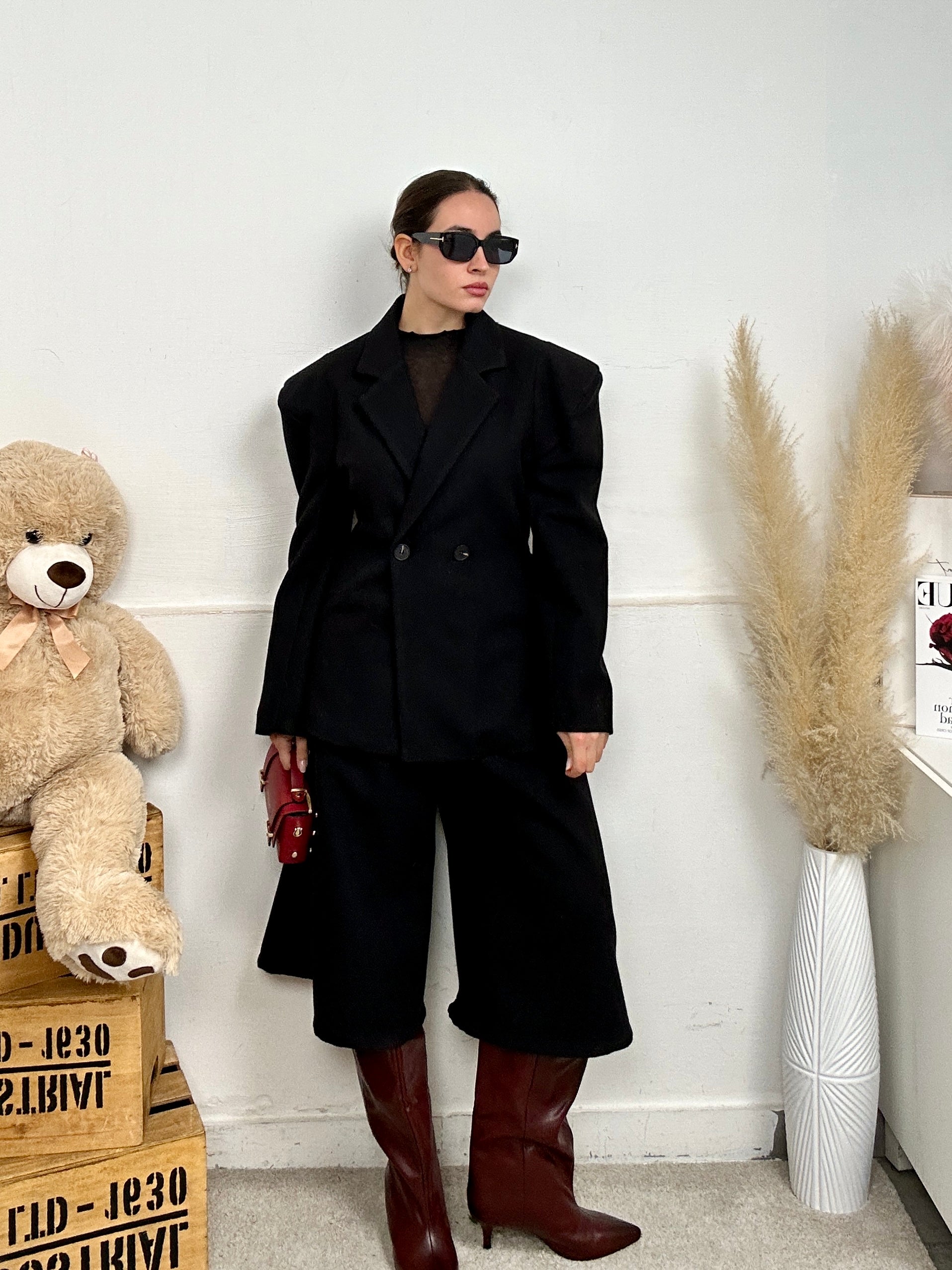 Coordinato SAM, presenta giacca lunga a maniche lunghe, con spalline imbottite, scollo a V, colletto e chiusura con bottoni frontali, e bermuda ampio, elasticizzato con molla dietro e con chiusura con bottone e zip.
