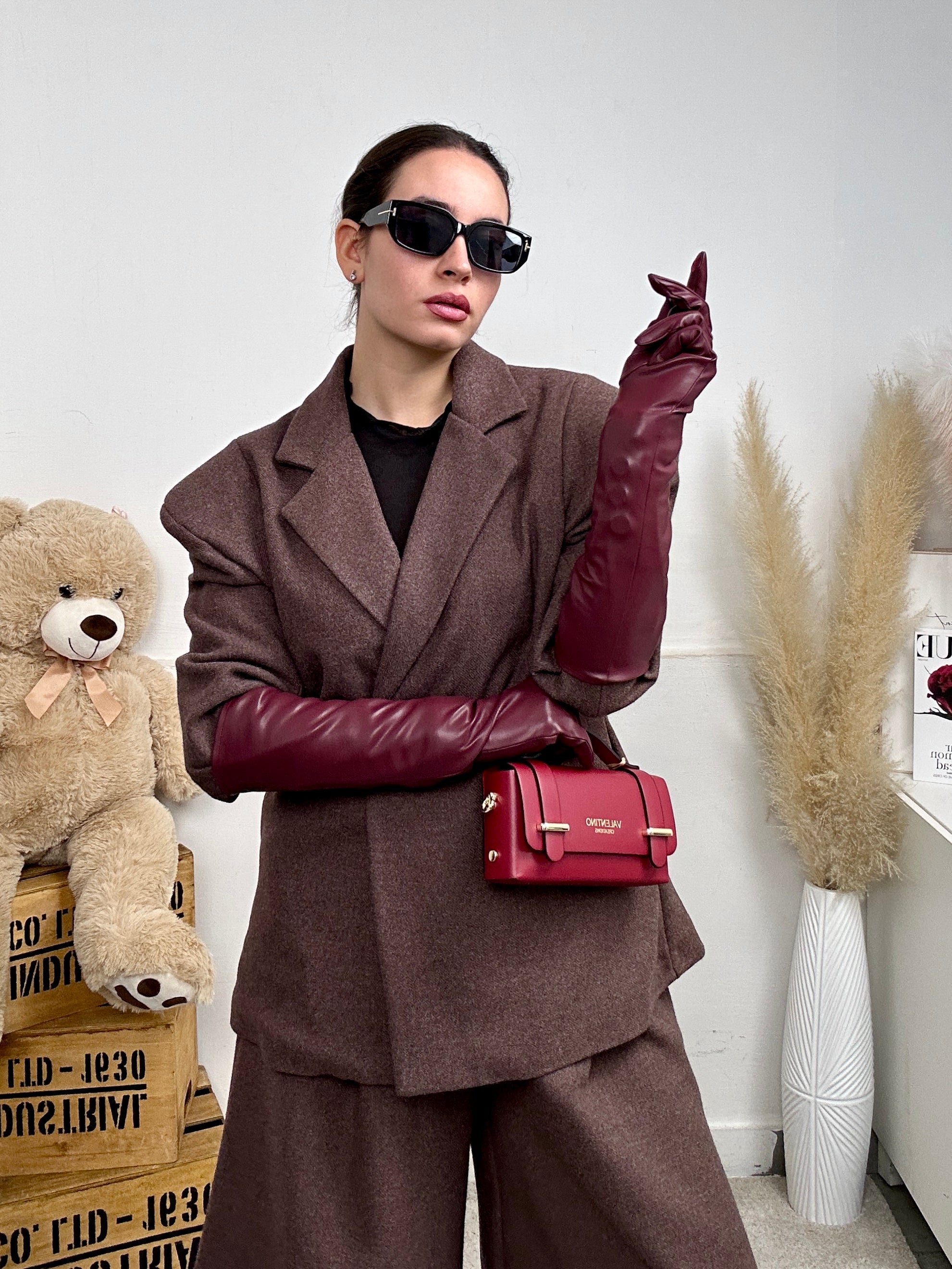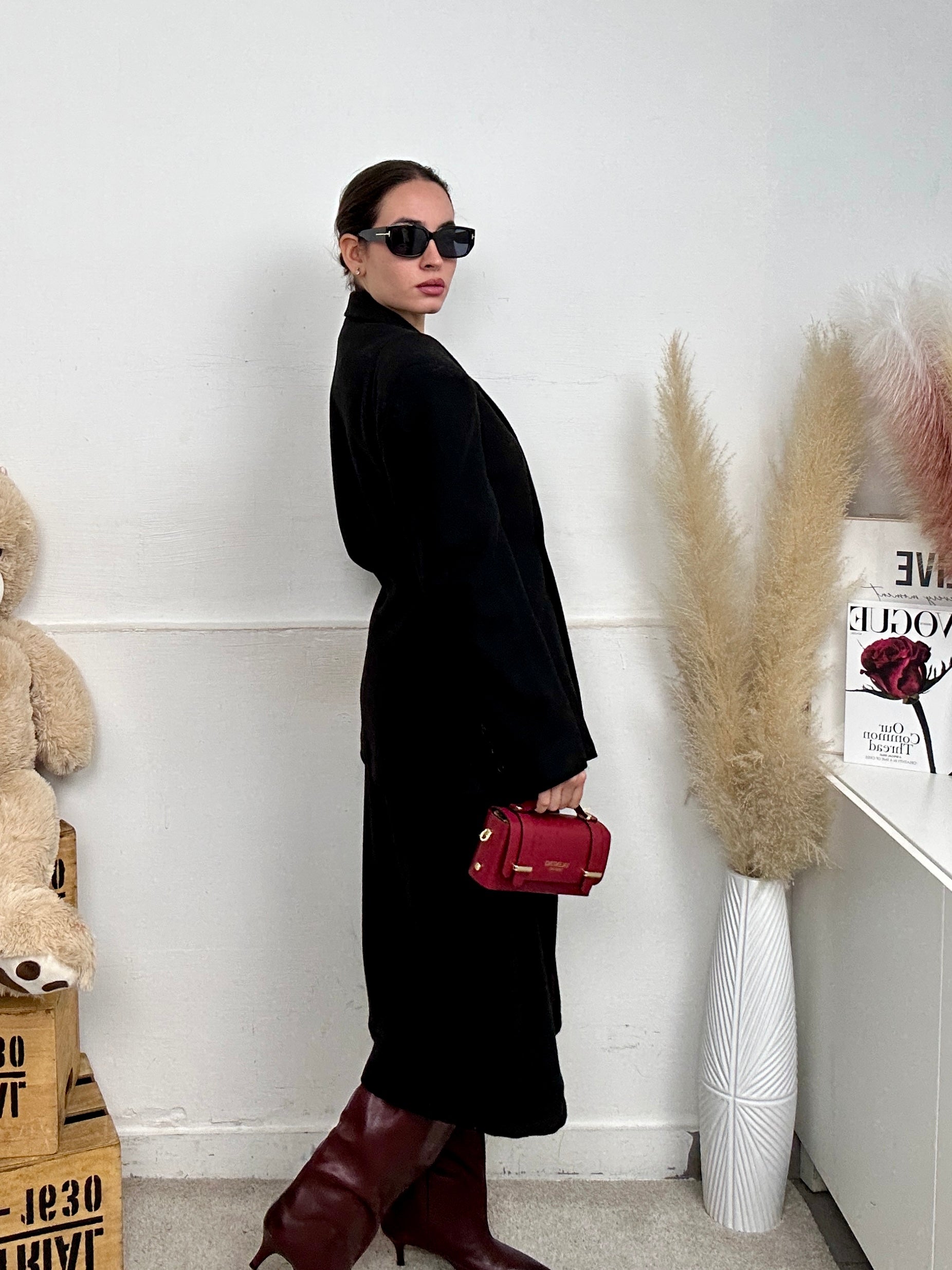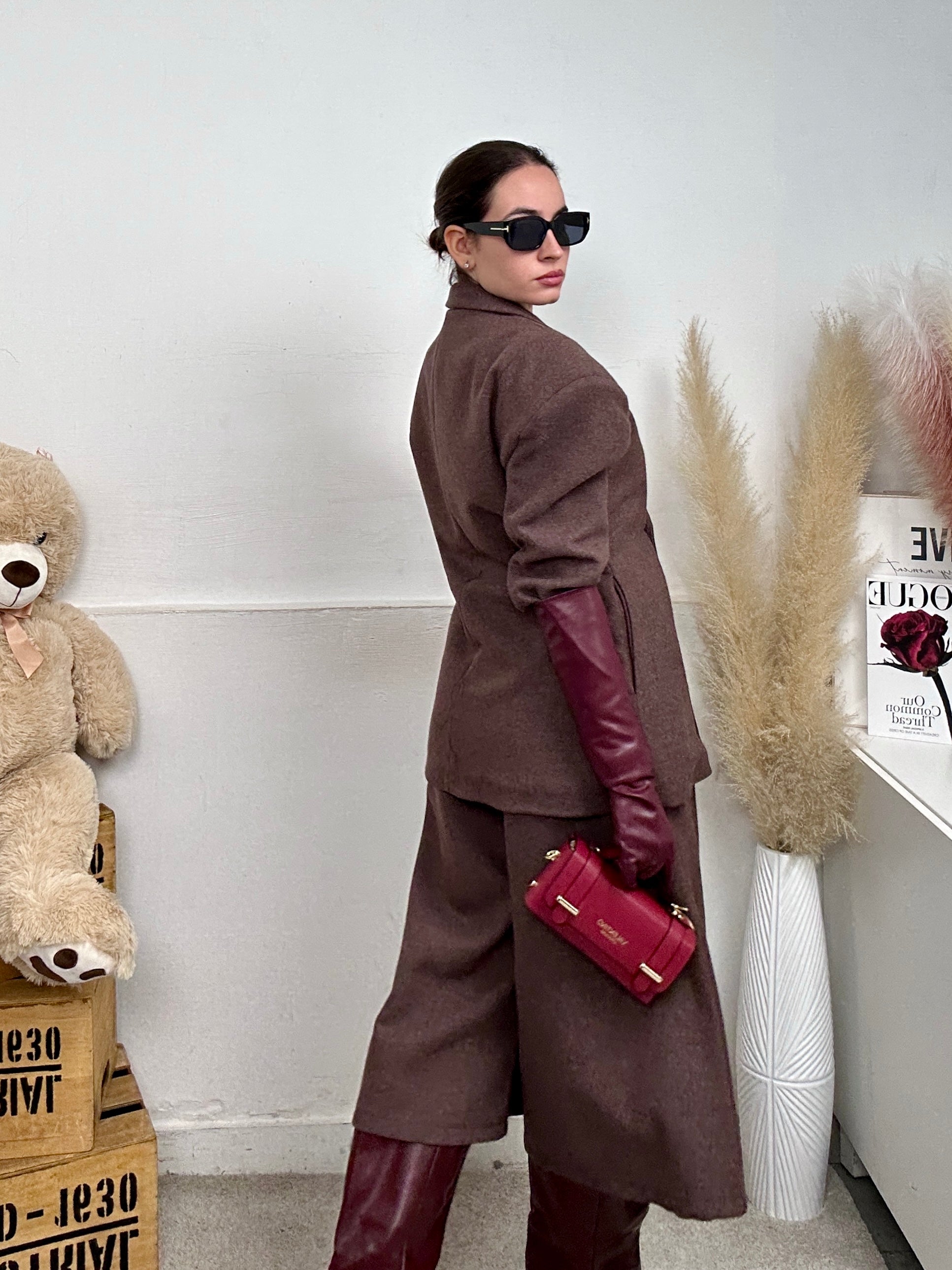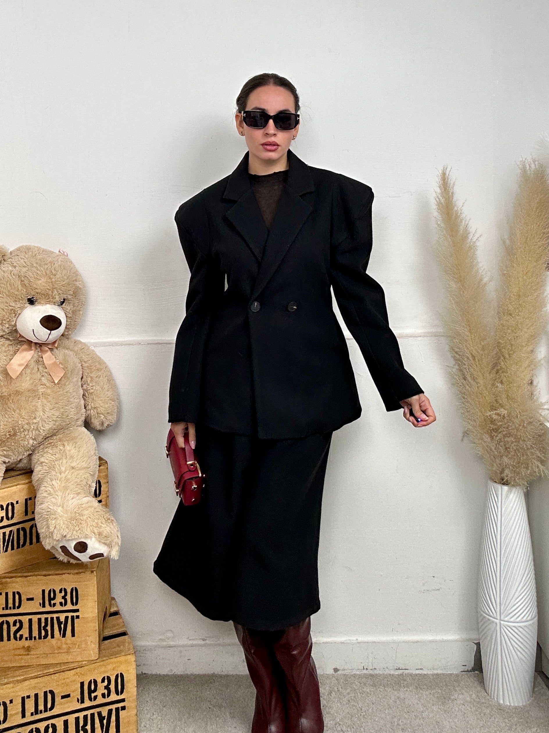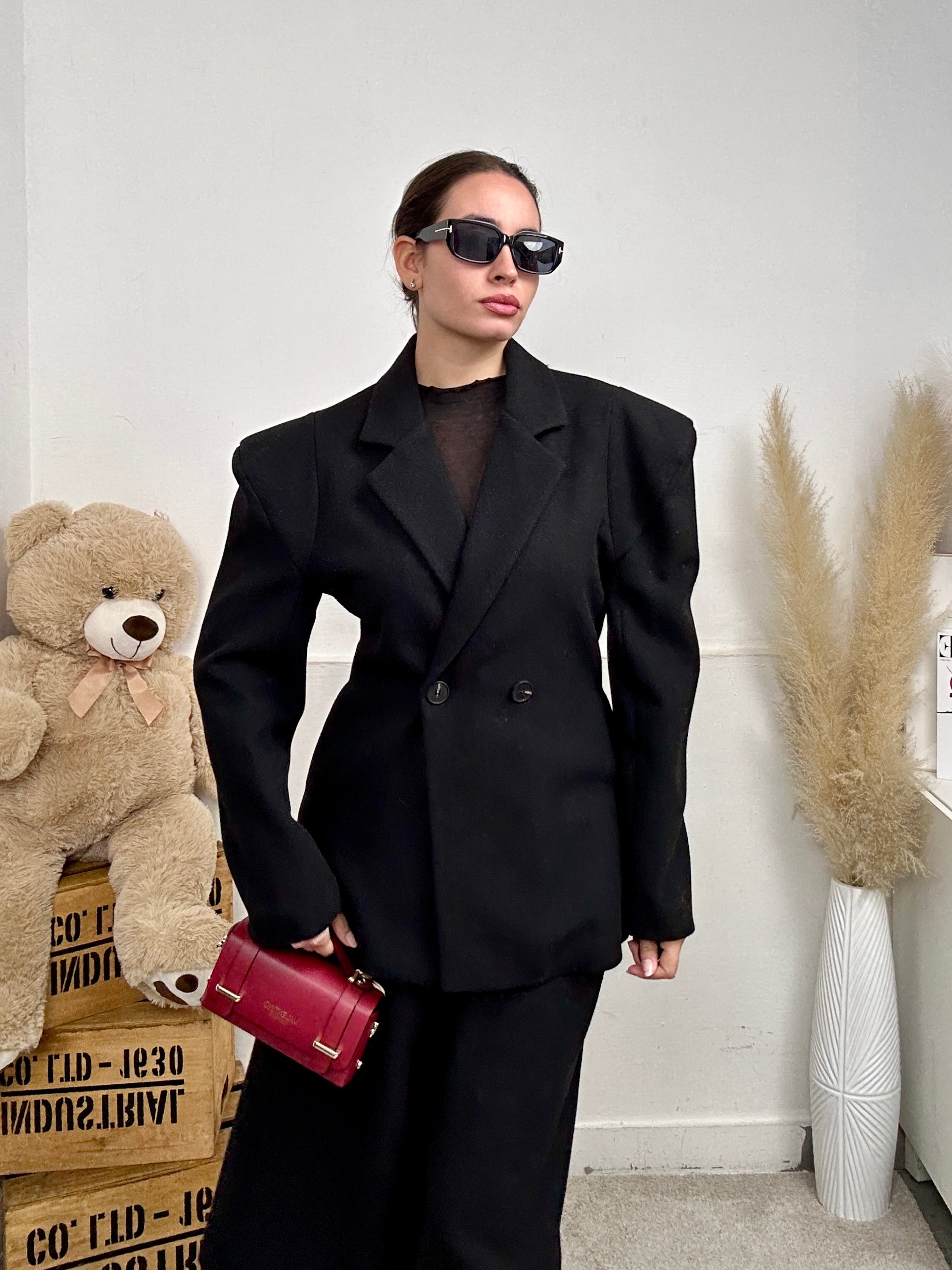 Coordinato SAM, presenta giacca lunga a maniche lunghe, con spalline imbottite, scollo a V, colletto e chiusura con bottoni frontali, e bermuda ampio, elasticizzato con molla dietro e con chiusura con bottone e zip.