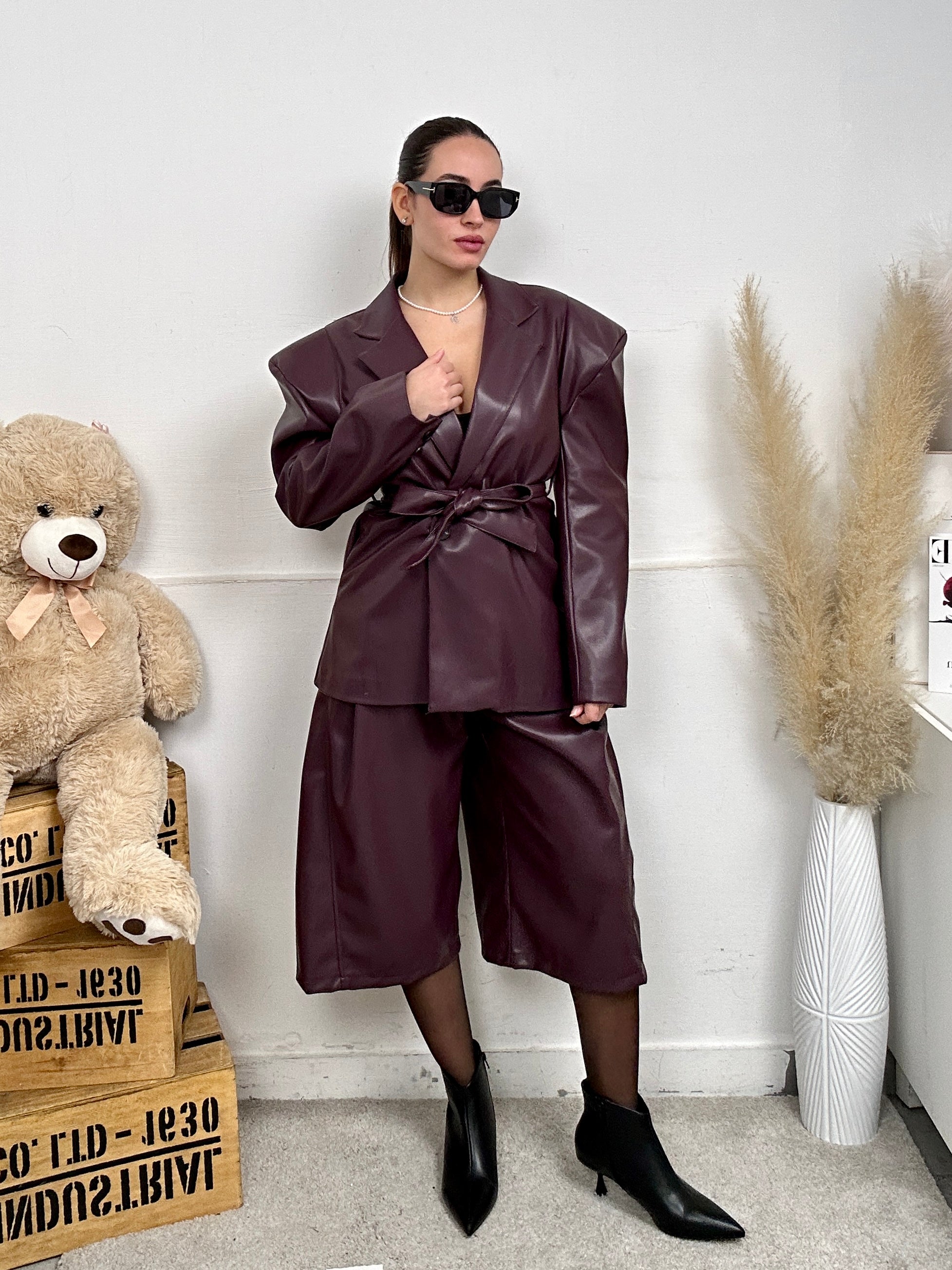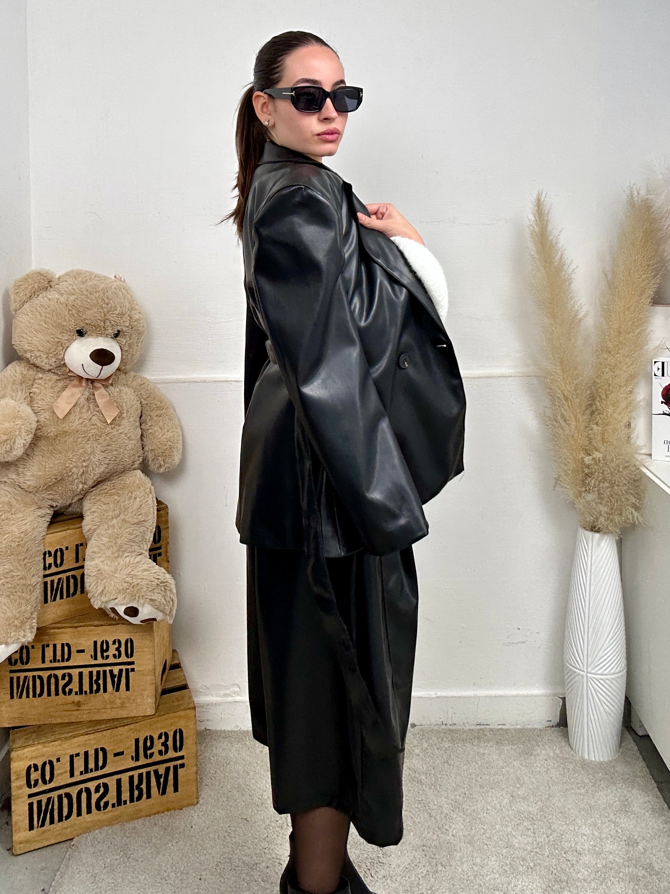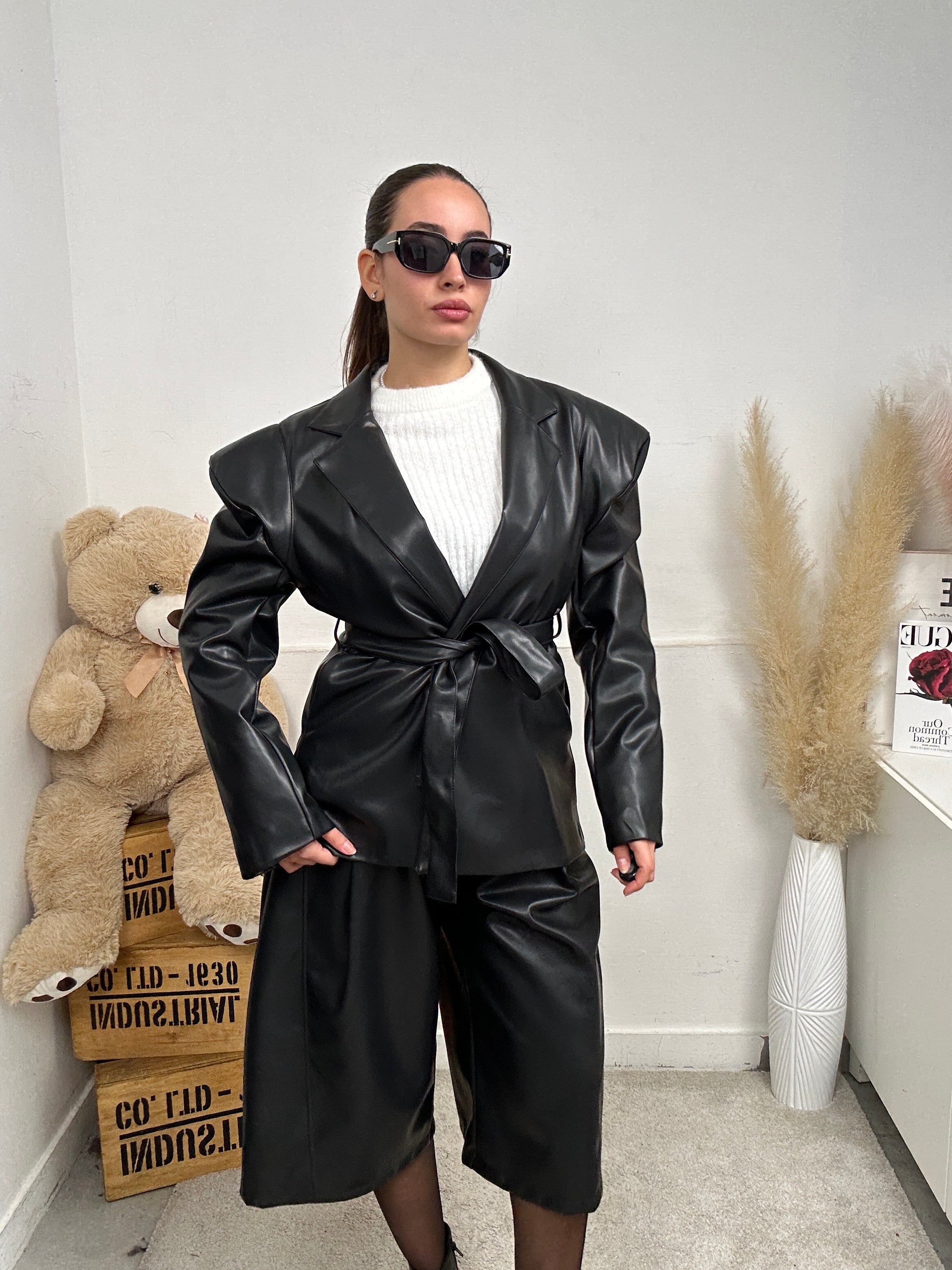 Coordinato in ecopelle, presenta giacca a maniche lunghe con colletto e scollo a V, imbottitura sulle spalle, fodera all'interno, con chiusura con bottone e cintura e bermuda con tasche laterali e chiusura con bottone con zip.