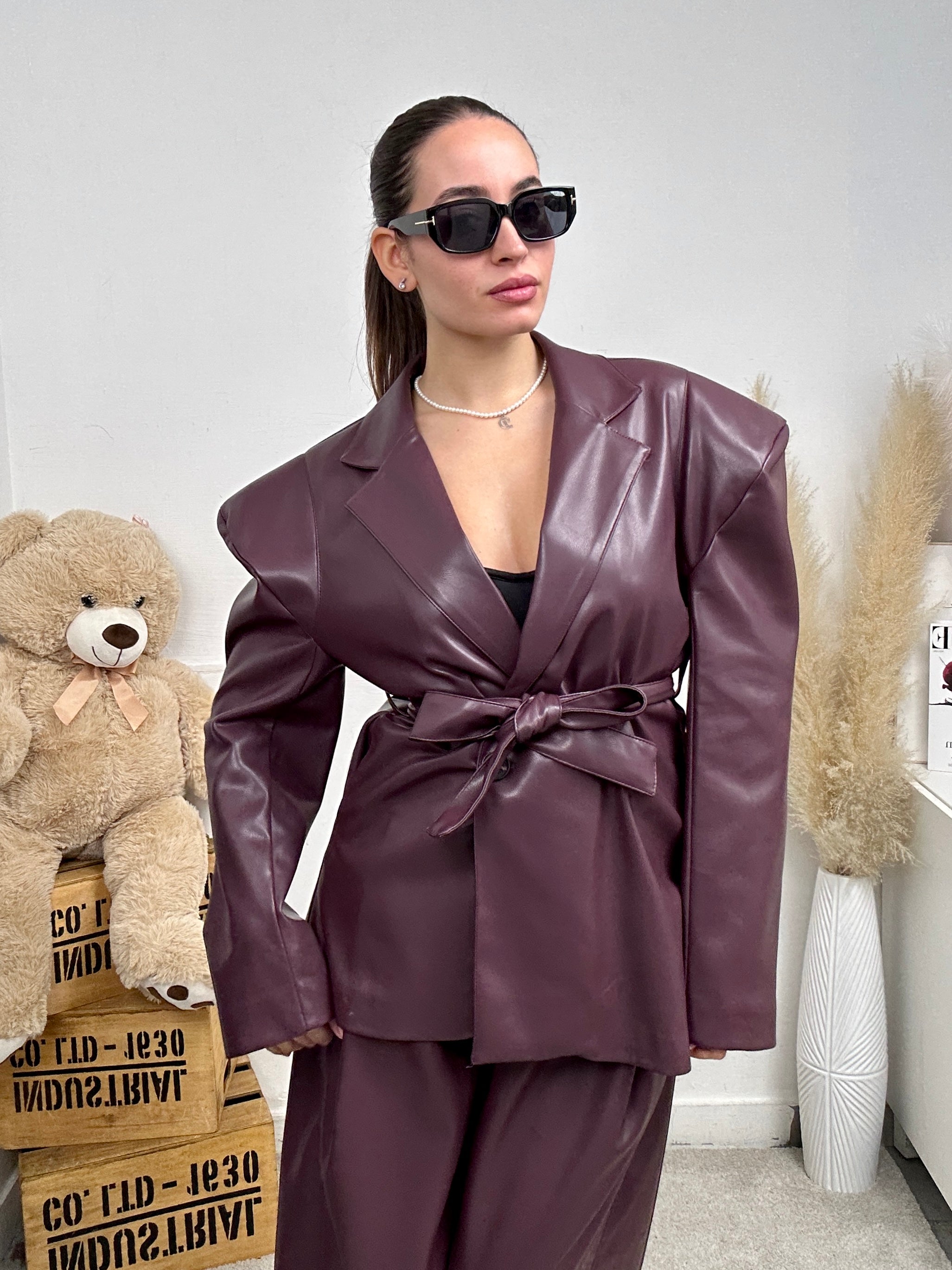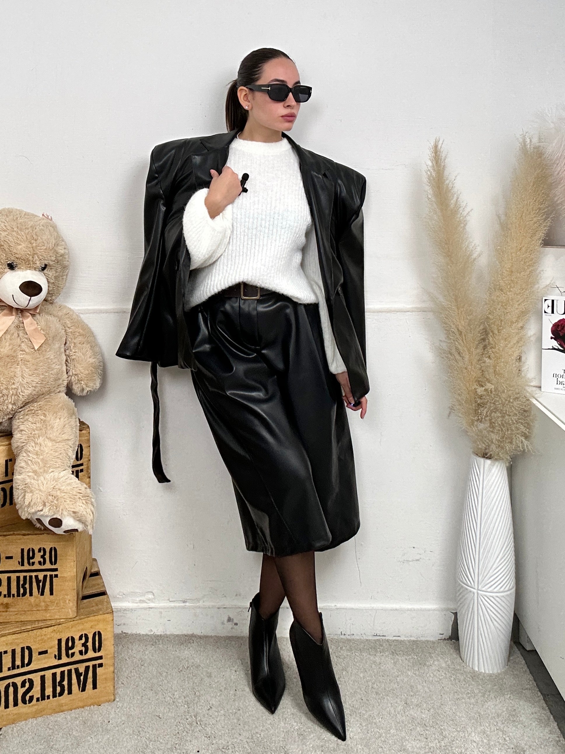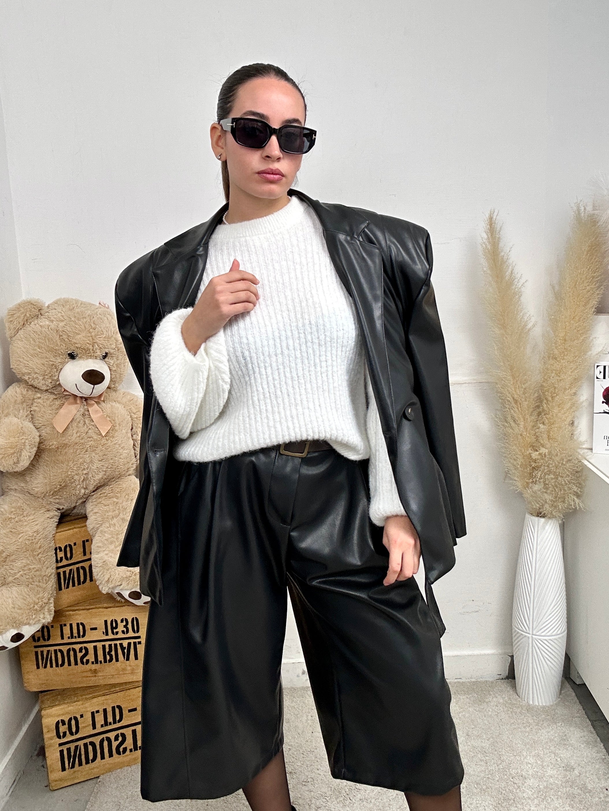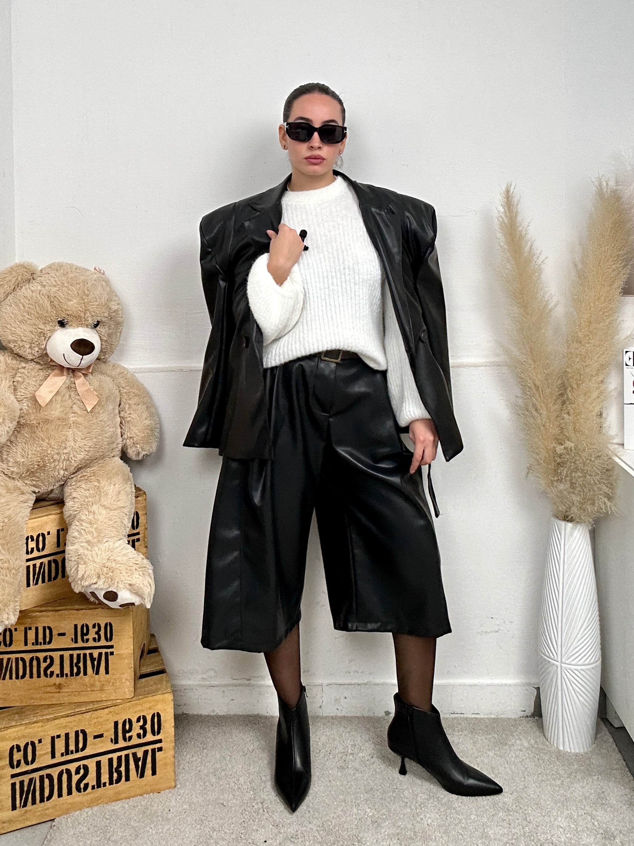Coordinato in ecopelle, presenta giacca a maniche lunghe con colletto e scollo a V, imbottitura sulle spalle, fodera all'interno, con chiusura con bottone e cintura e bermuda con tasche laterali e chiusura con bottone con zip.