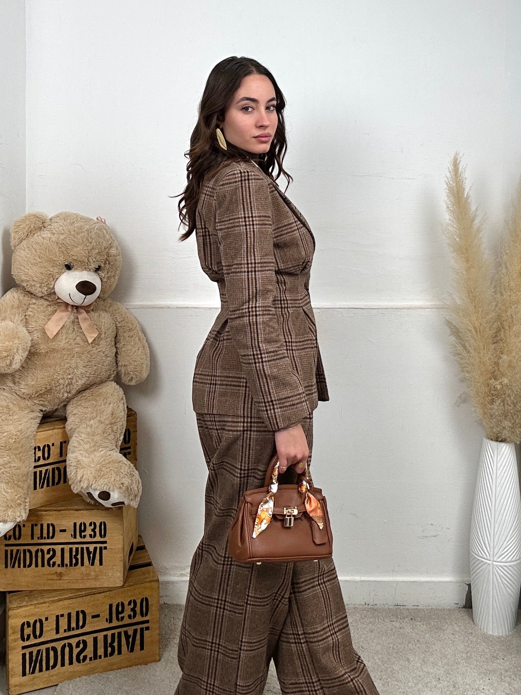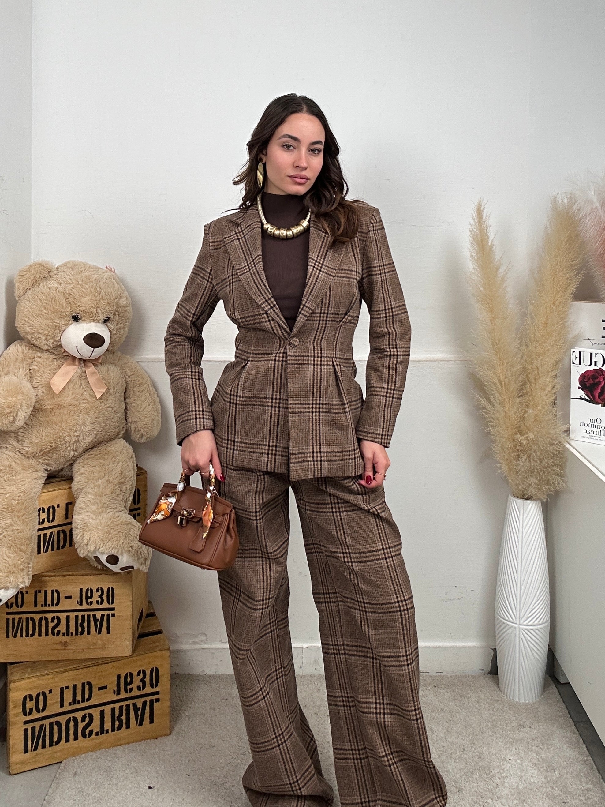 Coordinato SCOZZESE, presenta pantalone a palazzo con chiusura con bottone e zip, giacca a maniche lunghe con imbottitura sulle spalle, scollo a V e colletto, chiusura con bottone frontale.