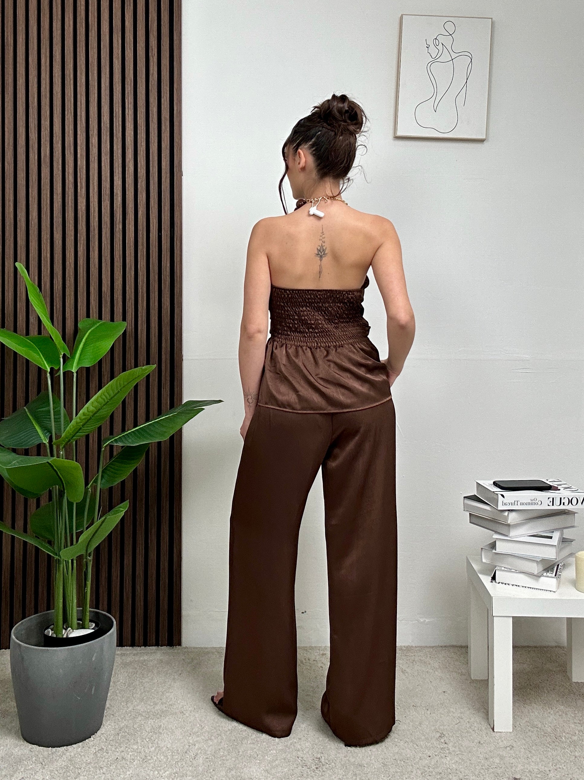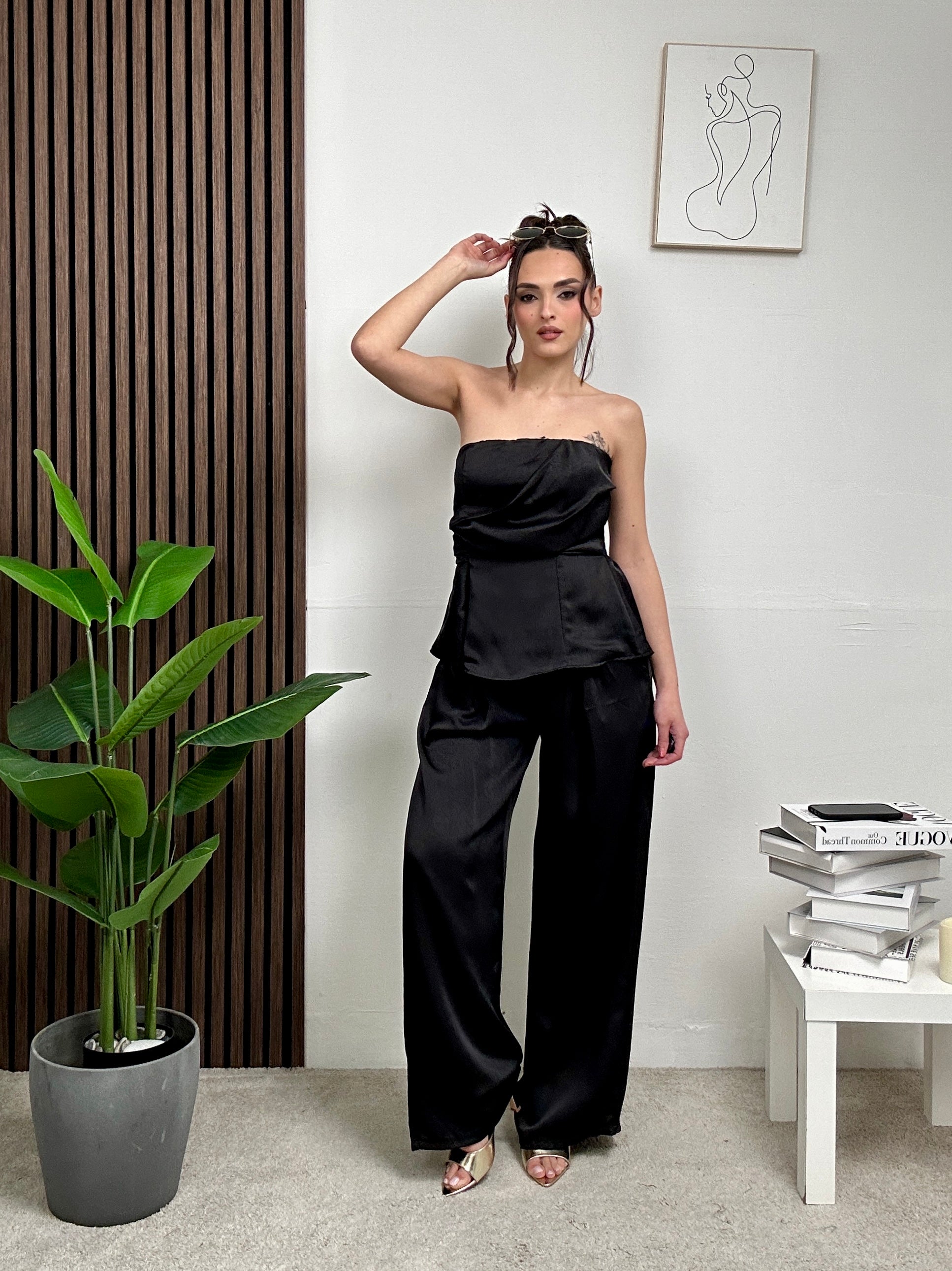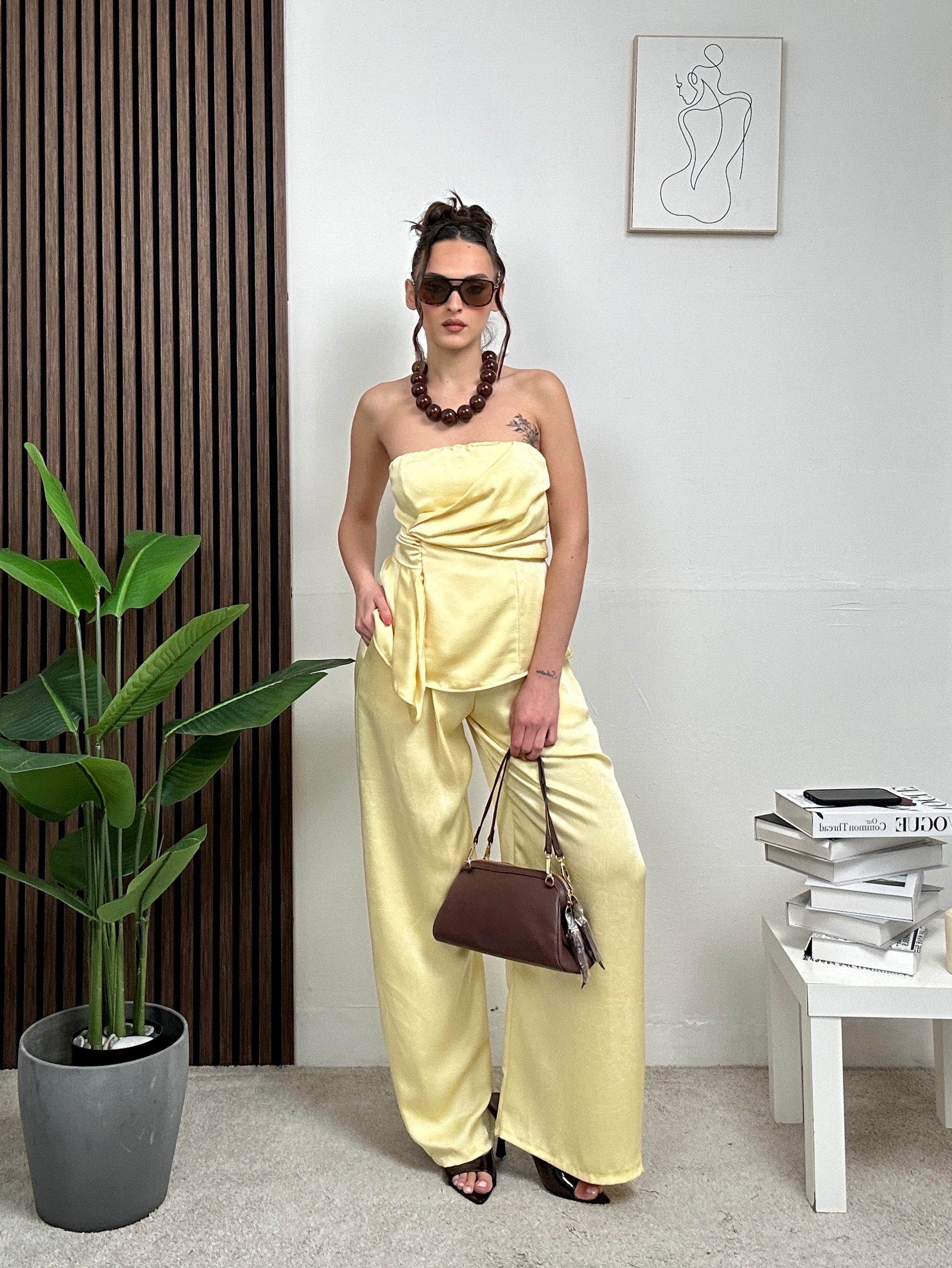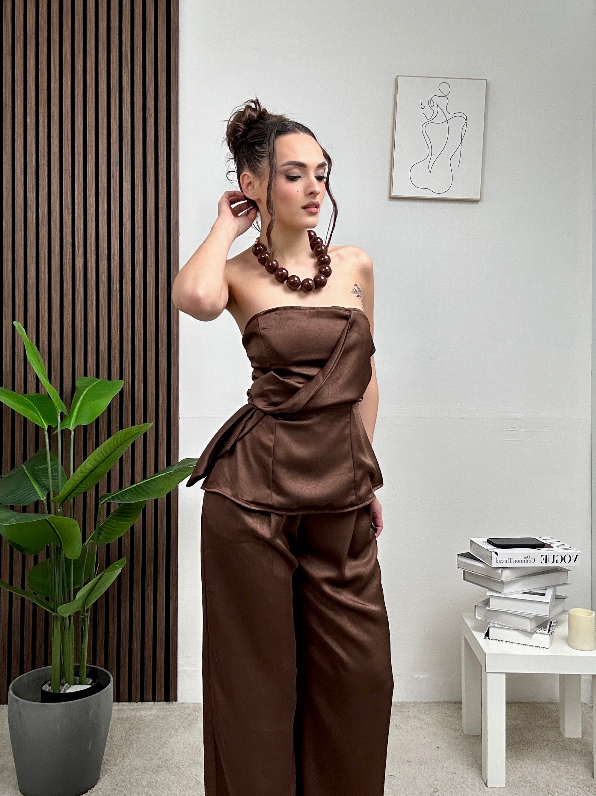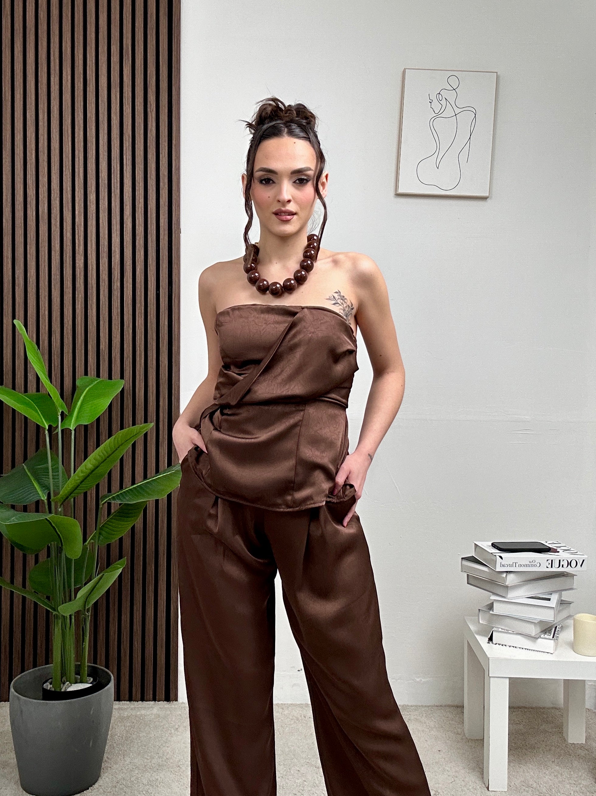 Coordinato in raso, presenta pantalone lungo con tasche laterali, chiusura con bottone e zip e maglia con scollo a fascia e dettaglio particolare frontalmente e molla dietro.