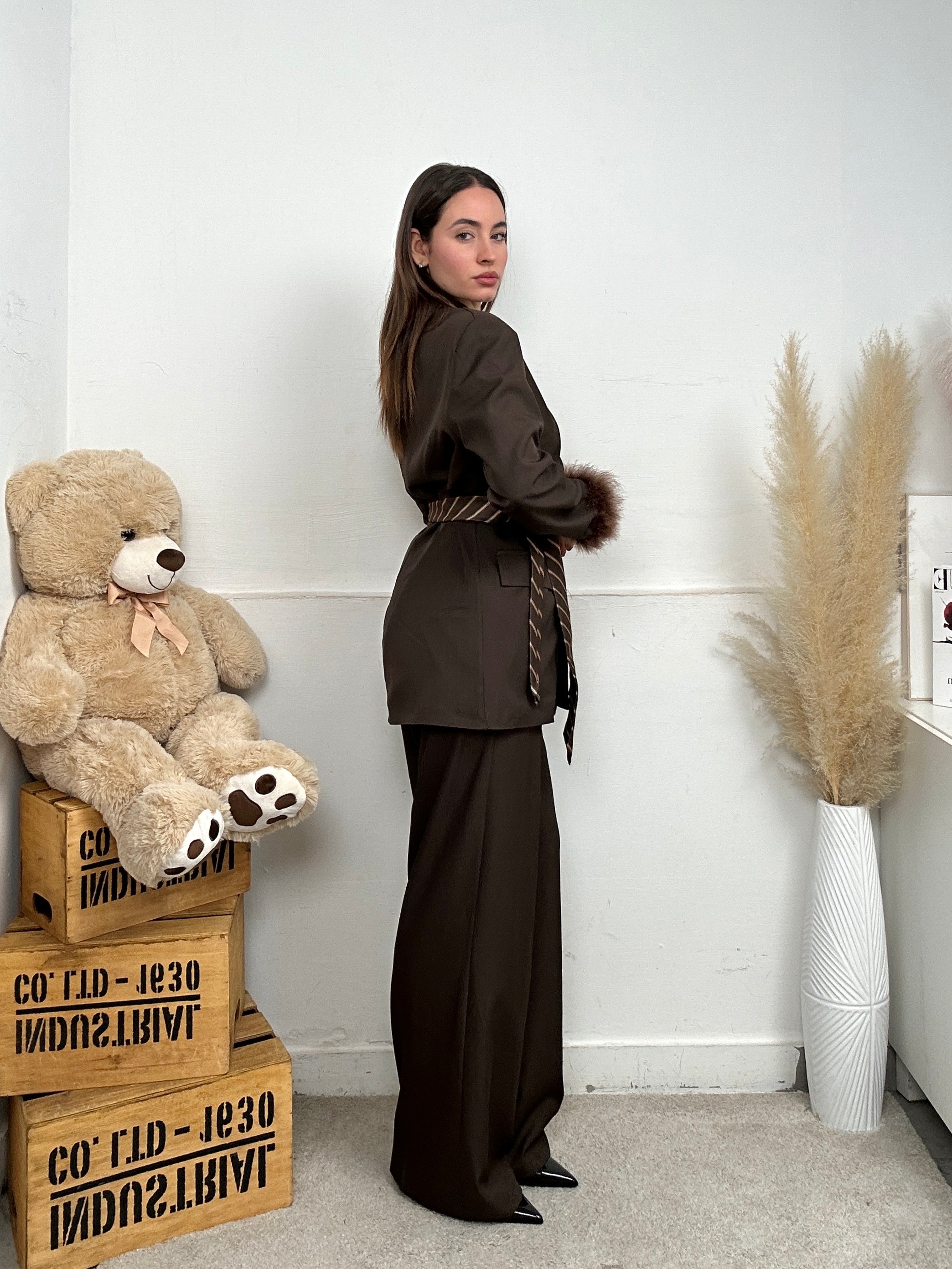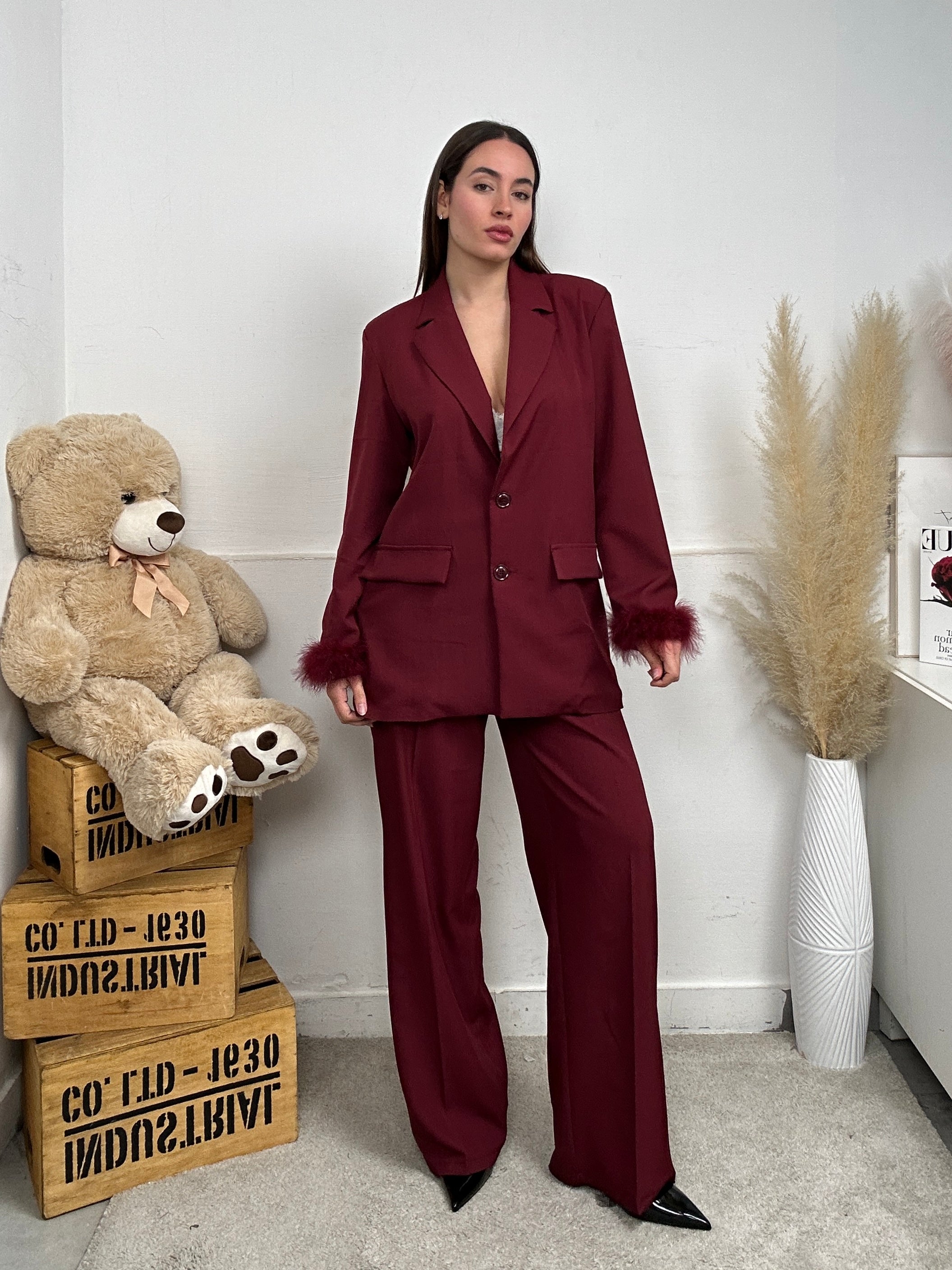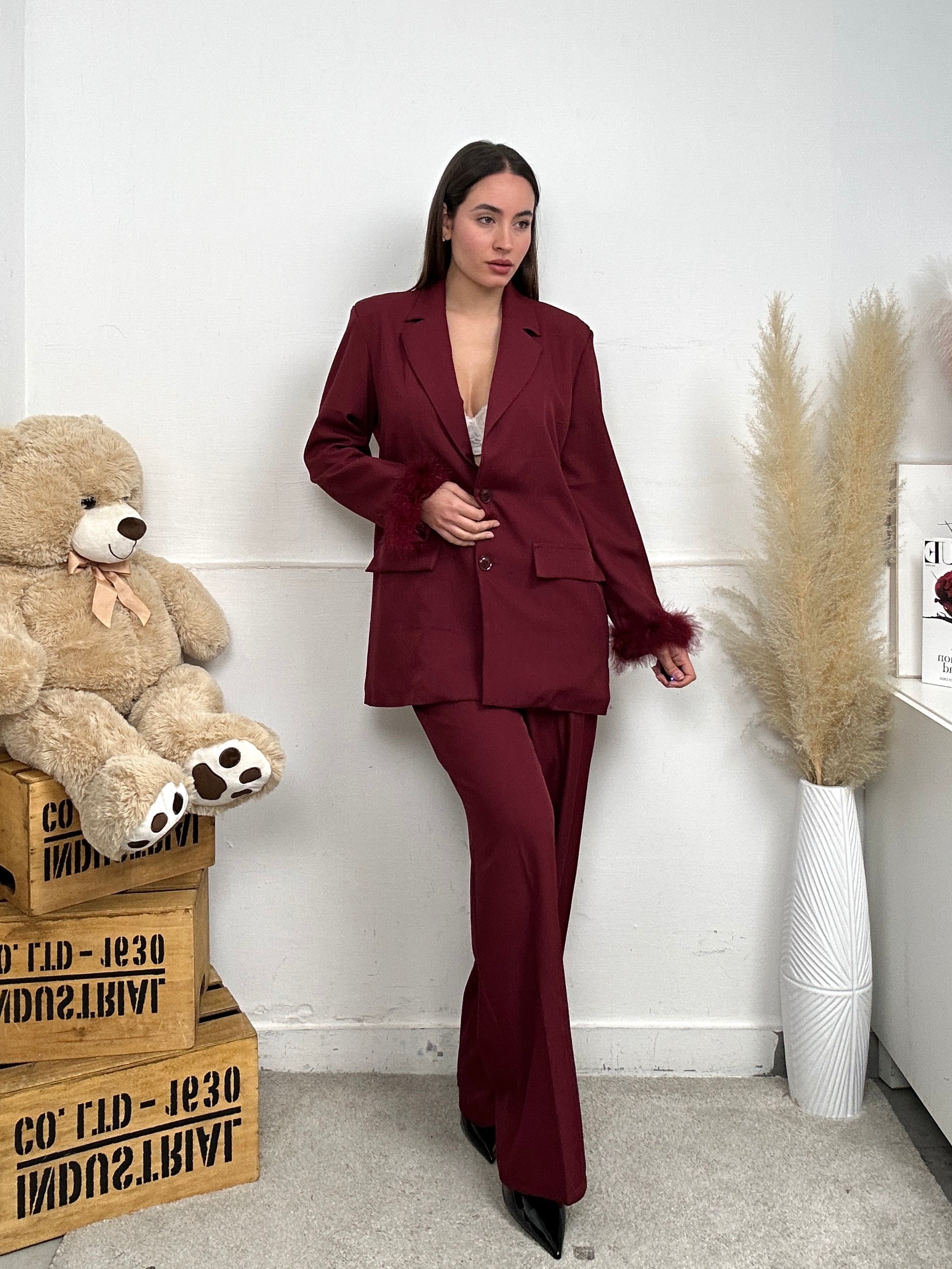 Coordinato PLUS, presenta giacca a maniche lunghe con piume sull'orlo finale, tasche finte frontali, scollo a V e colletto, chiusura con bottone frontale, spalline imbottite, pantalone a palazzo, chiusura con bottone e zip frontale.