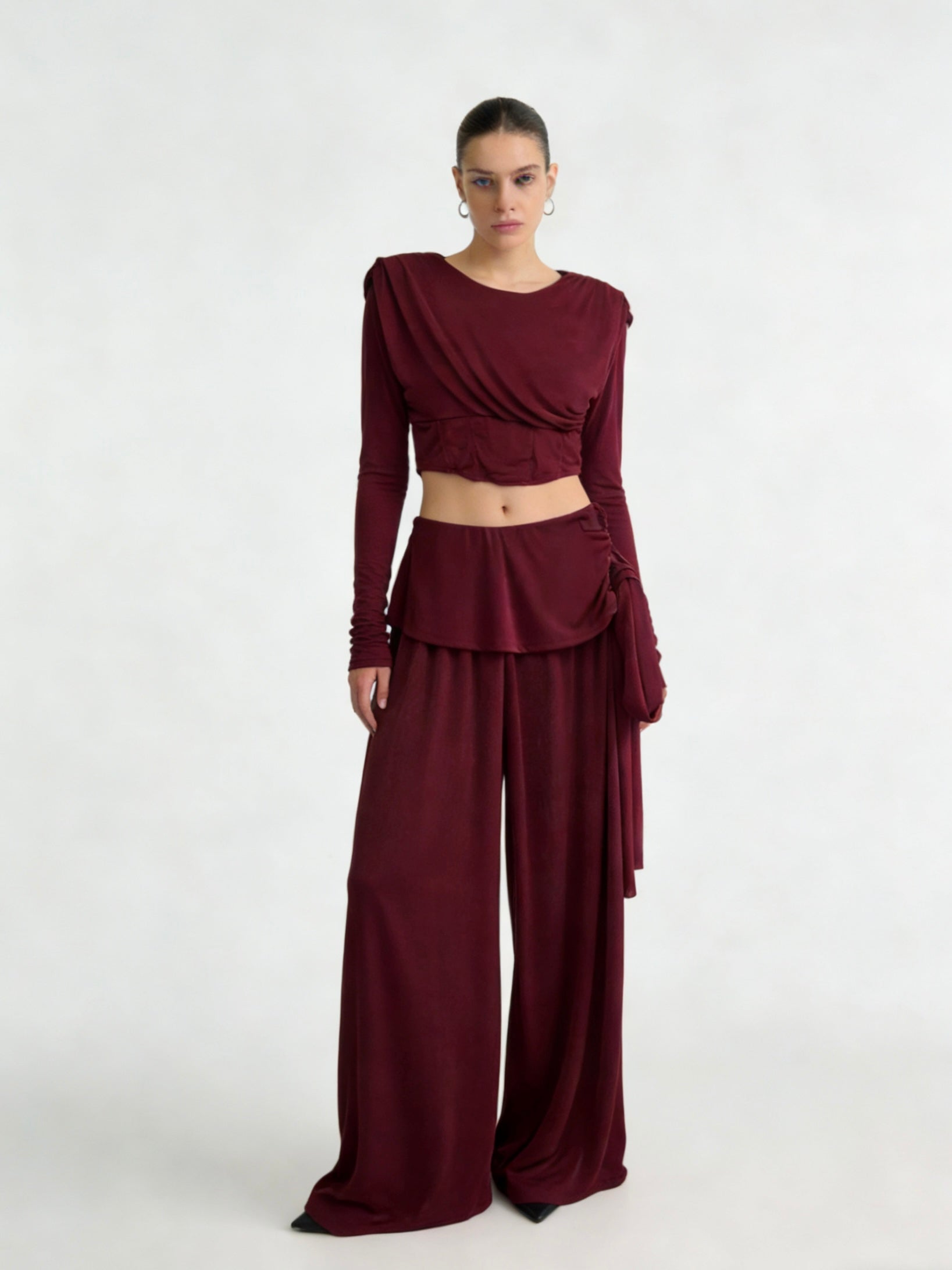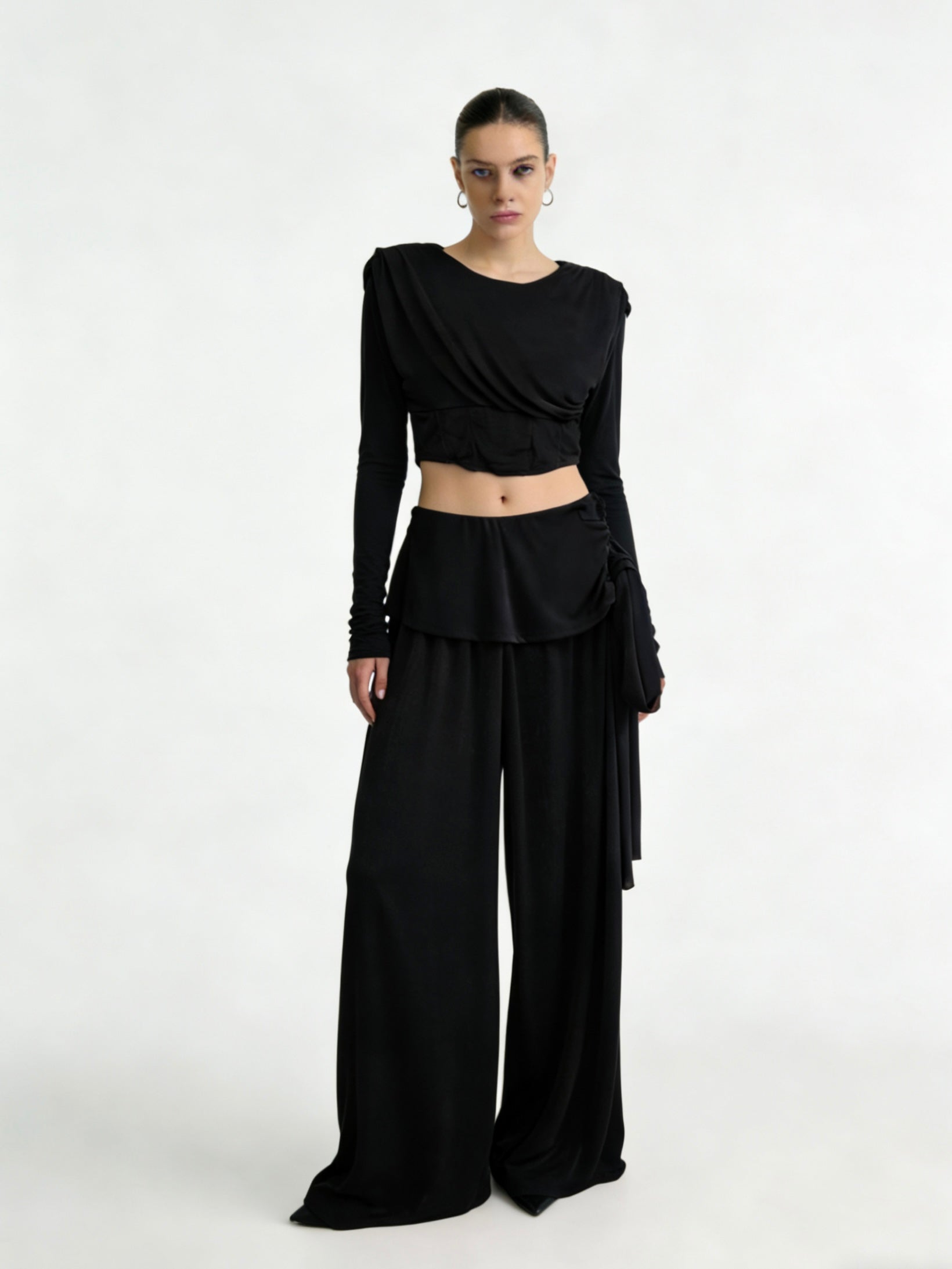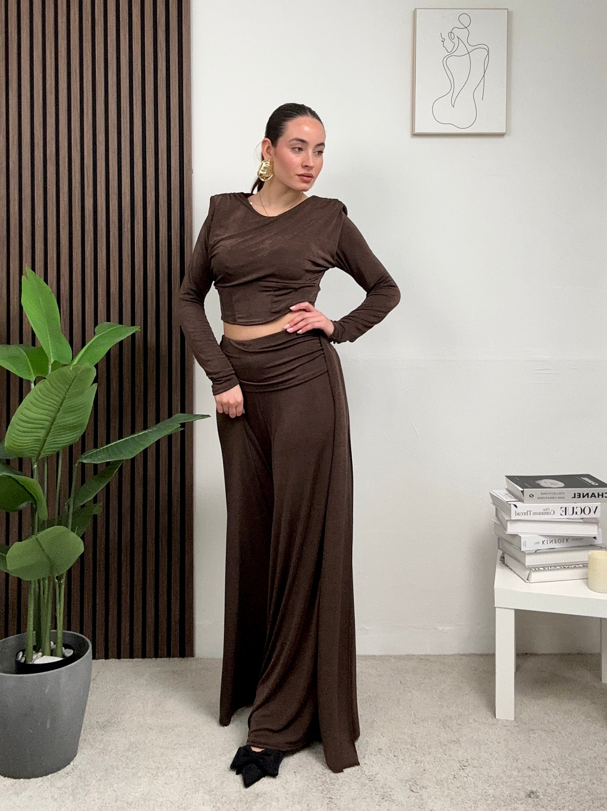 Coordinato AURY, presenta il pantalone a palazzo, molto elasticizzato perché ha la molla in vita e maglia corta sopra a maniche lunghe con spalline imbottite.