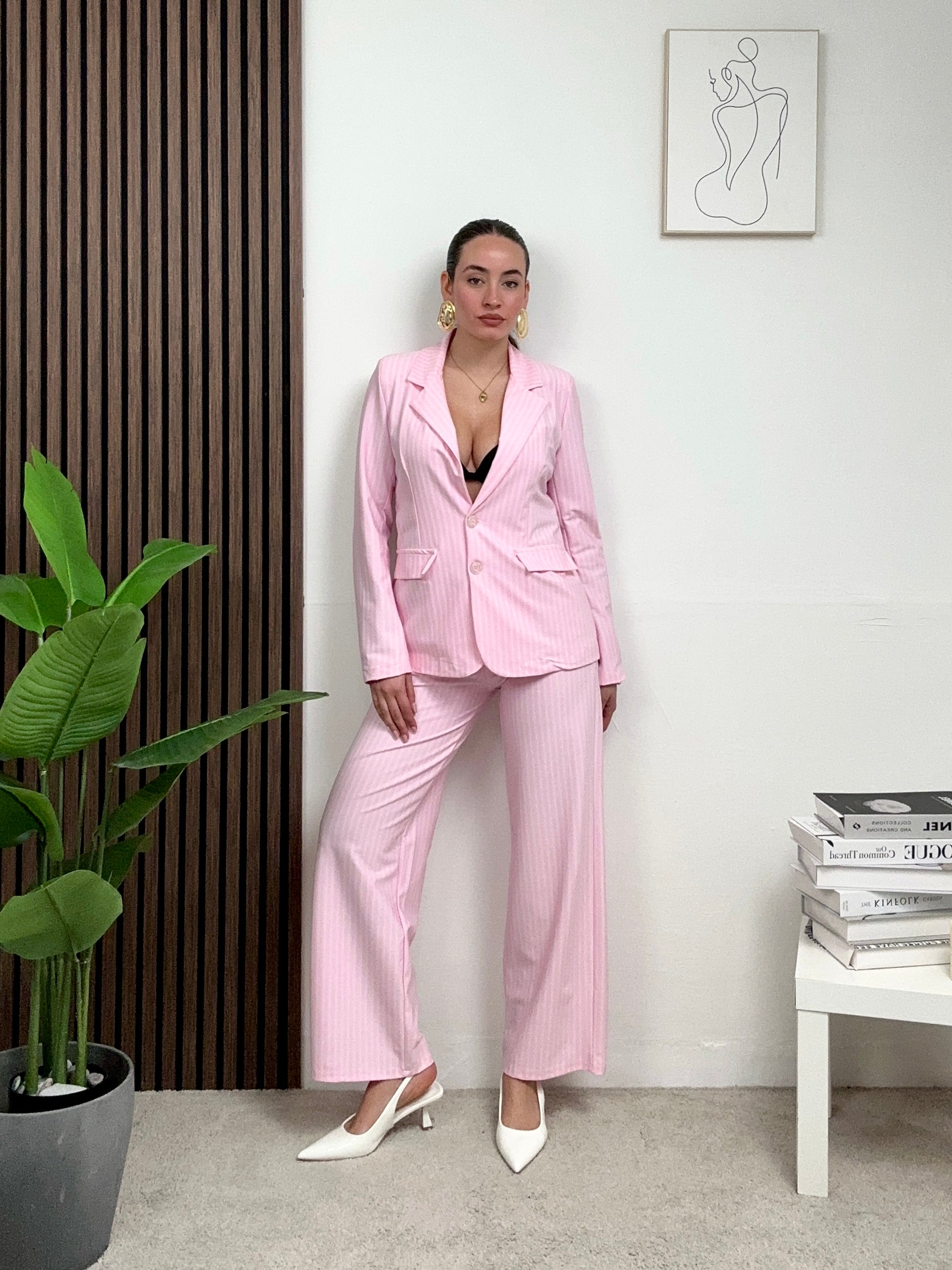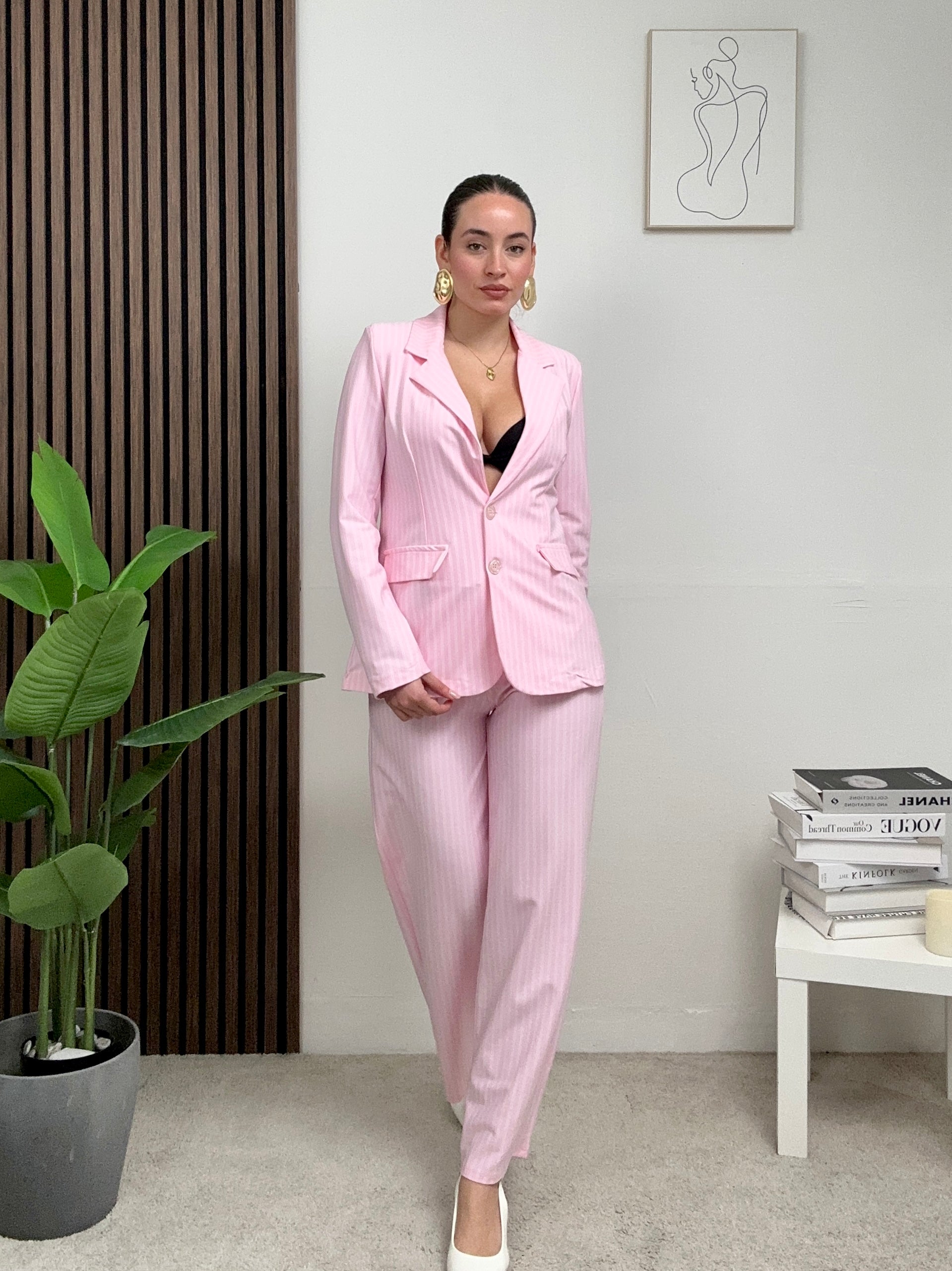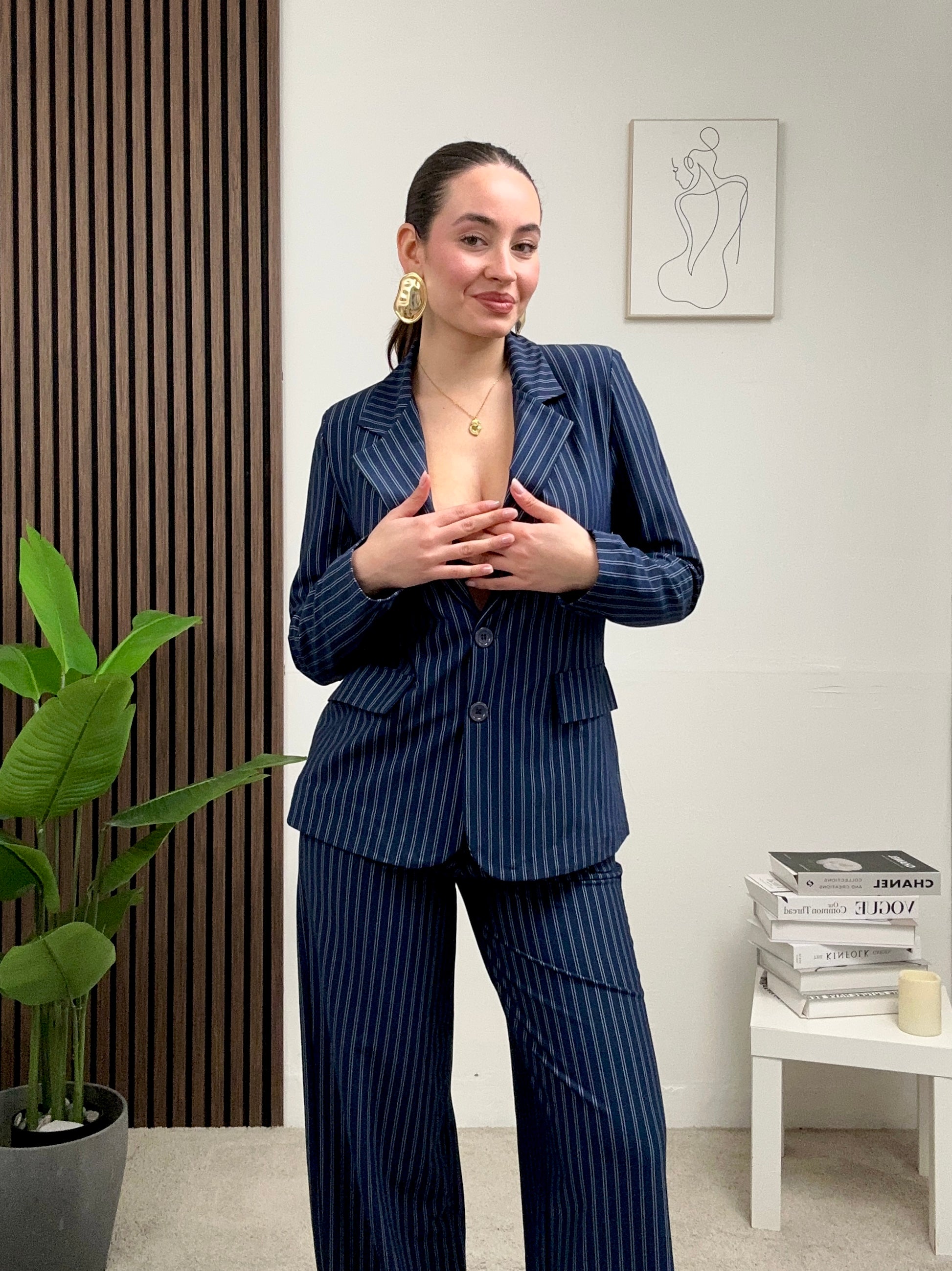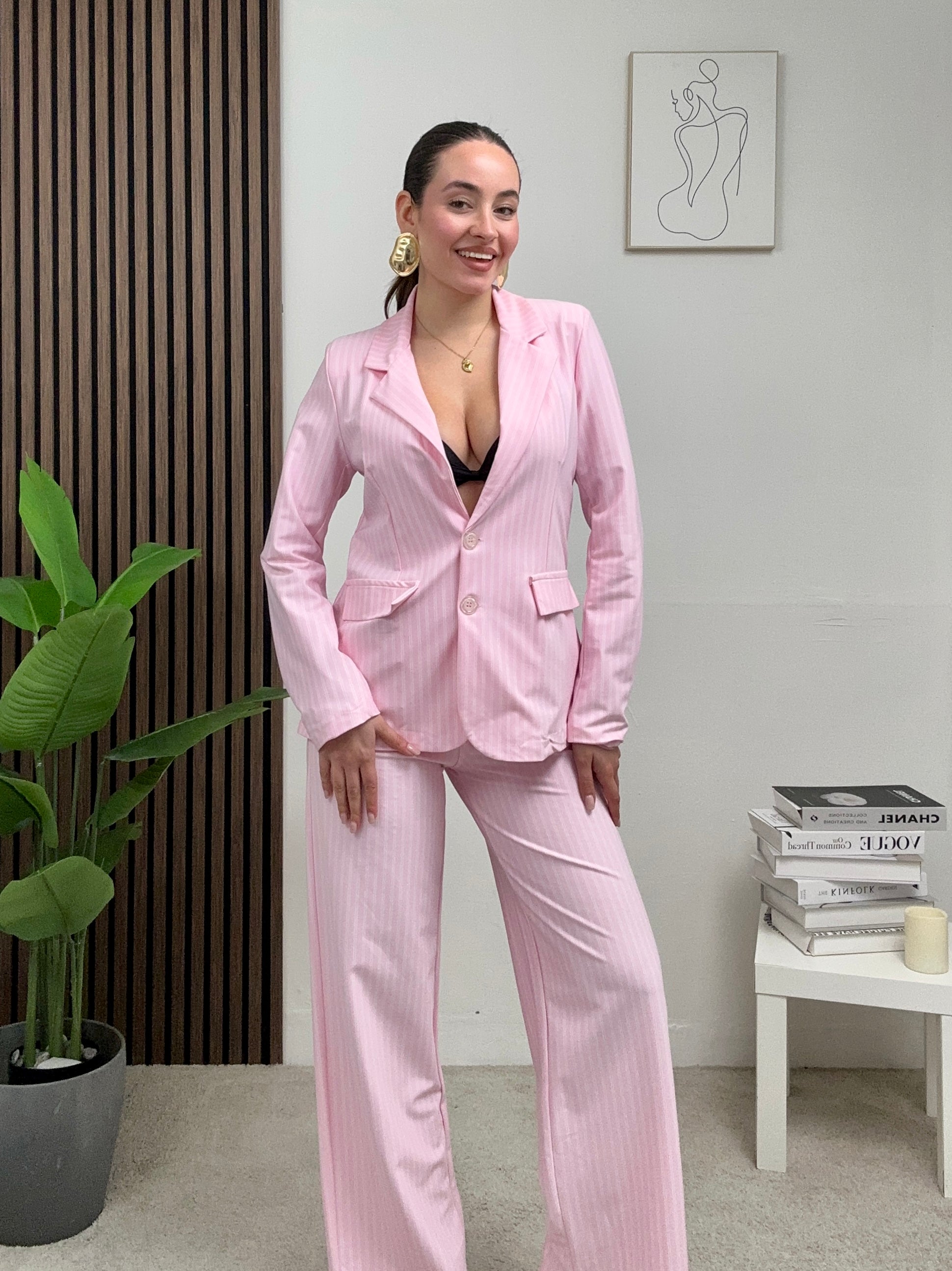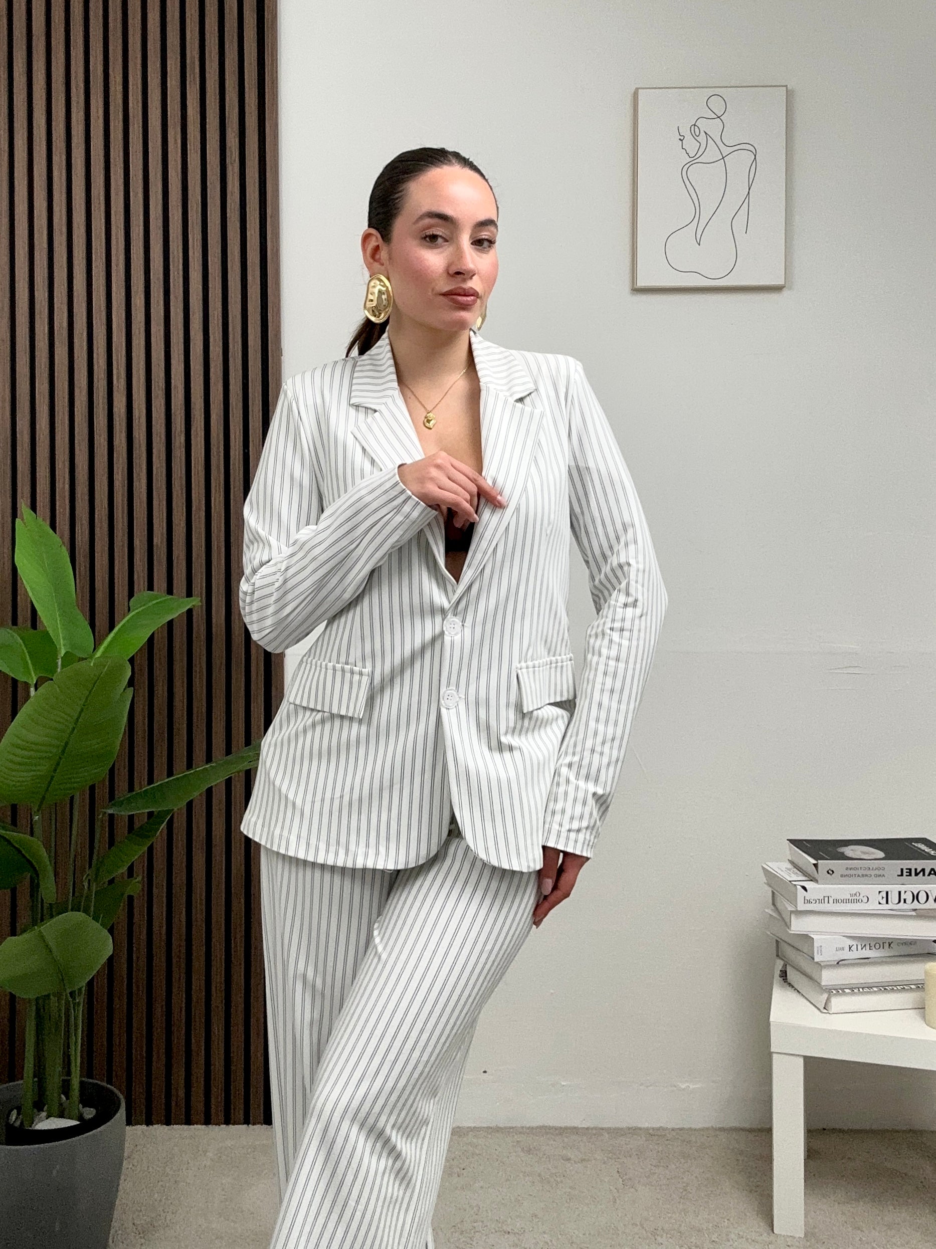 Coordinato GESSATO, presenta pantalone a palazzo con molla in vita e chiusura con bottone e zip frontale 3 giacca a righe lunga a maniche lunghe con colletto e scollo a V, fodera all’interno, spalline imbottite e chiusura con bottoni frontali.
