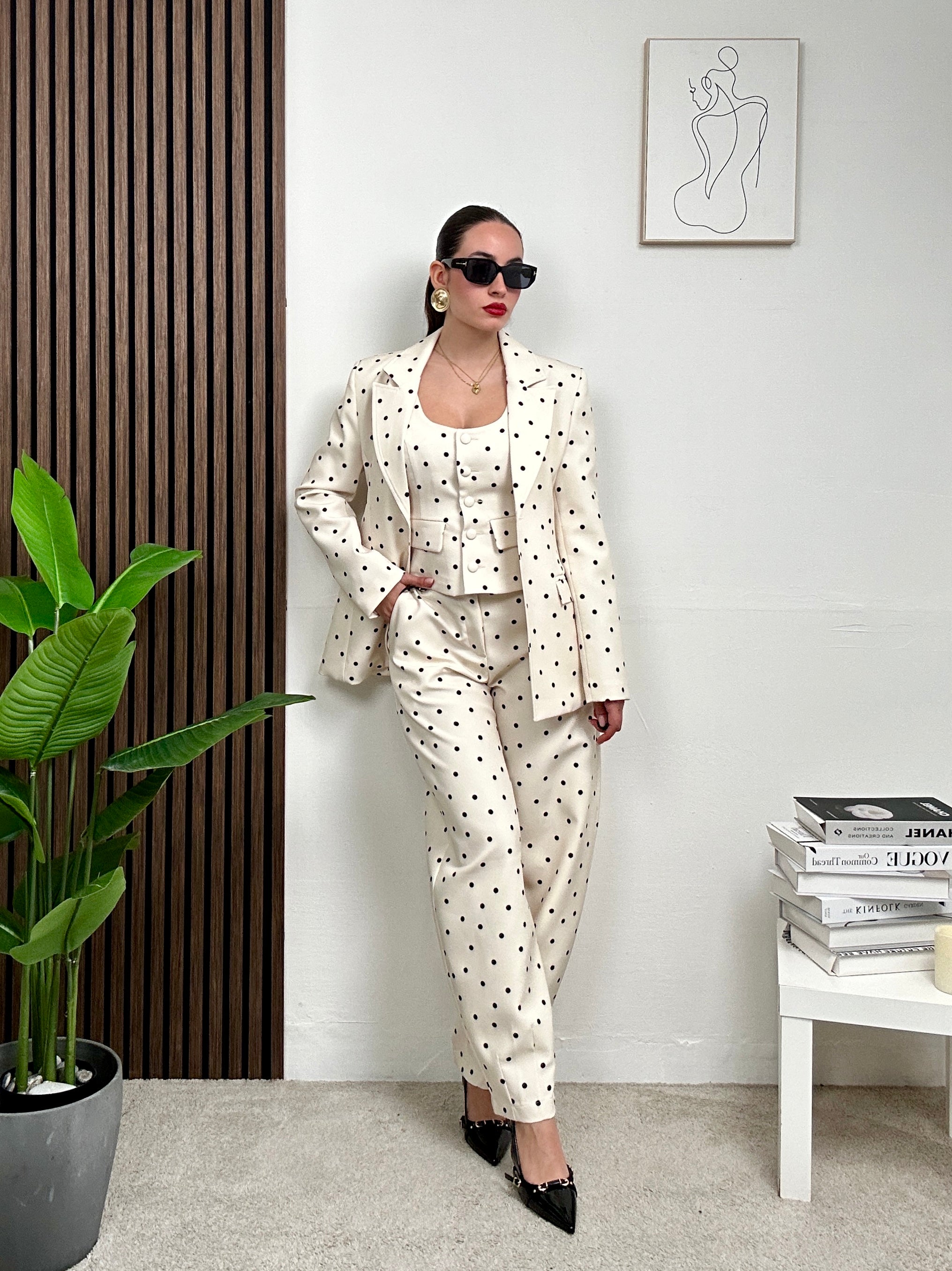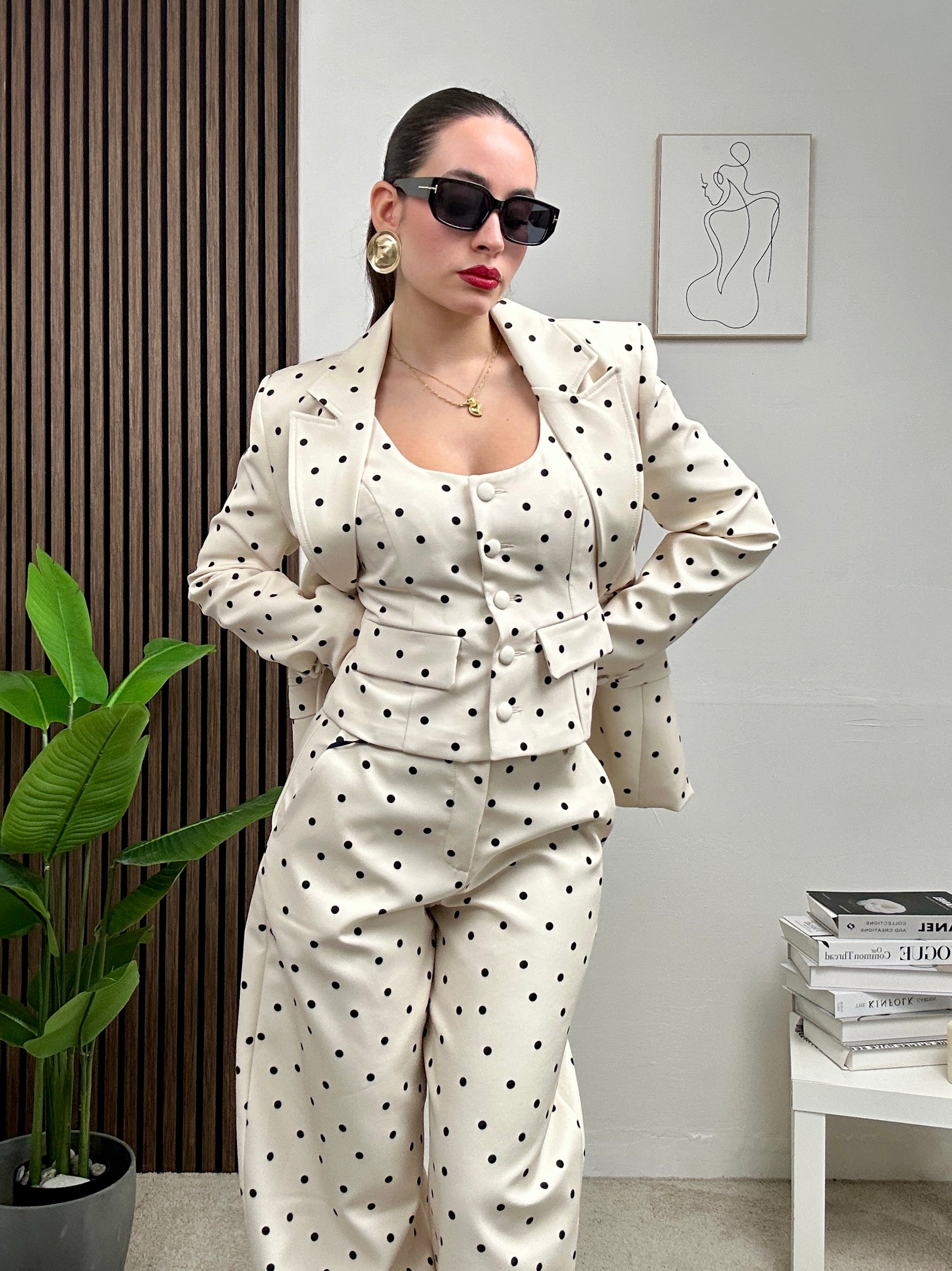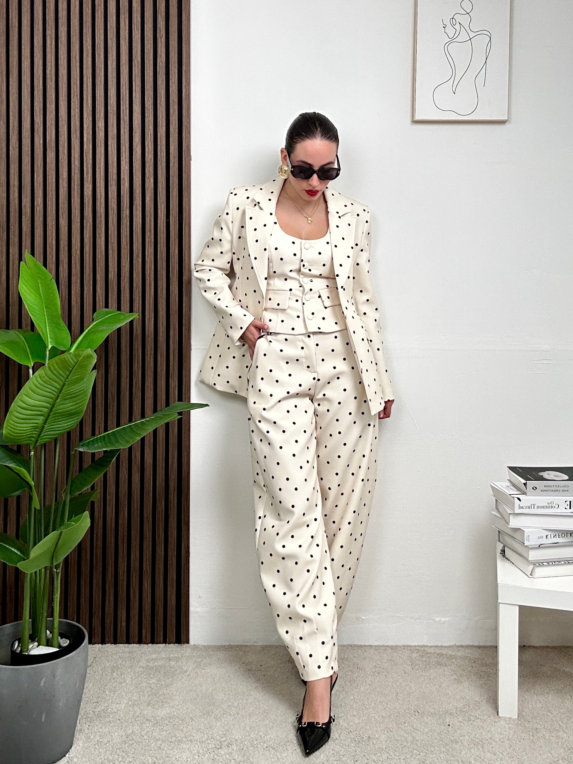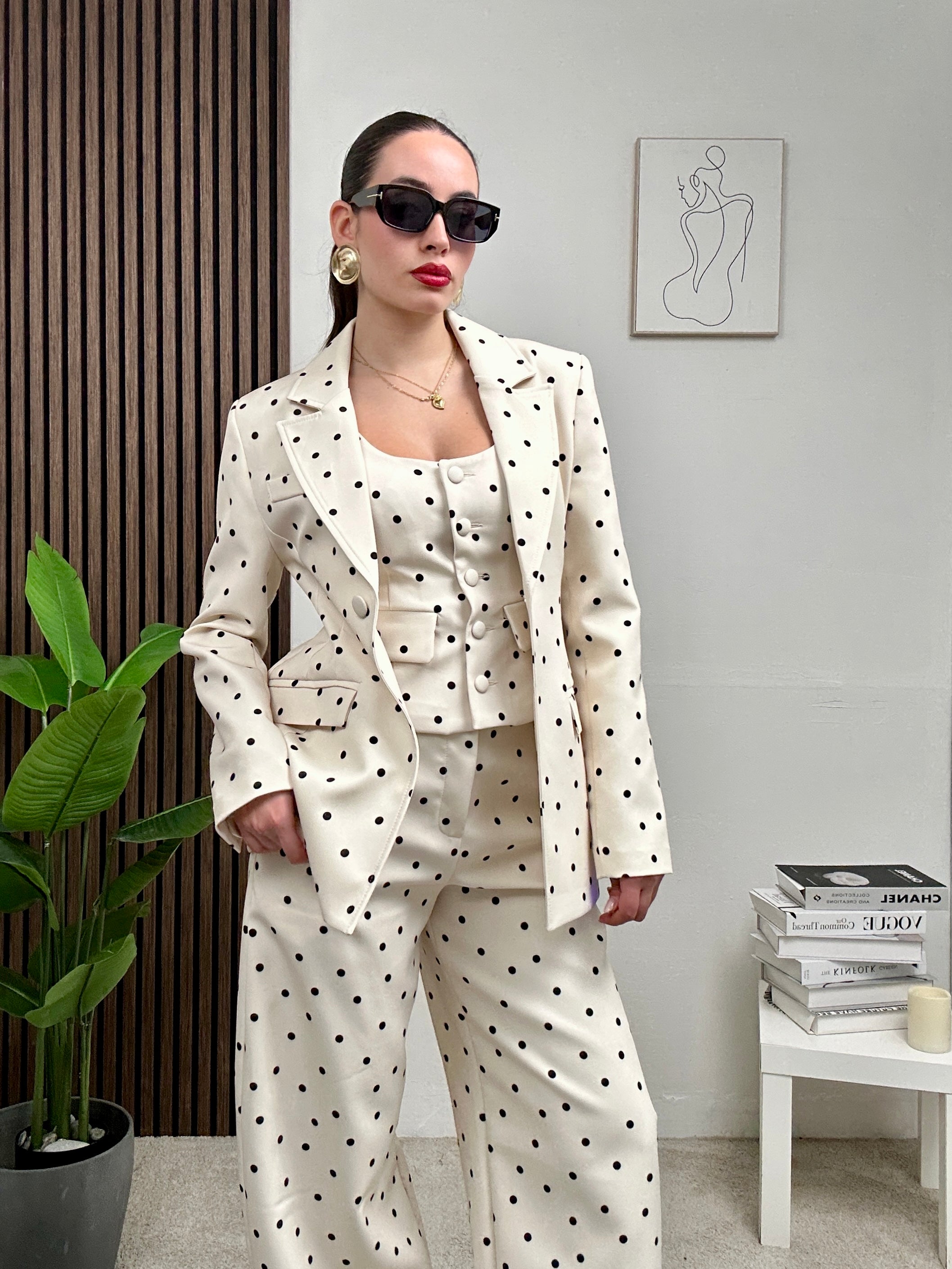 Coordinato a POIS, presenta pantalone lungo balloon a pois con tasche frontali e chiusura con bottone e zip frontale, gilet a canotta con scollo rotondo e chiusura con bottoni frontali e giacca sopra lunga a maniche lunghe, spalline imbottite, scollo a V e colletto, fodera all’interno e chiusura con bottone frontale.