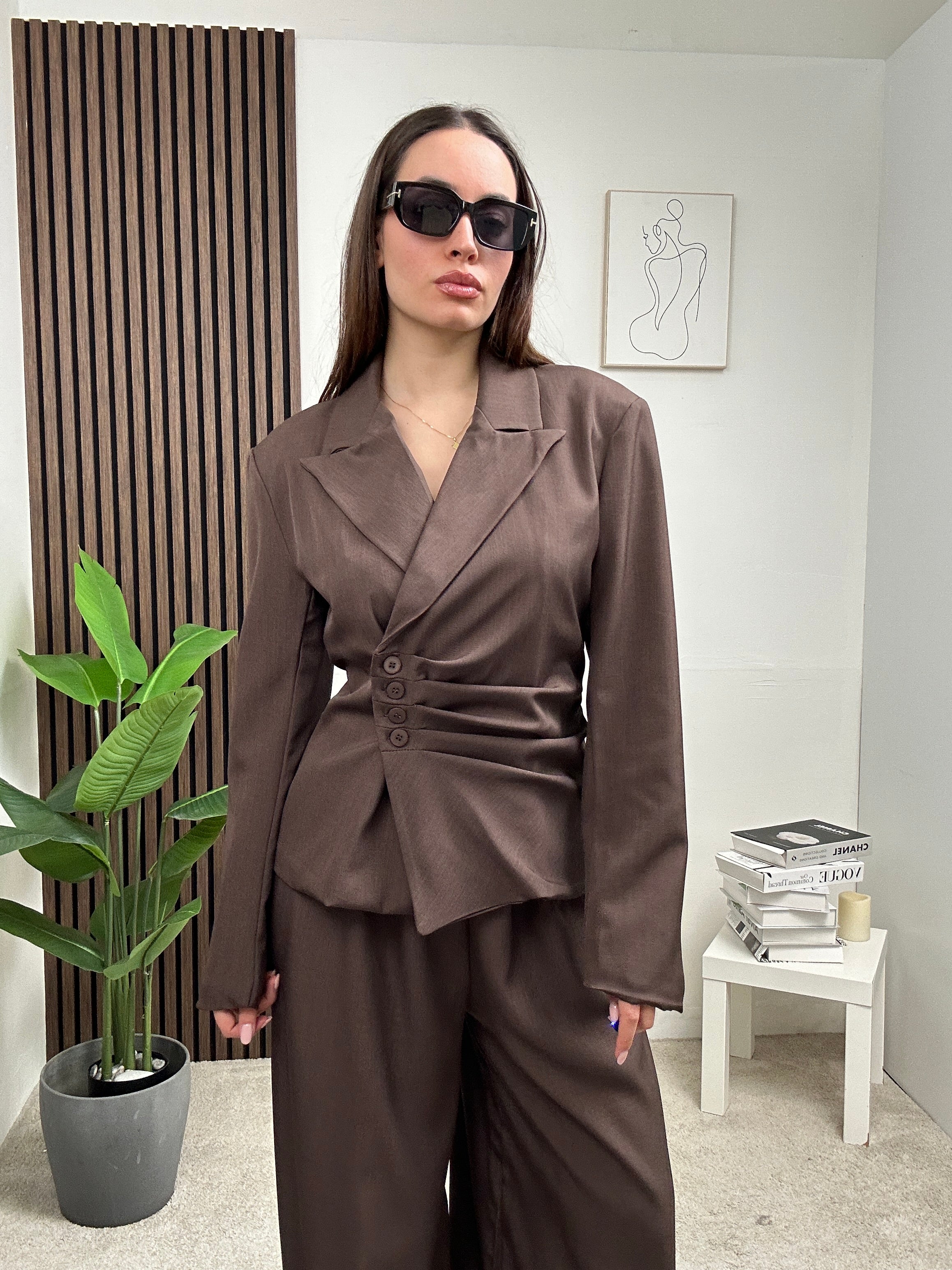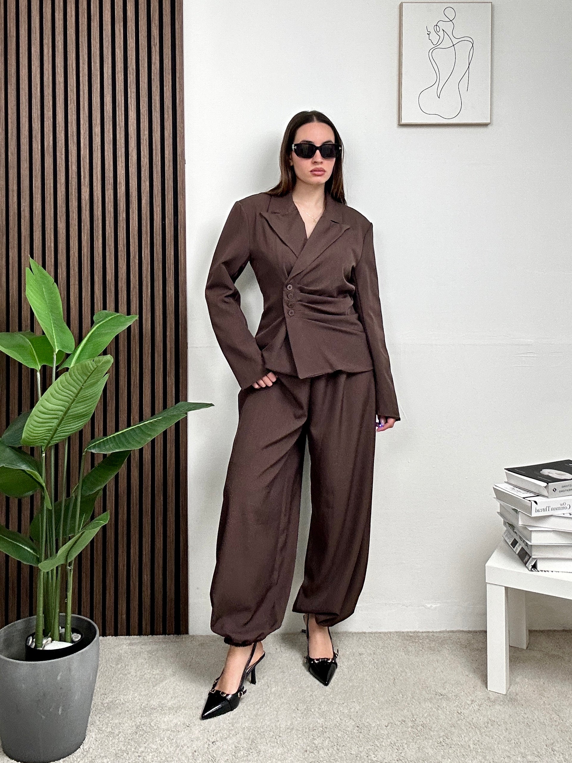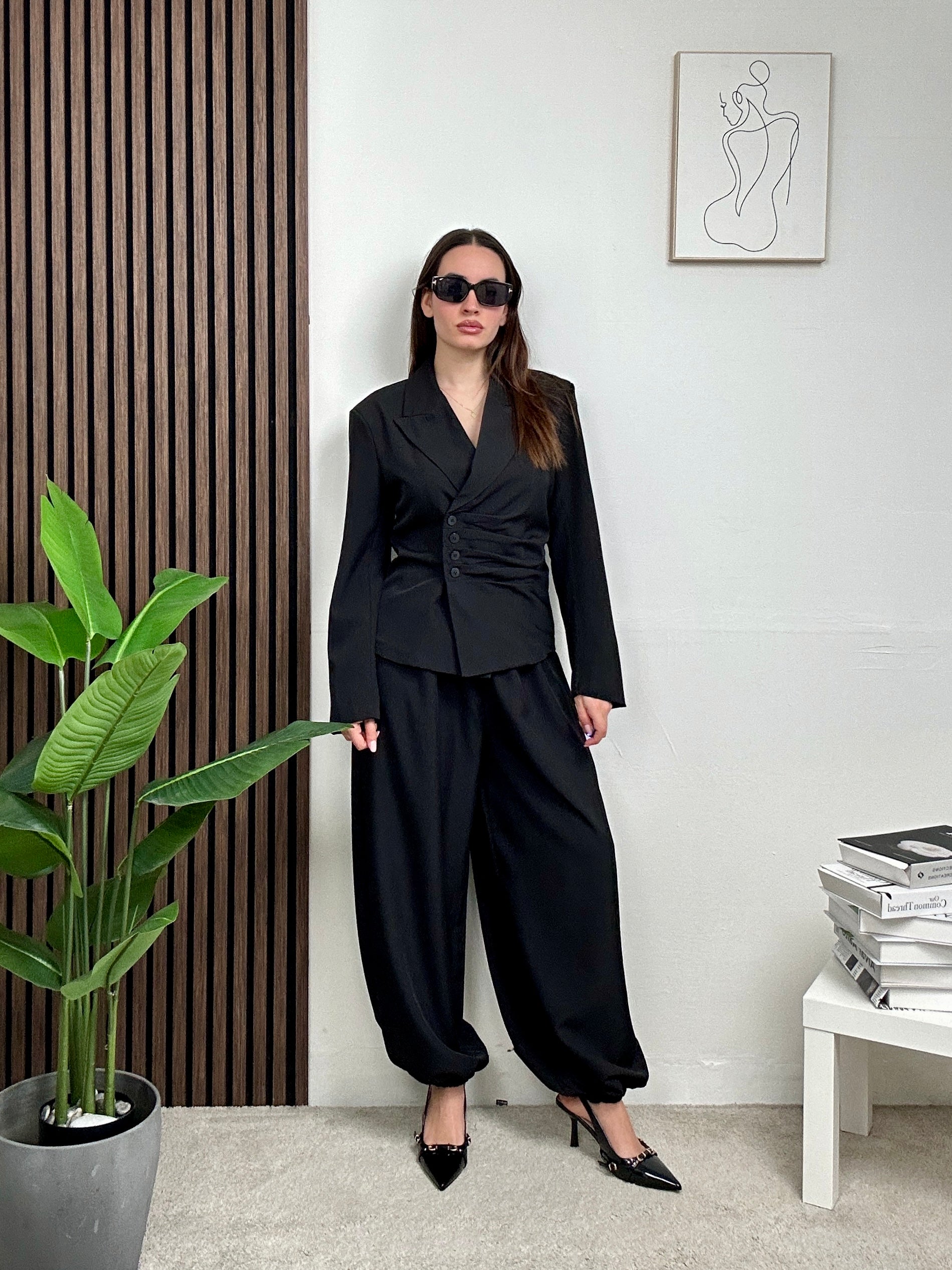 Completo composto da blazer strutturato con chiusura frontale e pantalone ampio a vita alta. Linee pulite e taglio sartoriale per un look sofisticato e contemporaneo. Perfetto per occasioni formali o outfit eleganti dal carattere deciso.
